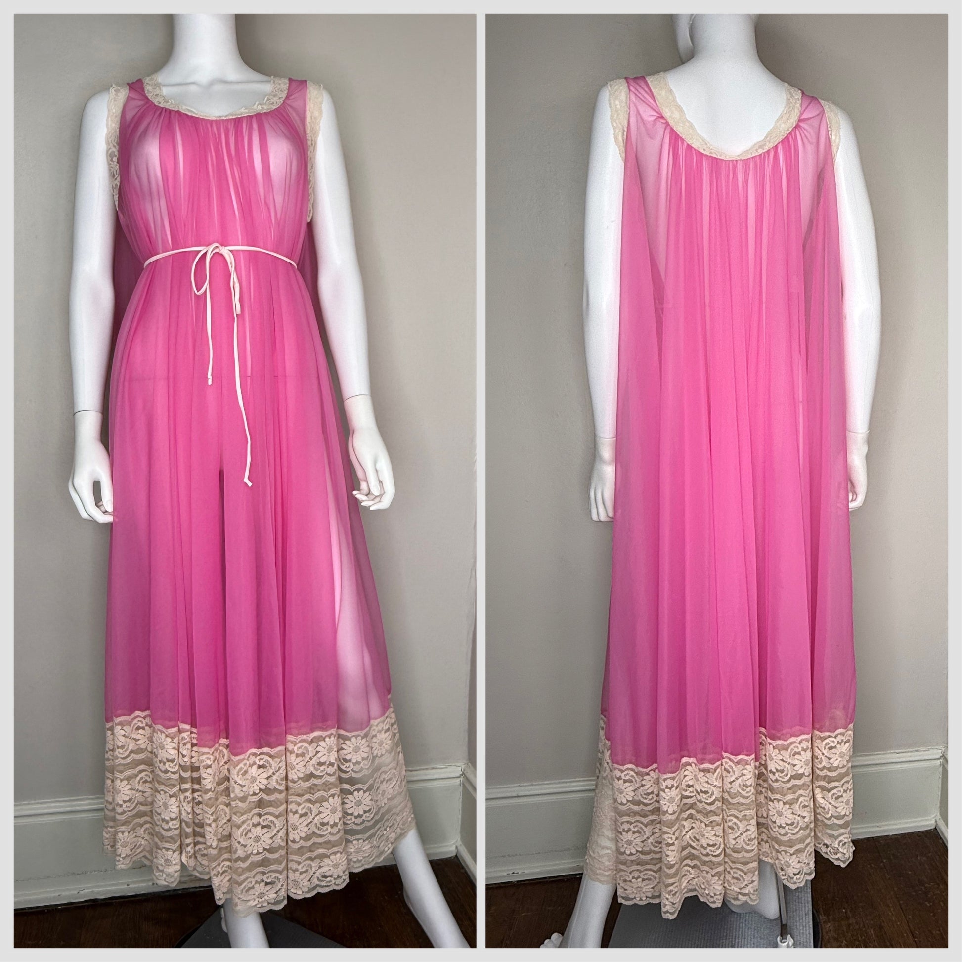 1960s Sheer Pink Nightgown, Miss Elaine, One Size, Huge Sweep Caftan