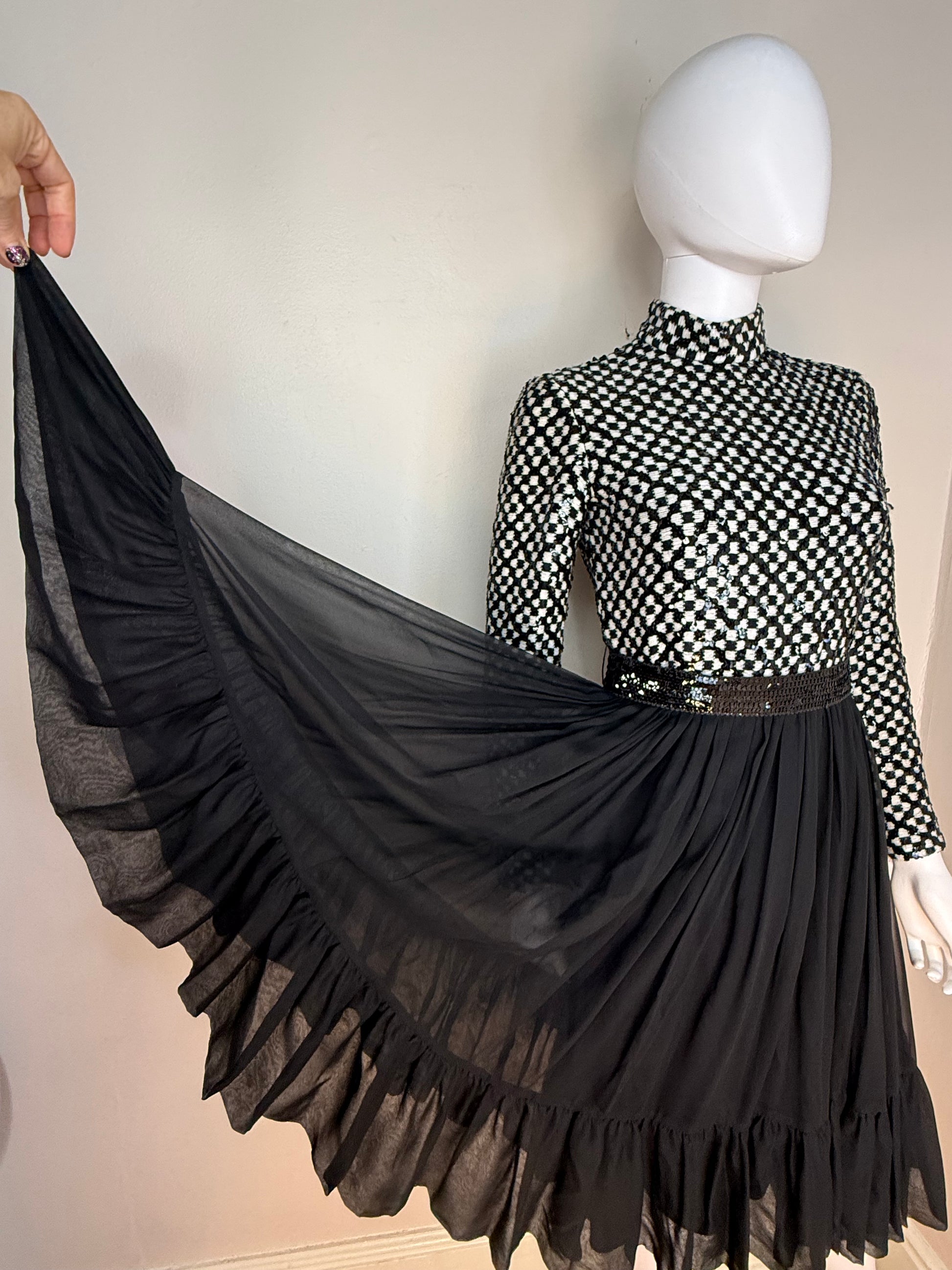 Description - Mod cocktail dress from the late 60s or early 70s with a black and white check bodice that has black sequins in a diamond pattern and a full sheer black skirt. It comes with a matching black sequin belt. The dress is fully lined except for the sleeves. It has a metal zipper up the back.