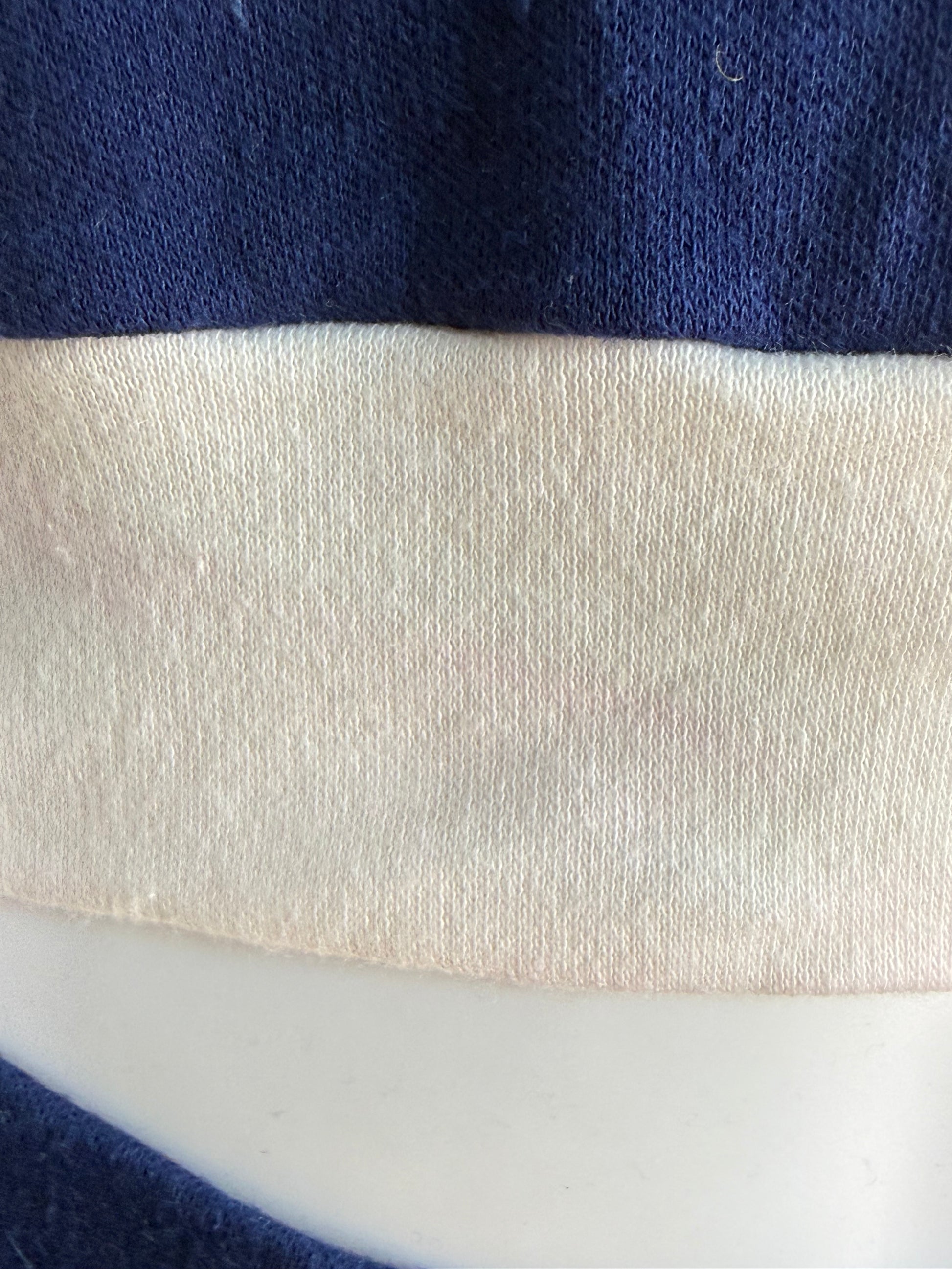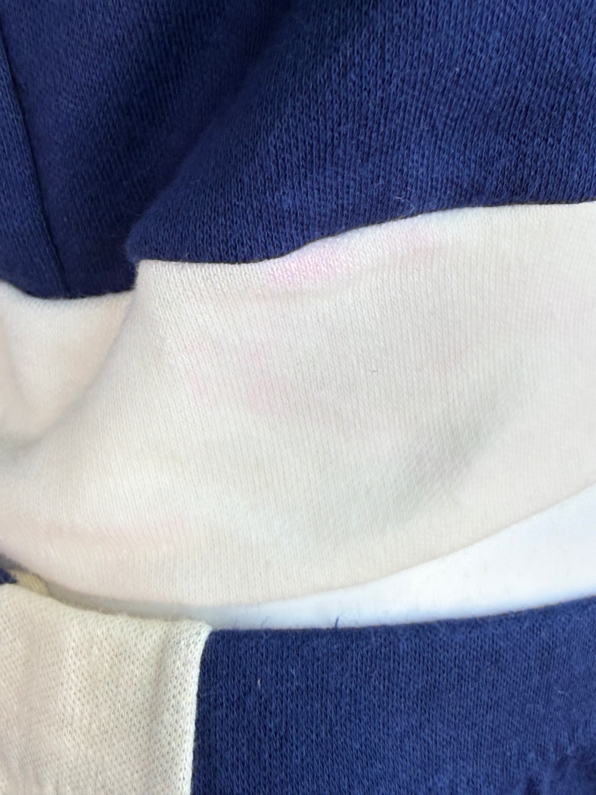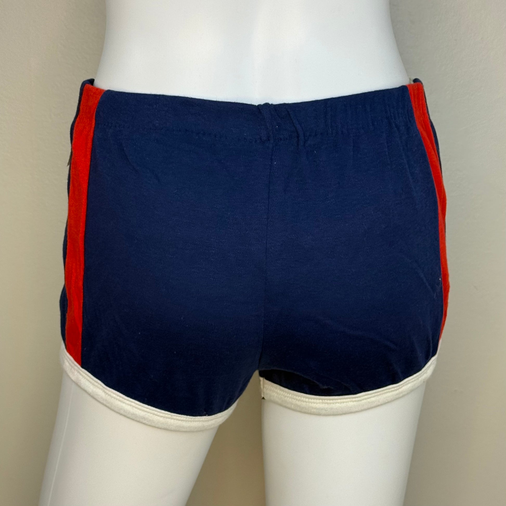 Description - Matching navy blue knit set from the late 70s or early 80s that includes a top and shorts. The top has a scoop neck, ringer cap sleeves, and band at the bottom. There are wide stripes on the shoulders. The shorts have an elastic waist with a contrasting bound hem and wide stripes on the sides.