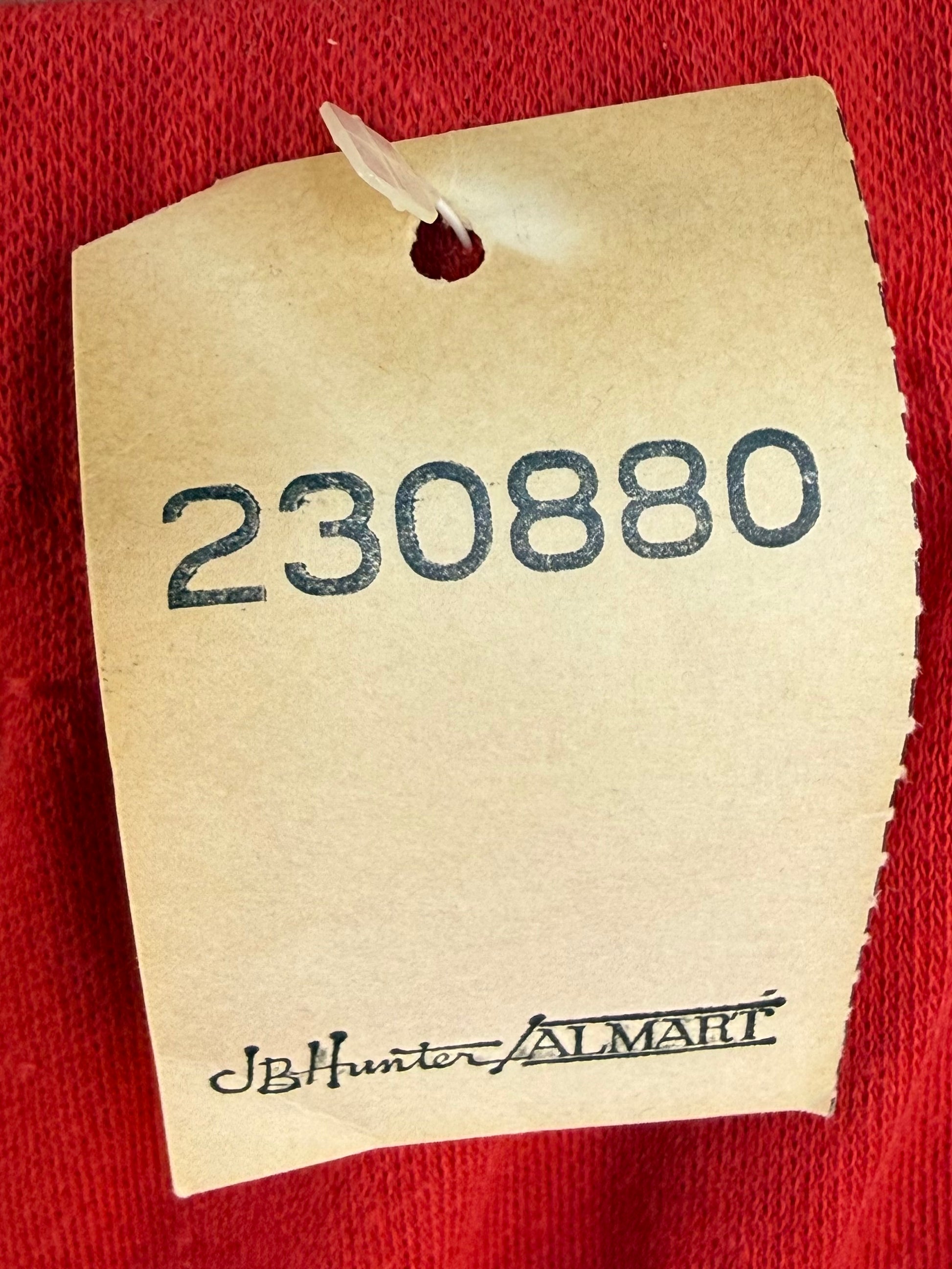 Description - Matching red knit set from the late 70s or early 80s that includes a top and shorts. The top has a scoop neck, ringer cap sleeves, and band at the bottom. There are wide stripes on the shoulders. The shorts have an elastic waist with a contrasting bound hem and wide stripes on the sides.