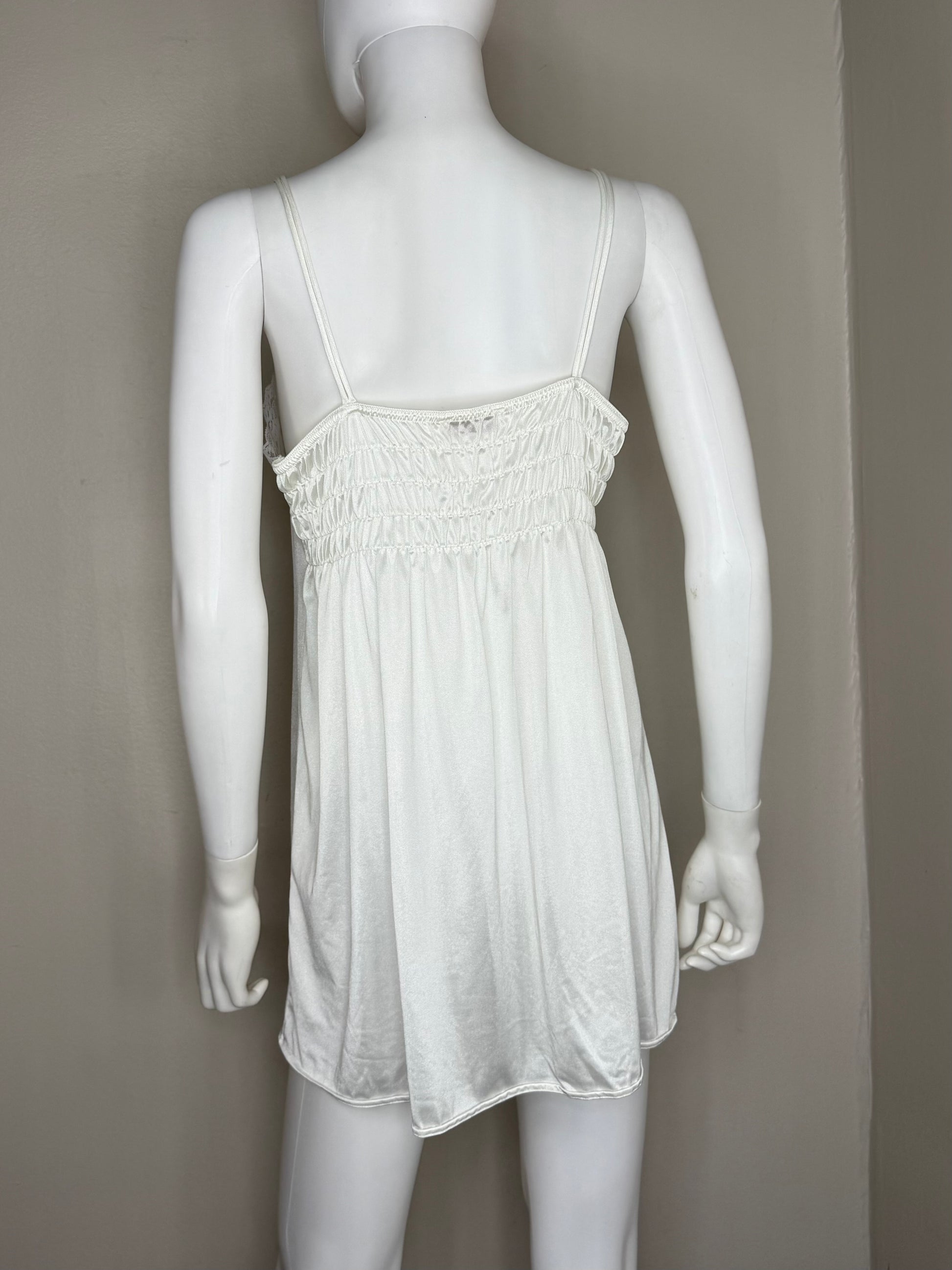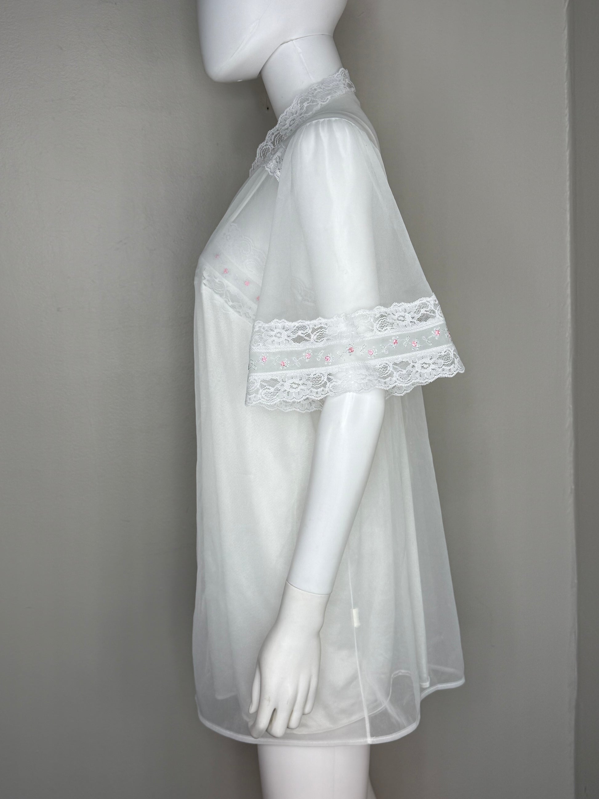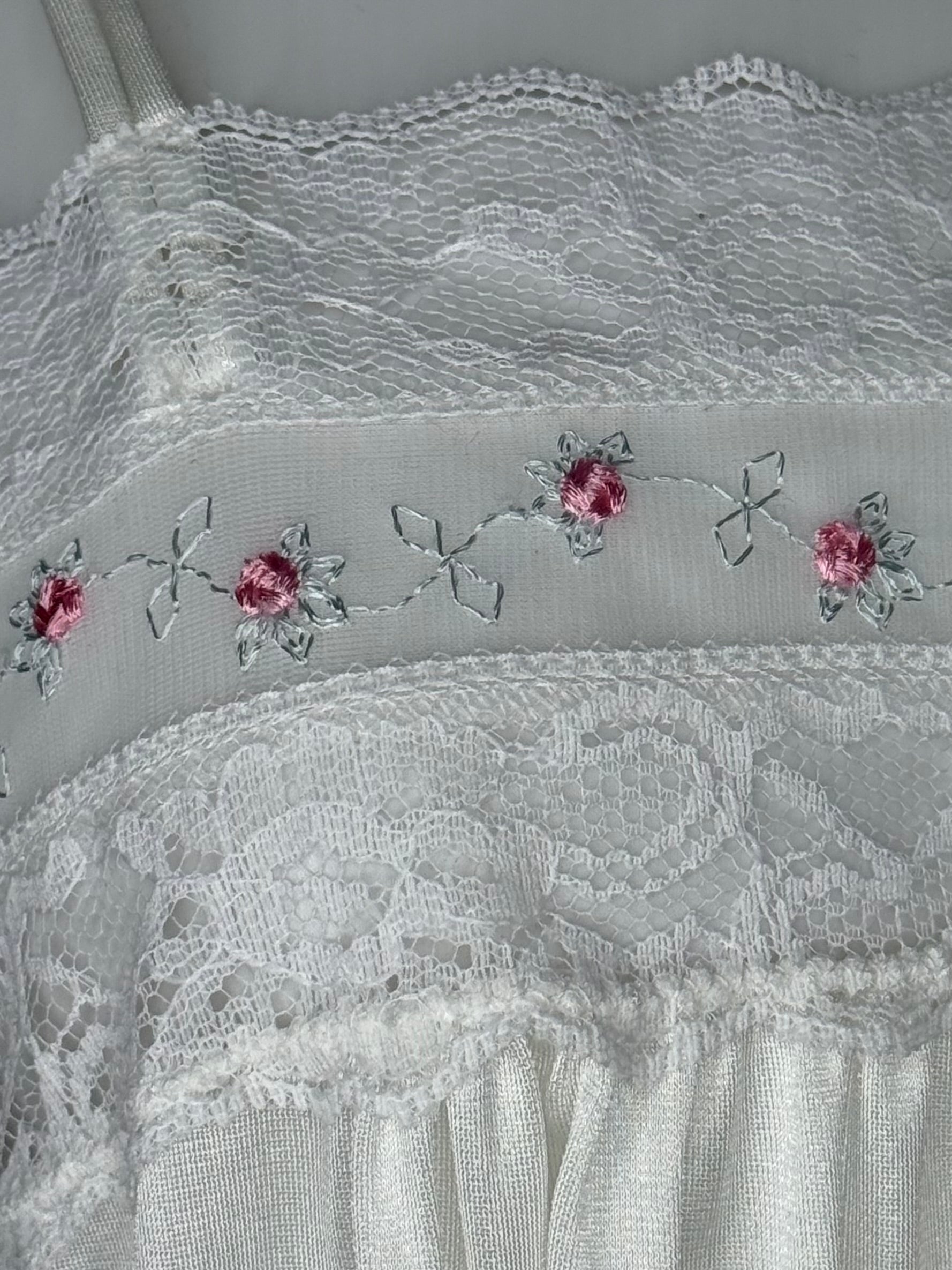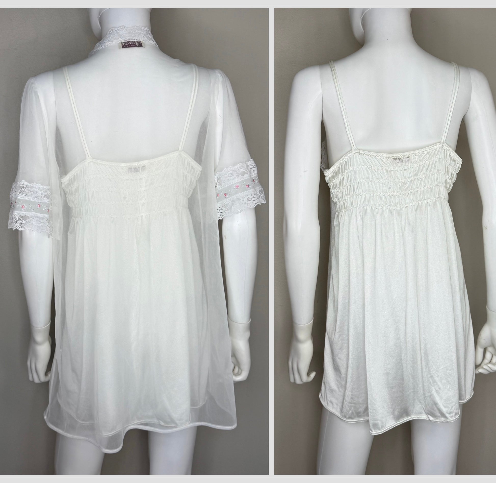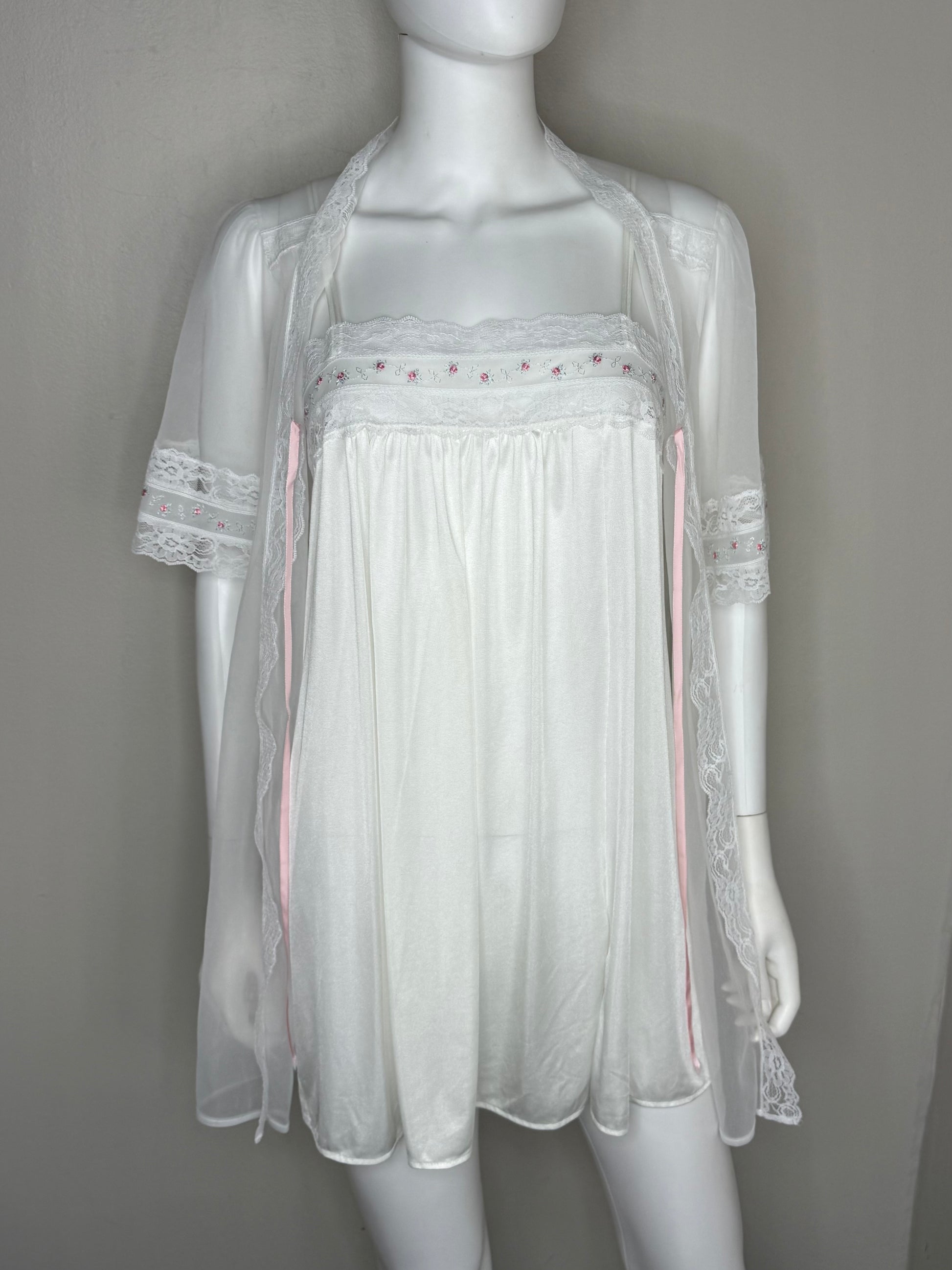 Description - Matching short nightgown and robe set from the late 70s or early 80s. The nightgown has double spaghetti straps and there are elastic strips in the back of the bodice. There is a 5.5" slit on the left side of the front. The robe is sheer. It ties in the front at the bust with a pastel pink ribbon. Both pieces have the same embroidered roses trim.