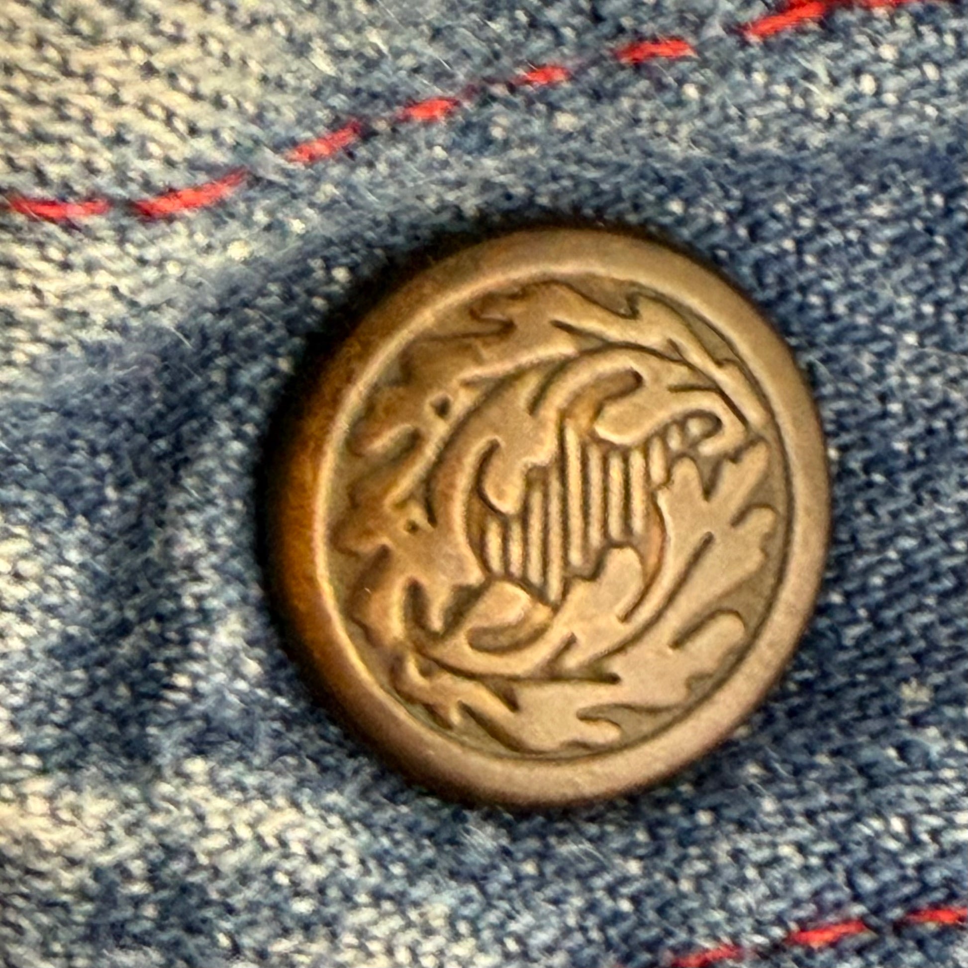 Description - Bellbottom blue jeans from the 70s with red satin ribbon and eyelet trim on the pockets. There is one pocket in the front and 2 in the back.