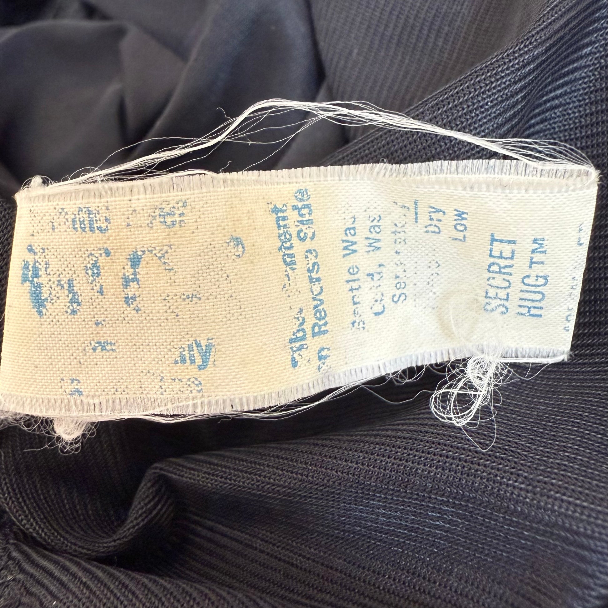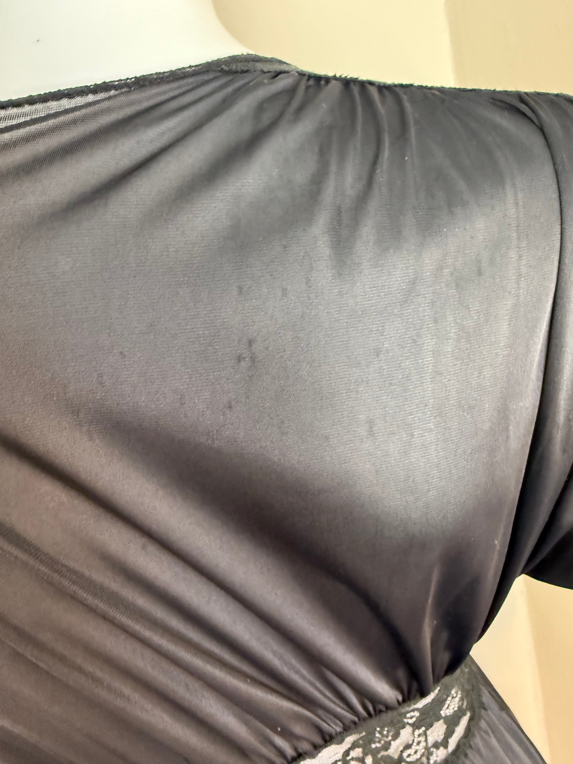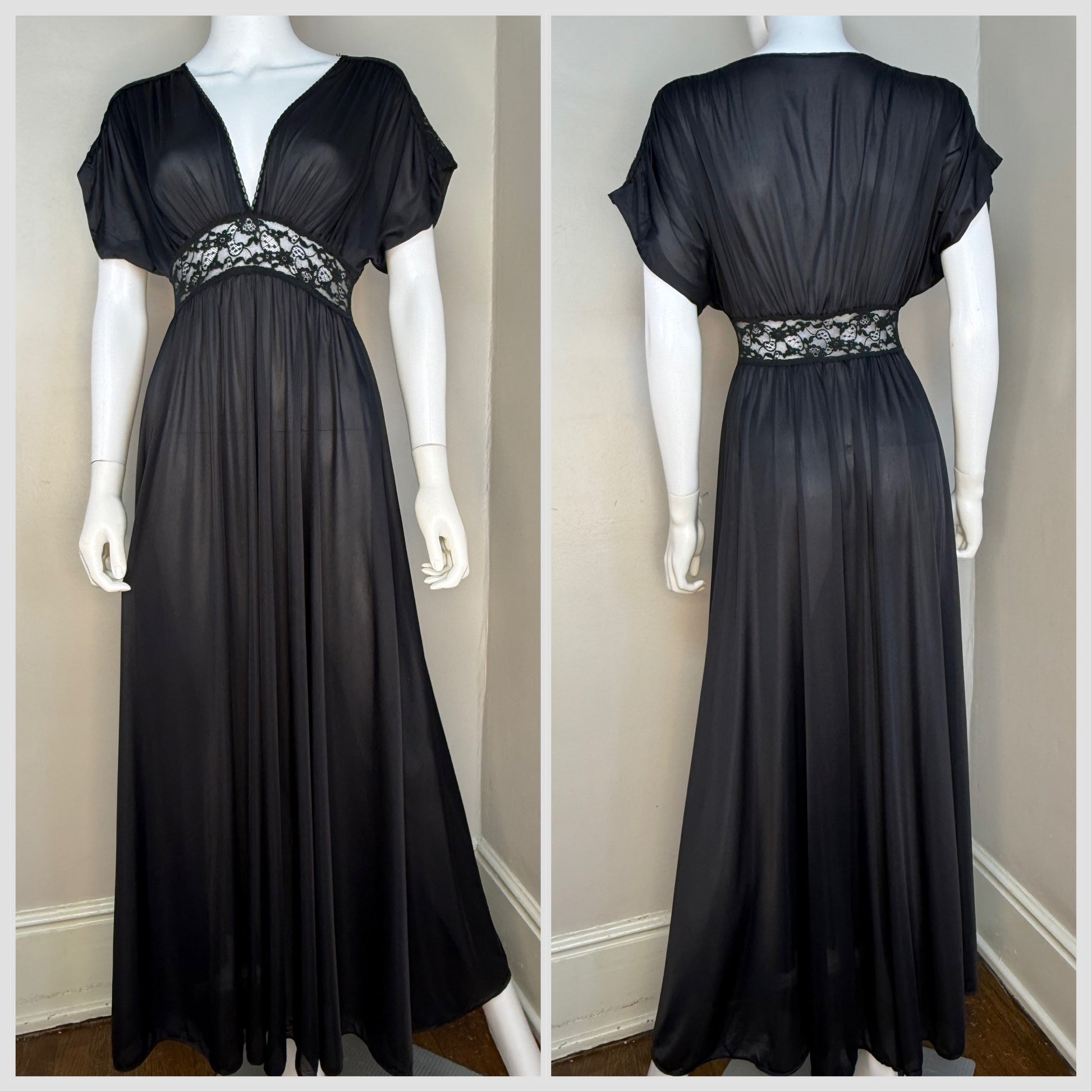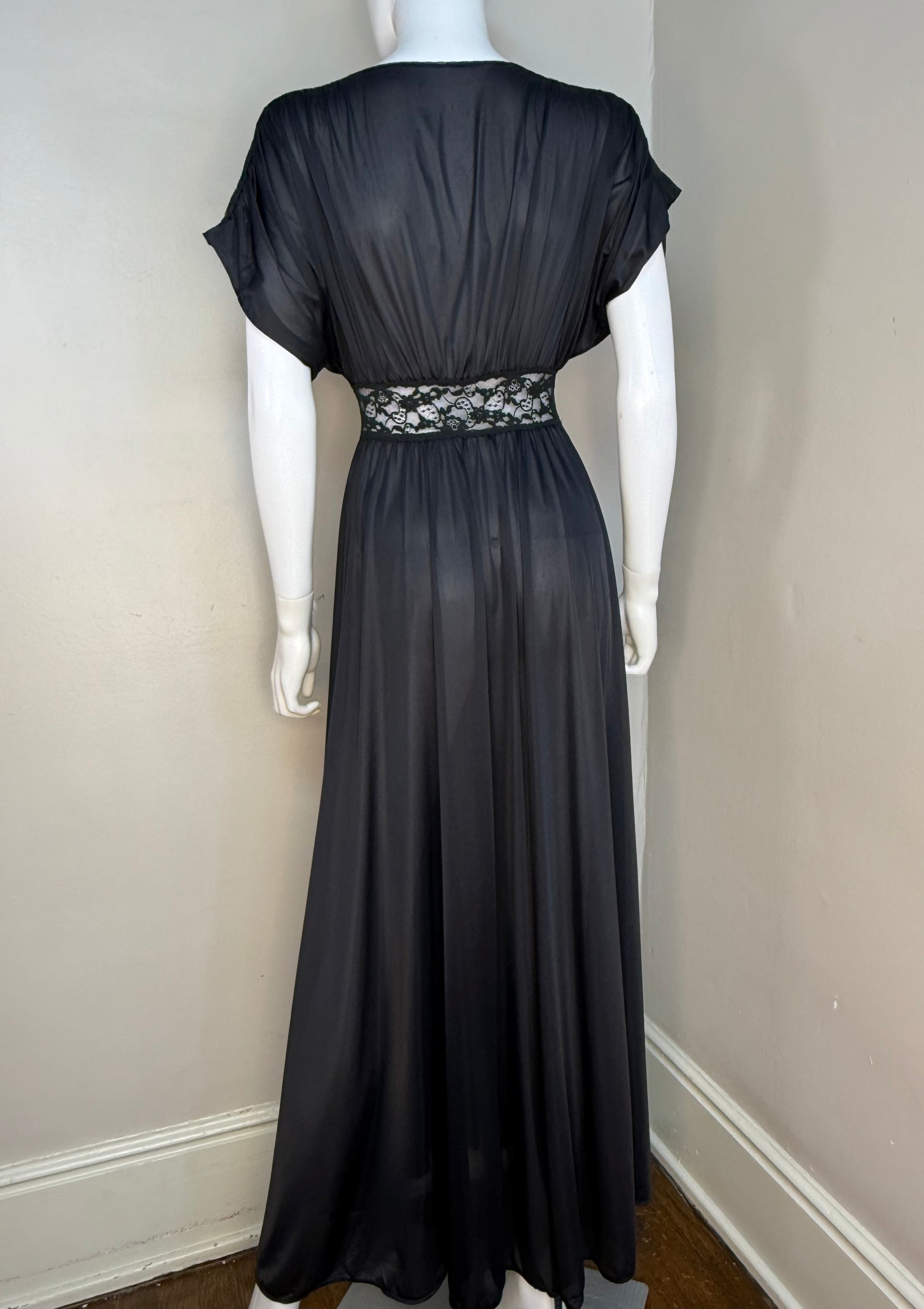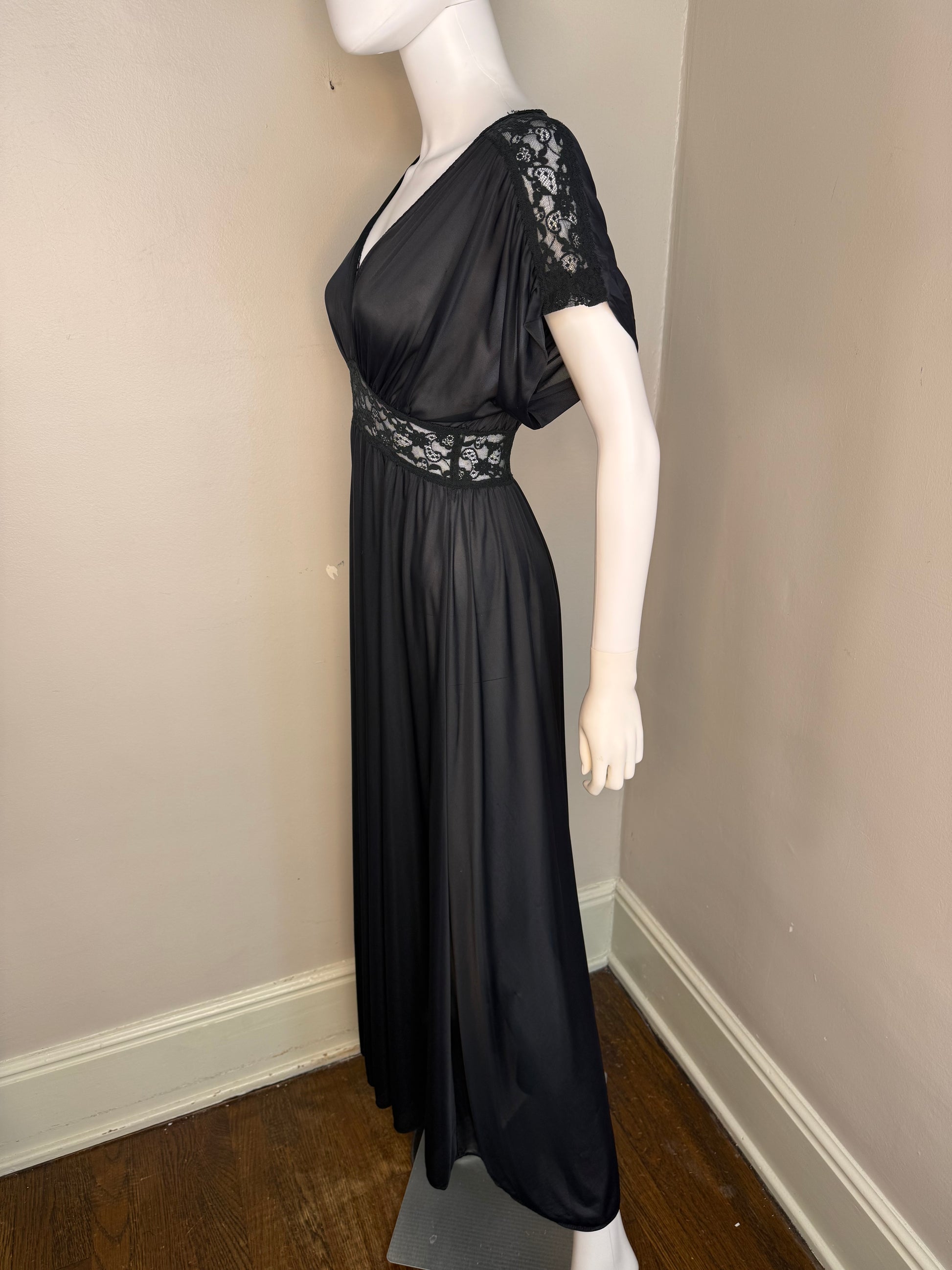Description - Pretty Black Olga Secret Hug nightgown from 1977. It has lace cutouts around the waist and on the shoulders. It is full length with a plunging V neckline.