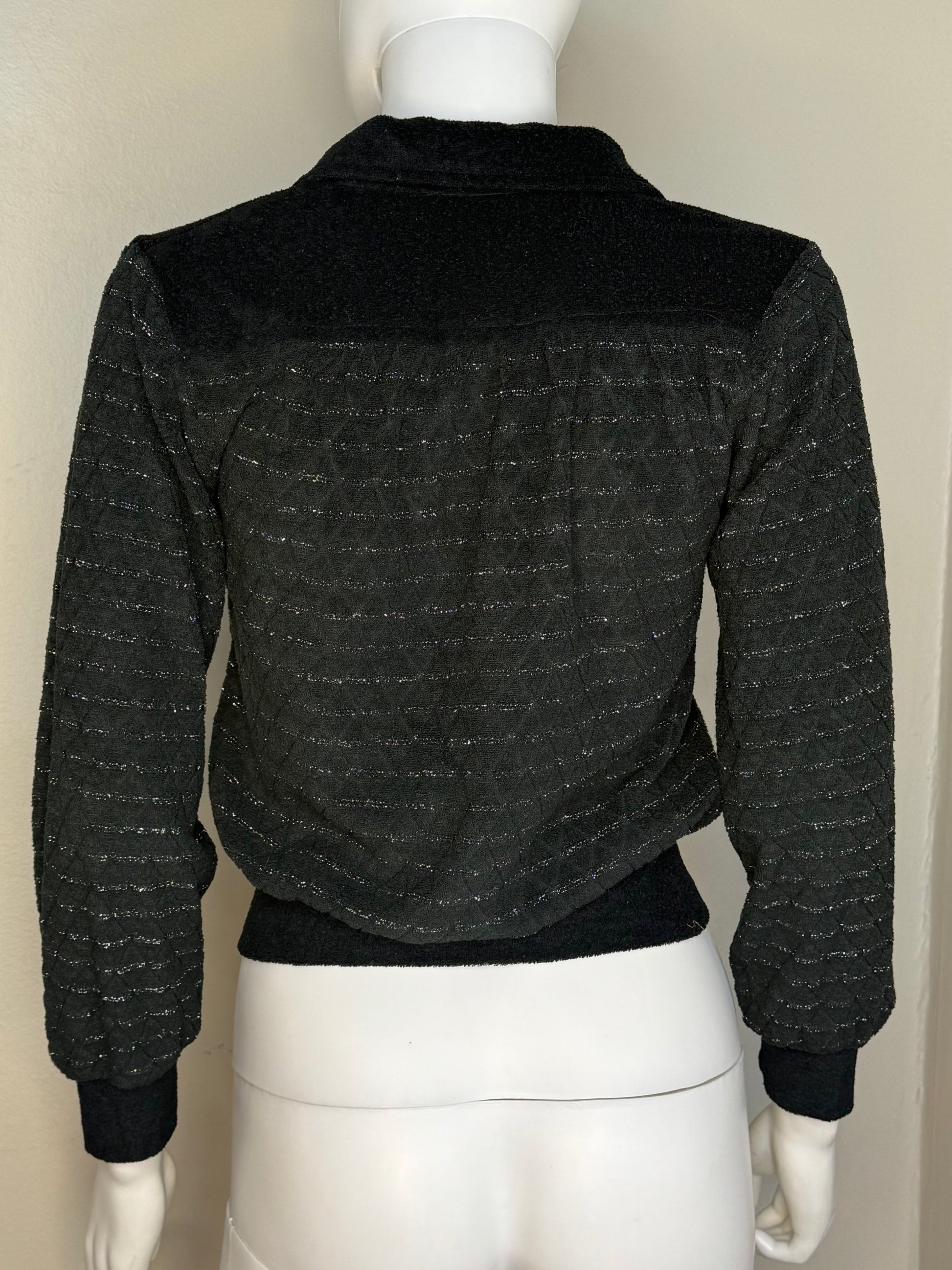 1970s Black Terry Cloth Collared Sweater with Glitter Stripes, Size XS-Small