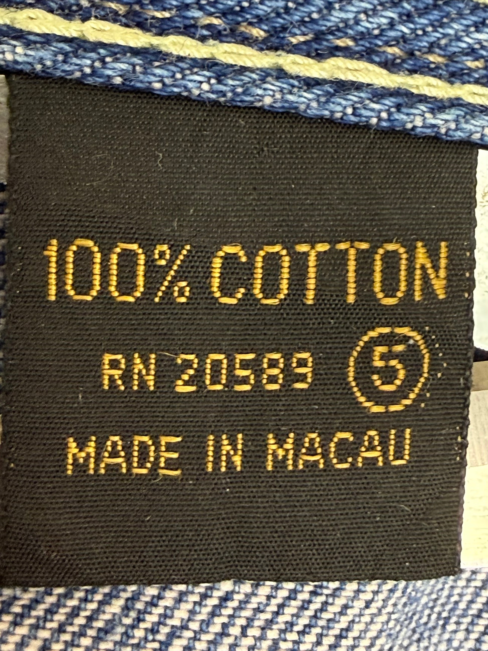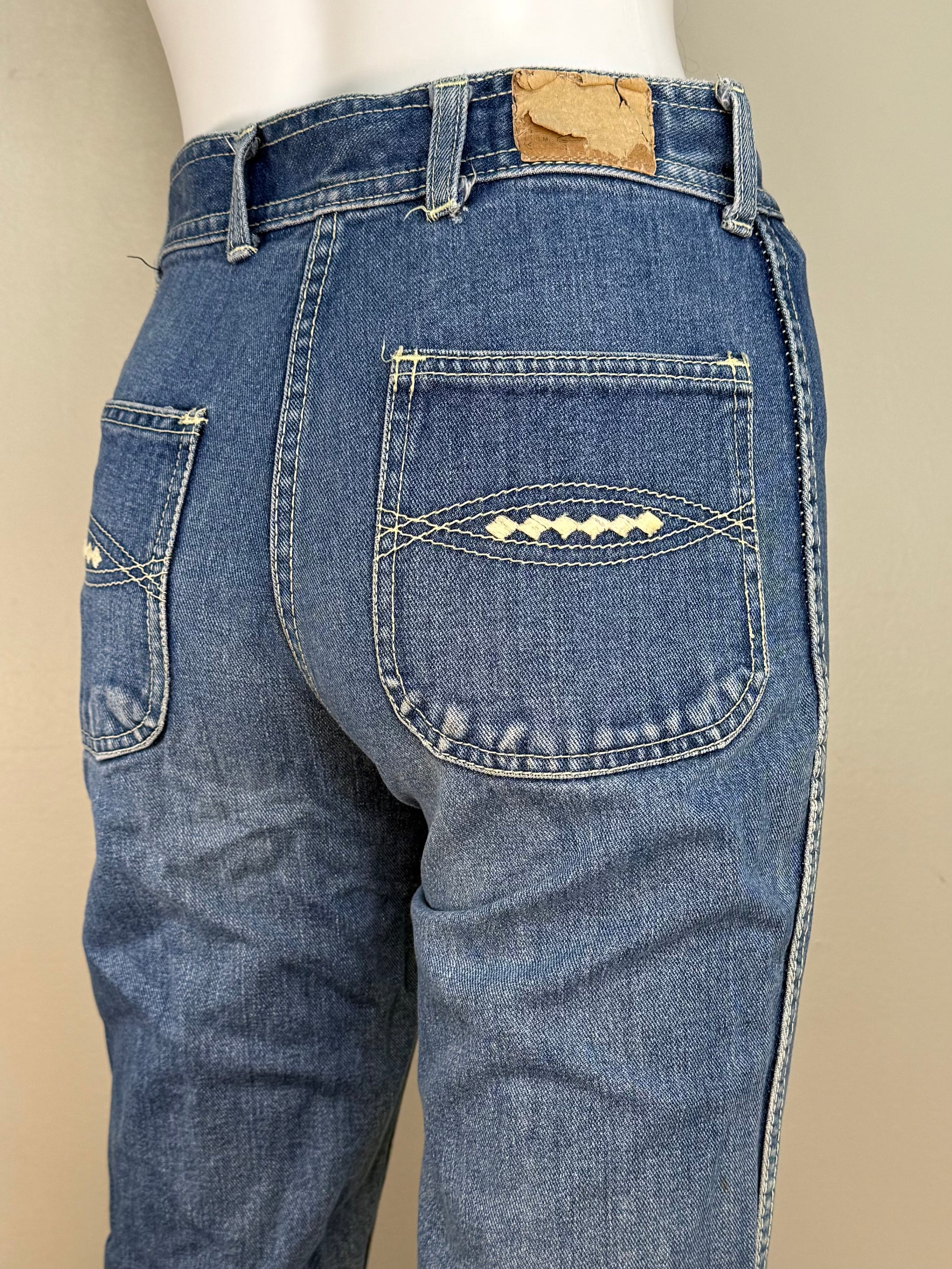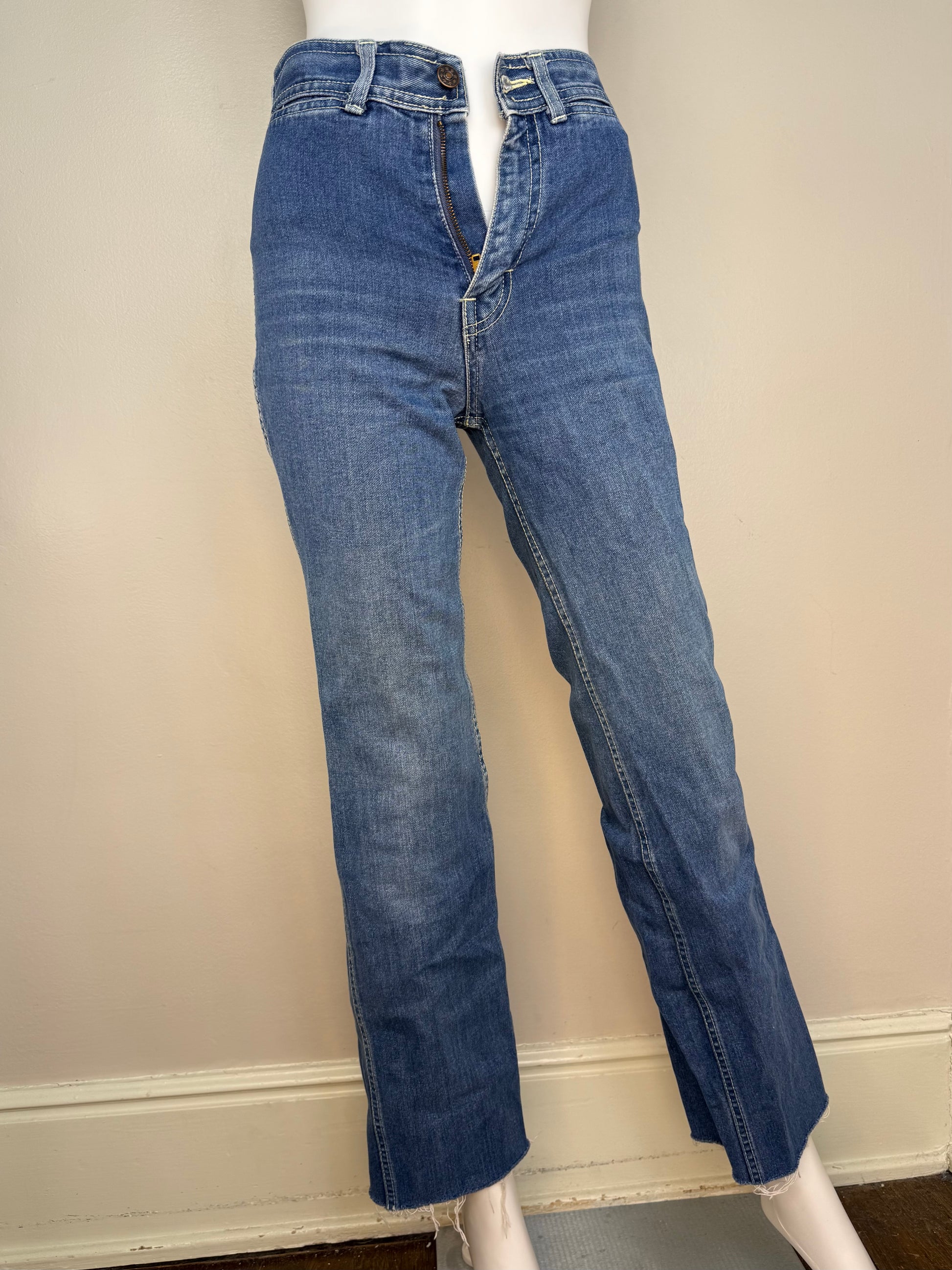 Description - High waisted straight leg jeans from the 70s with a raw hem. They have 2 pocket watch pockets in the front and patch pockets with white embroidery in the back.