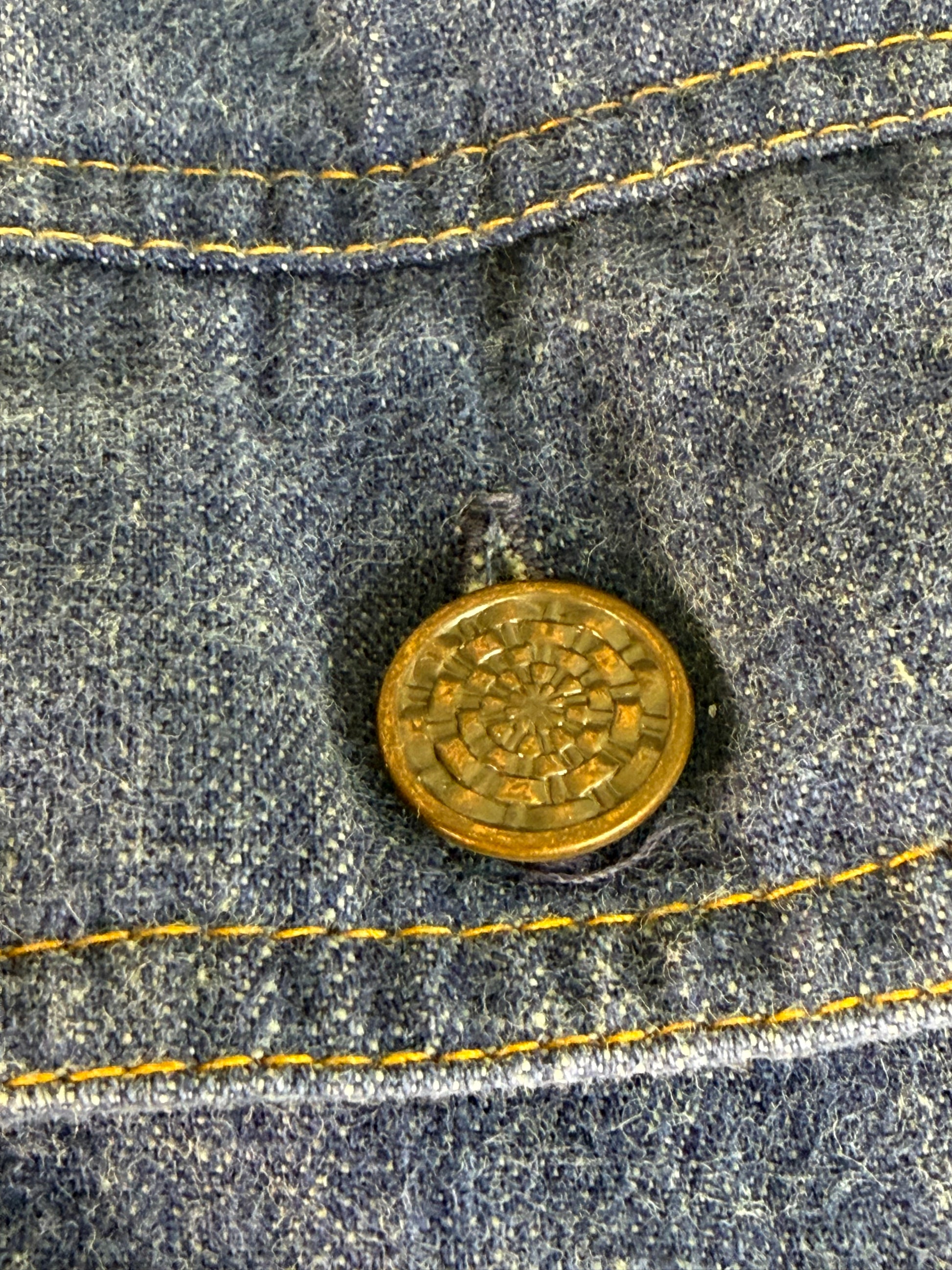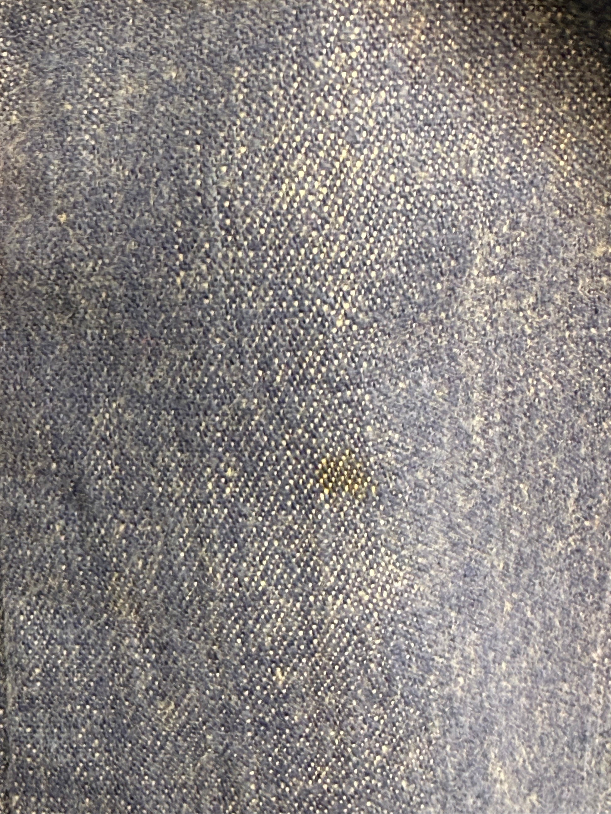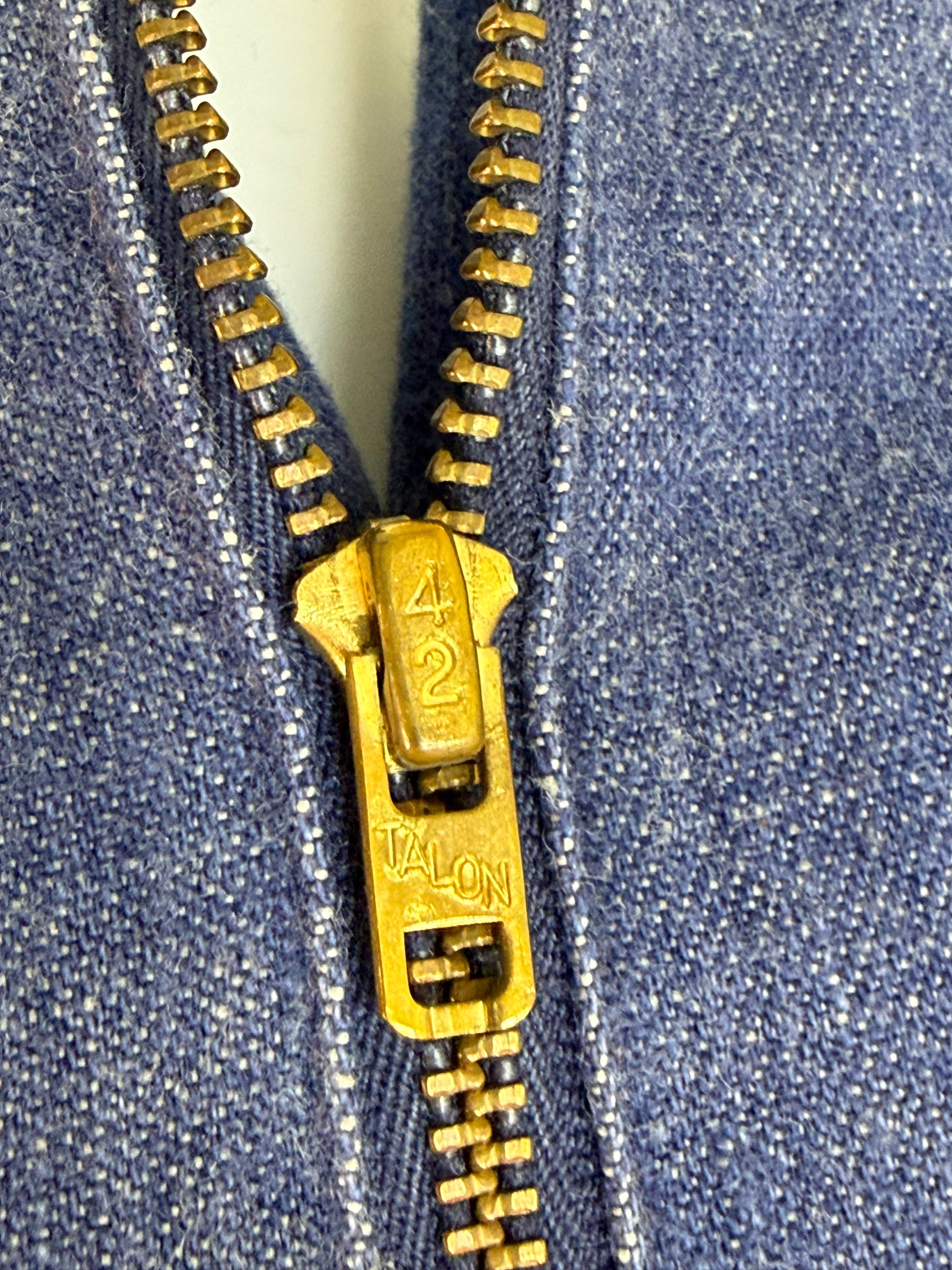Condition - This was hemmed up really short at one point and there is a white line showing where the temporary hem was. There is a small stain on the leg that I didn't notice until I was photographing it. It has not been treated so it might come out if you do so. There is also a fabric flaw on the left sleeve near the arm pit.