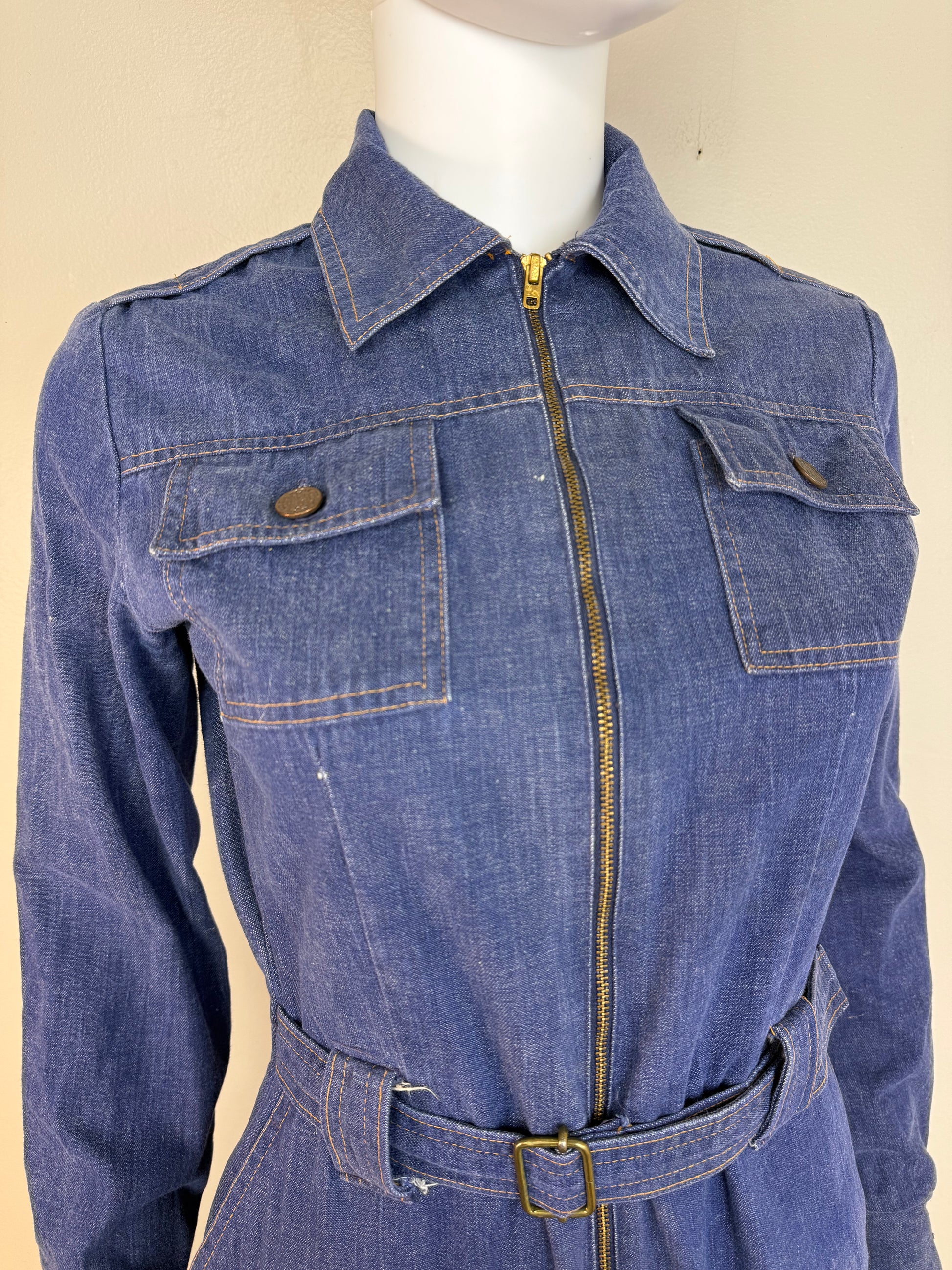 Description - Long sleeve flare leg denim jumpsuit from the 70s. It zips up the front and buttons at the cuffs and chest pockets. There are also pockets for your hands on both hips. There is an attached belt in the front and elastic in the back.