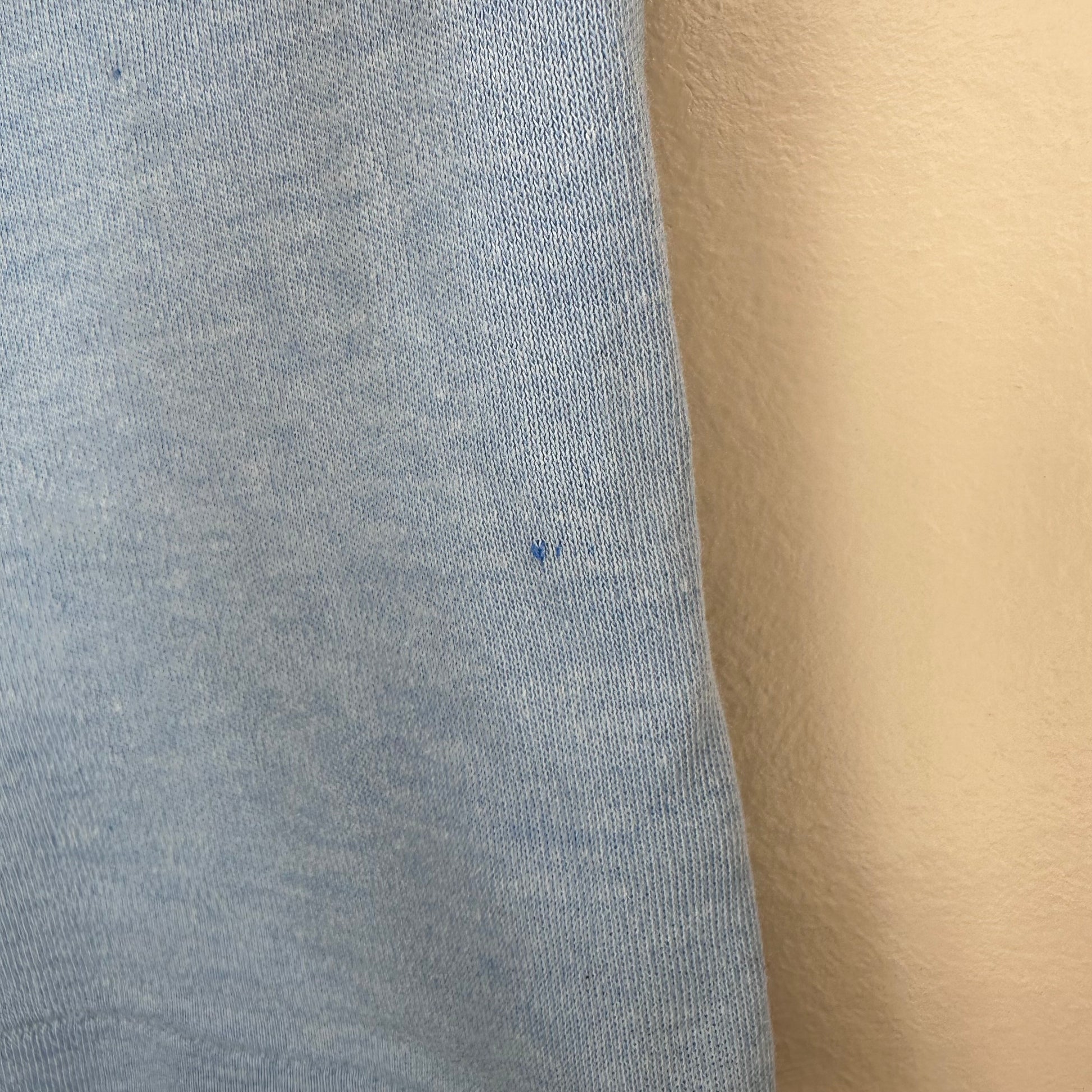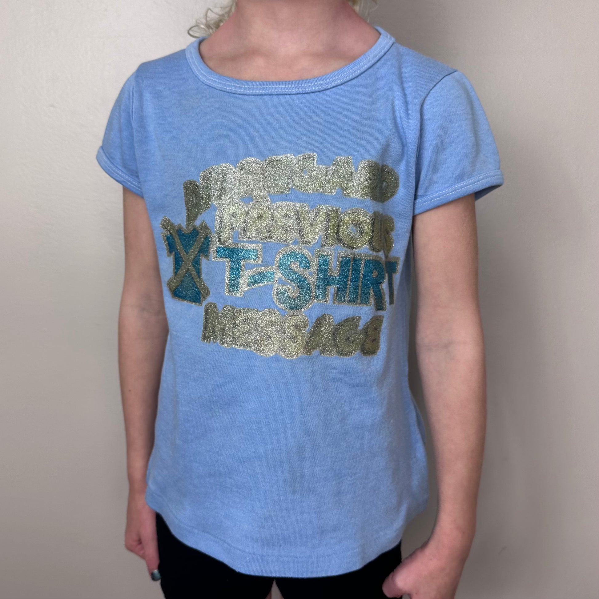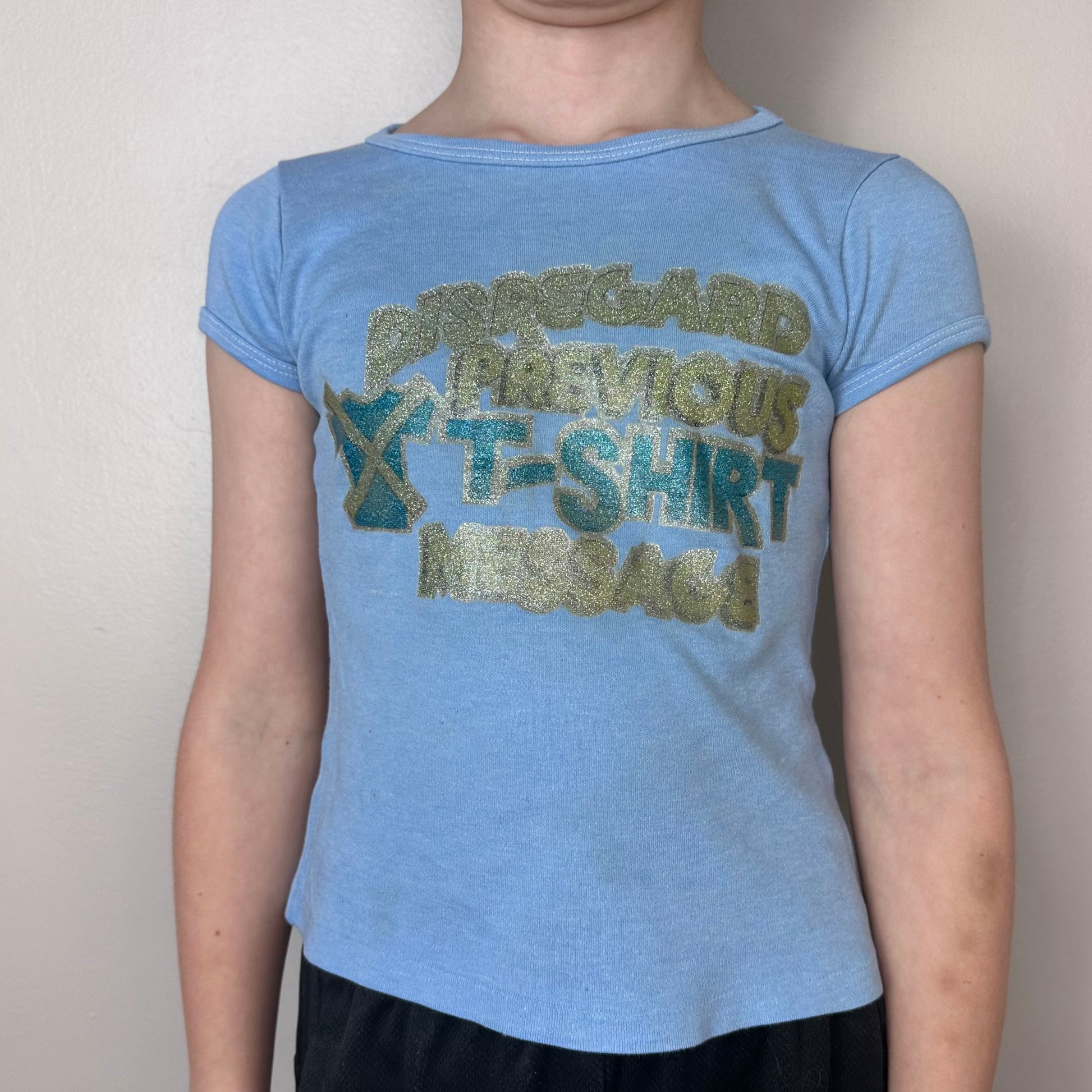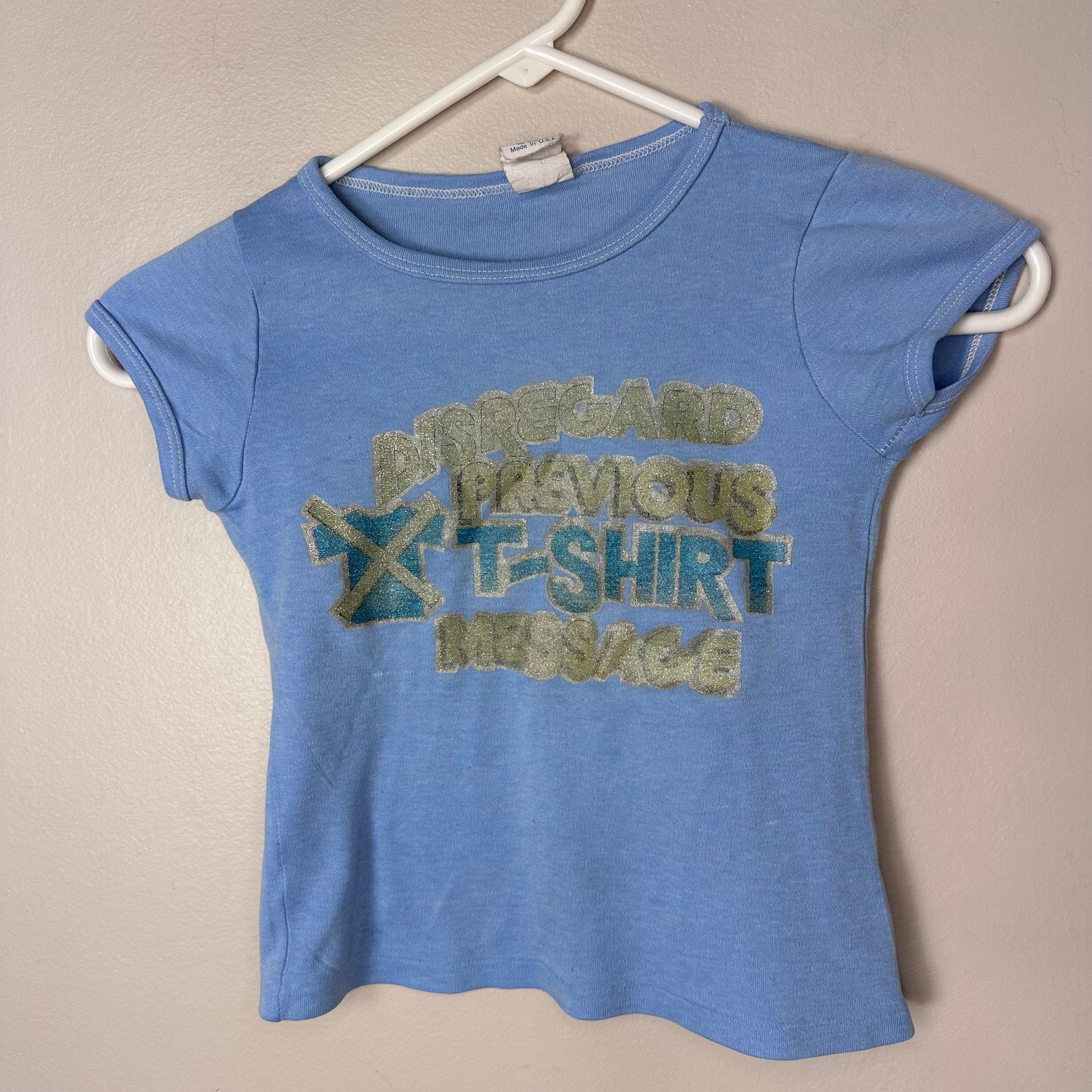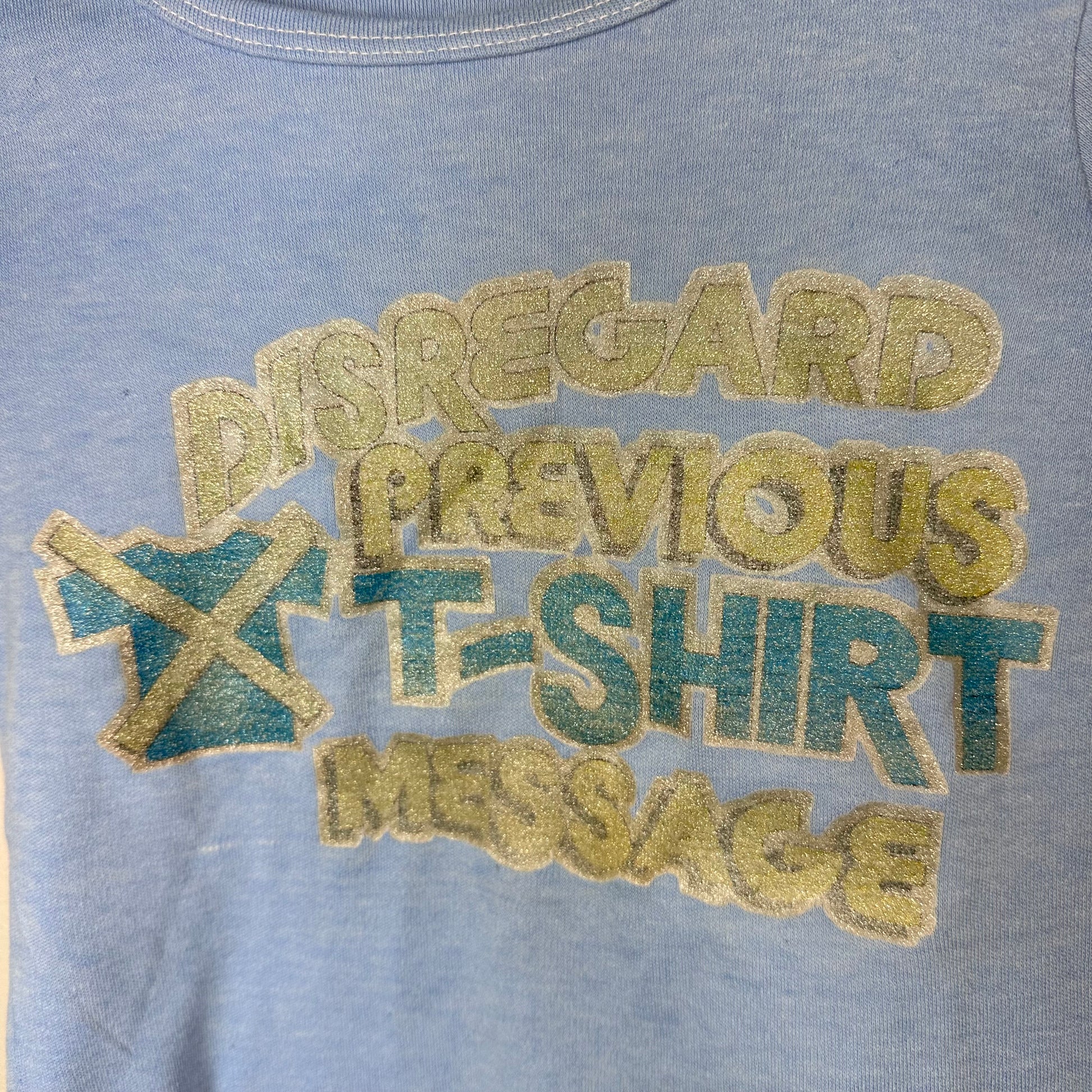Description - 70s femme cut baby blue tee with a glitter iron on that says "Disregard Previous T-Shirt Message" It is a soft single stitch shirt.