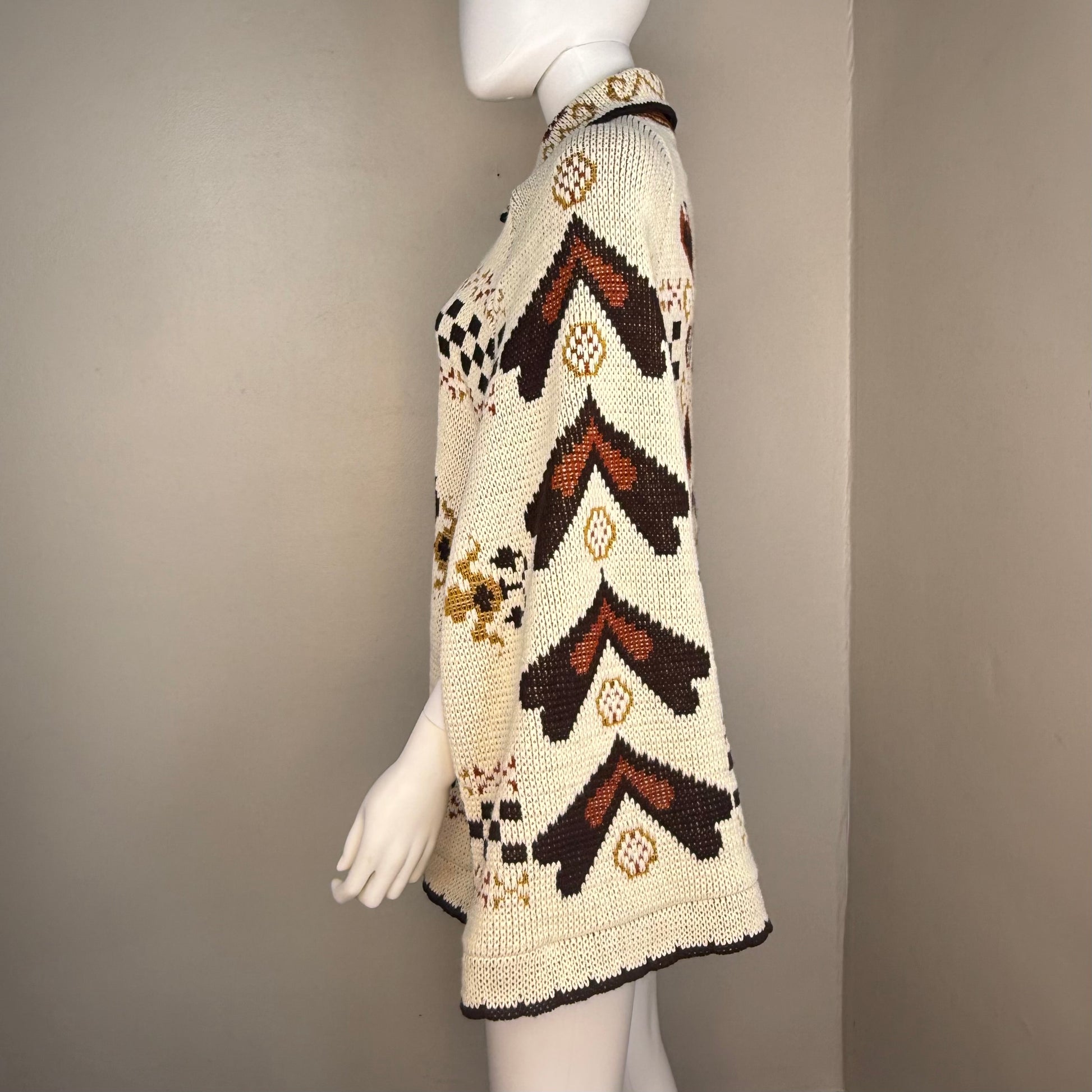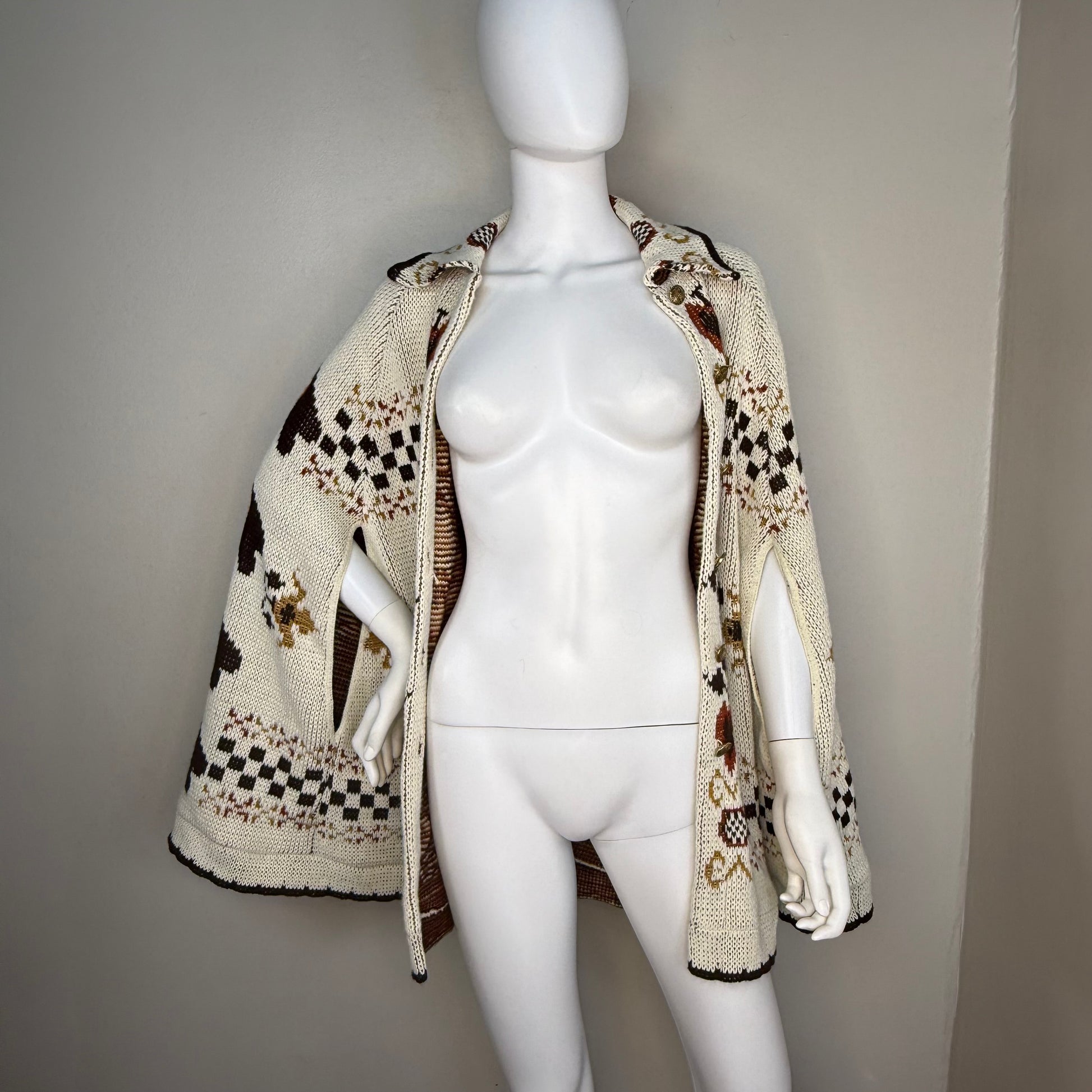 Description - 70s folk art sweater cape. it buttons up the front and has a pointed collar. There are slits for both hands to come through.