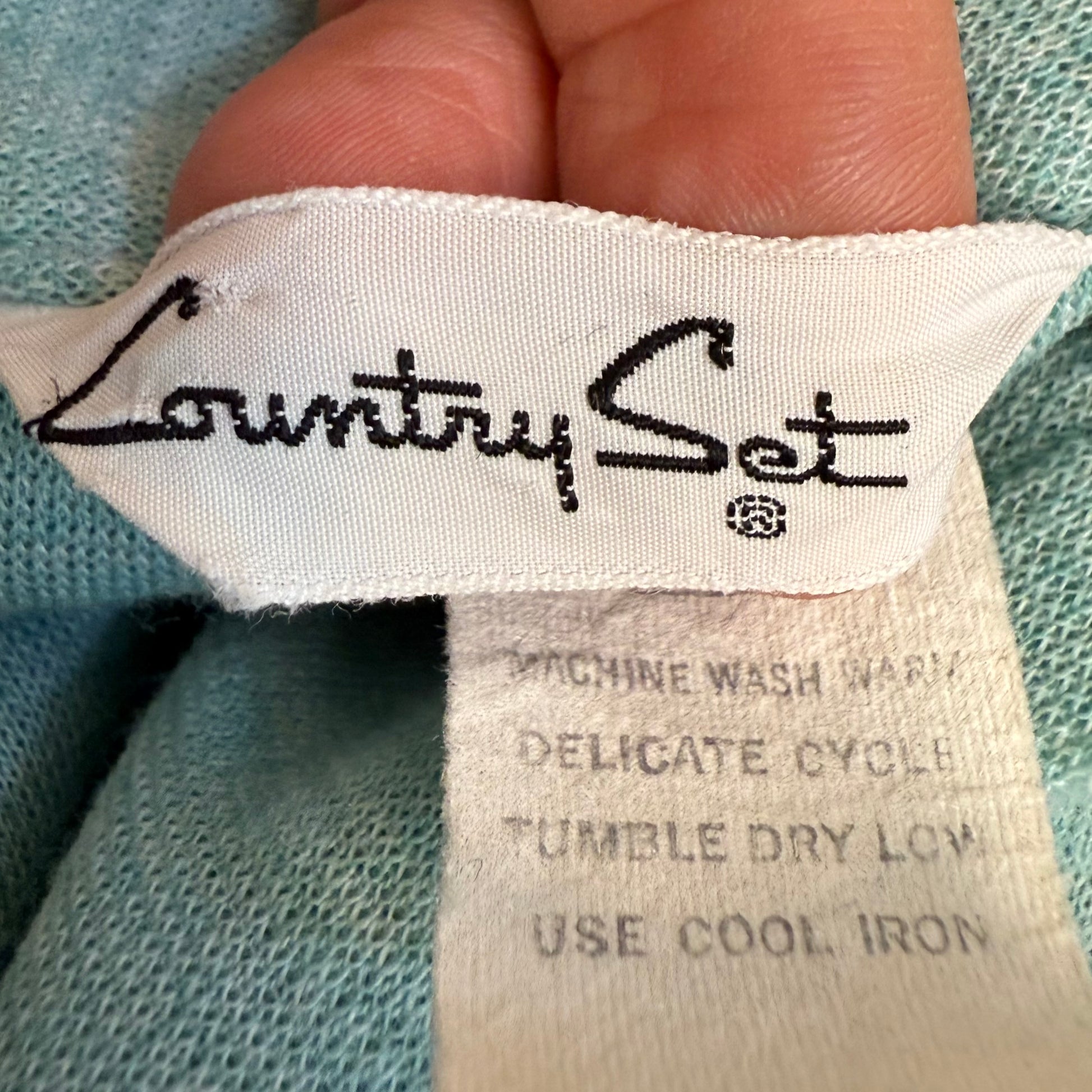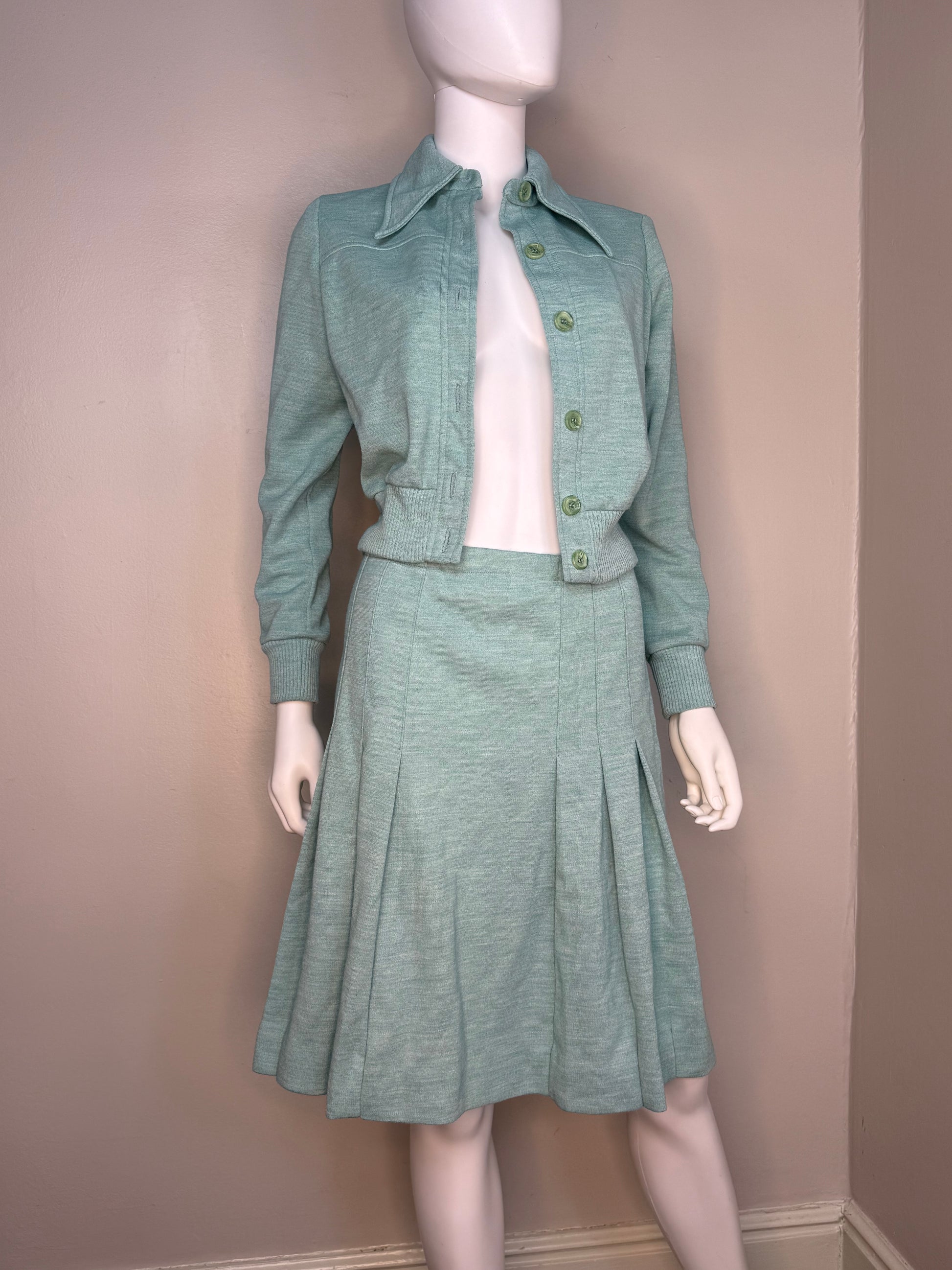 Description - Light green jacket and skirt set from the 70s. The jacket has a large pointed collar. It buttons up the front. There is an elastic band around the bottom. The pleated skirt has an elastic waist and pulls on with no openings. There are thread belt loops on both sides of the skirt waistband but it does not come with a belt.