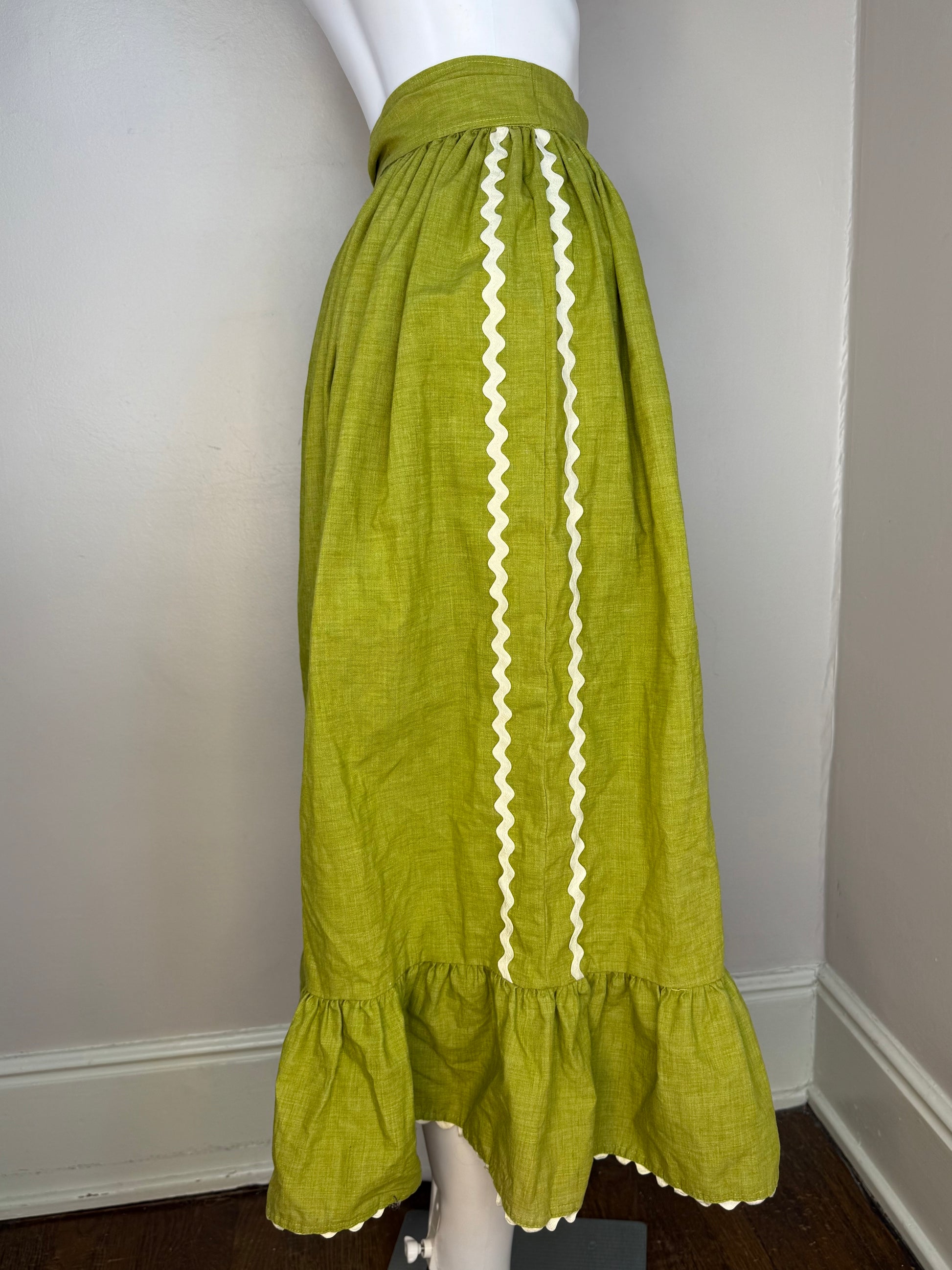 1970s Green Prairie Skirt with Ric Rack Trim, Handmade, Girls 10/12, Adult XXS