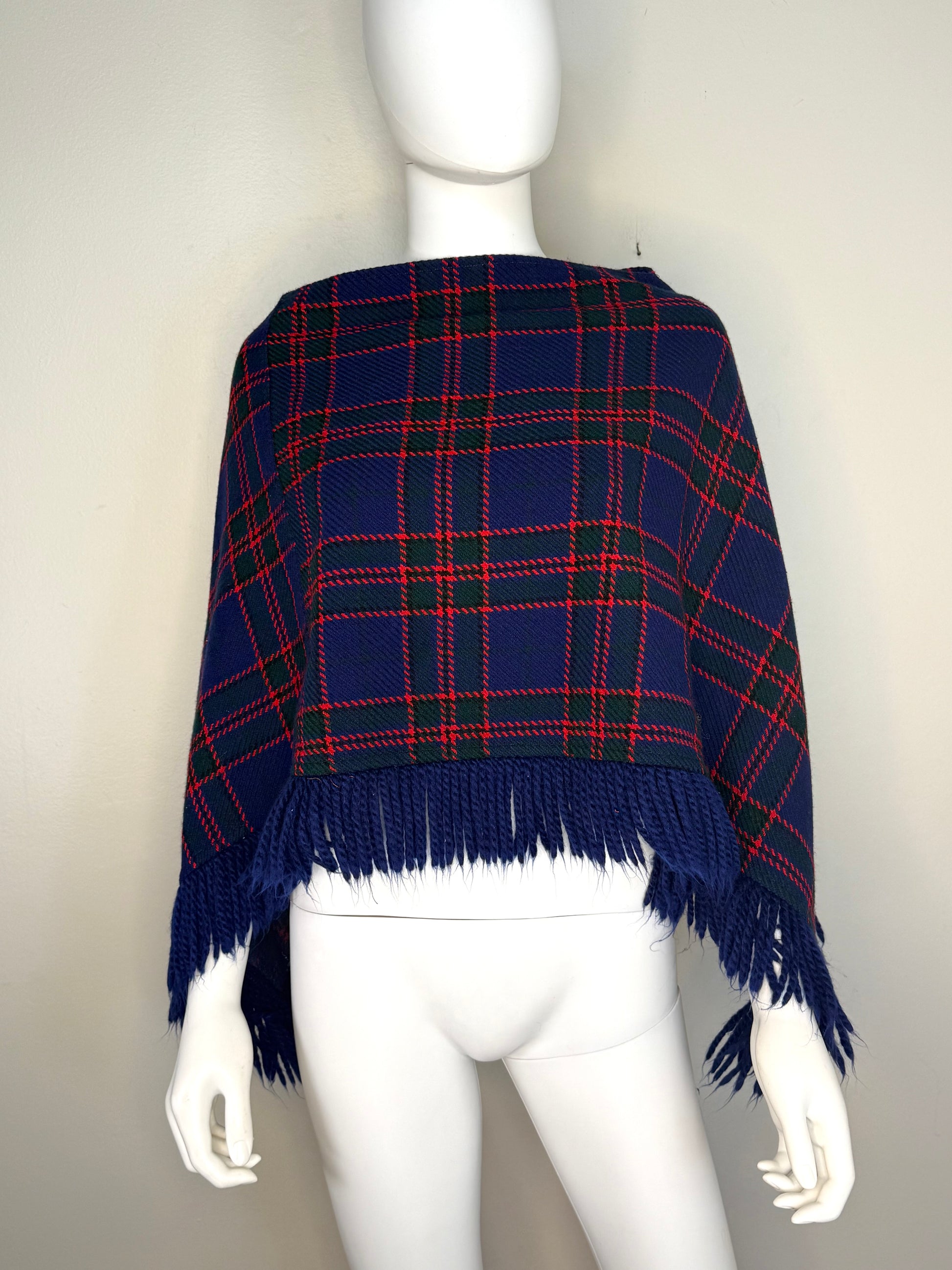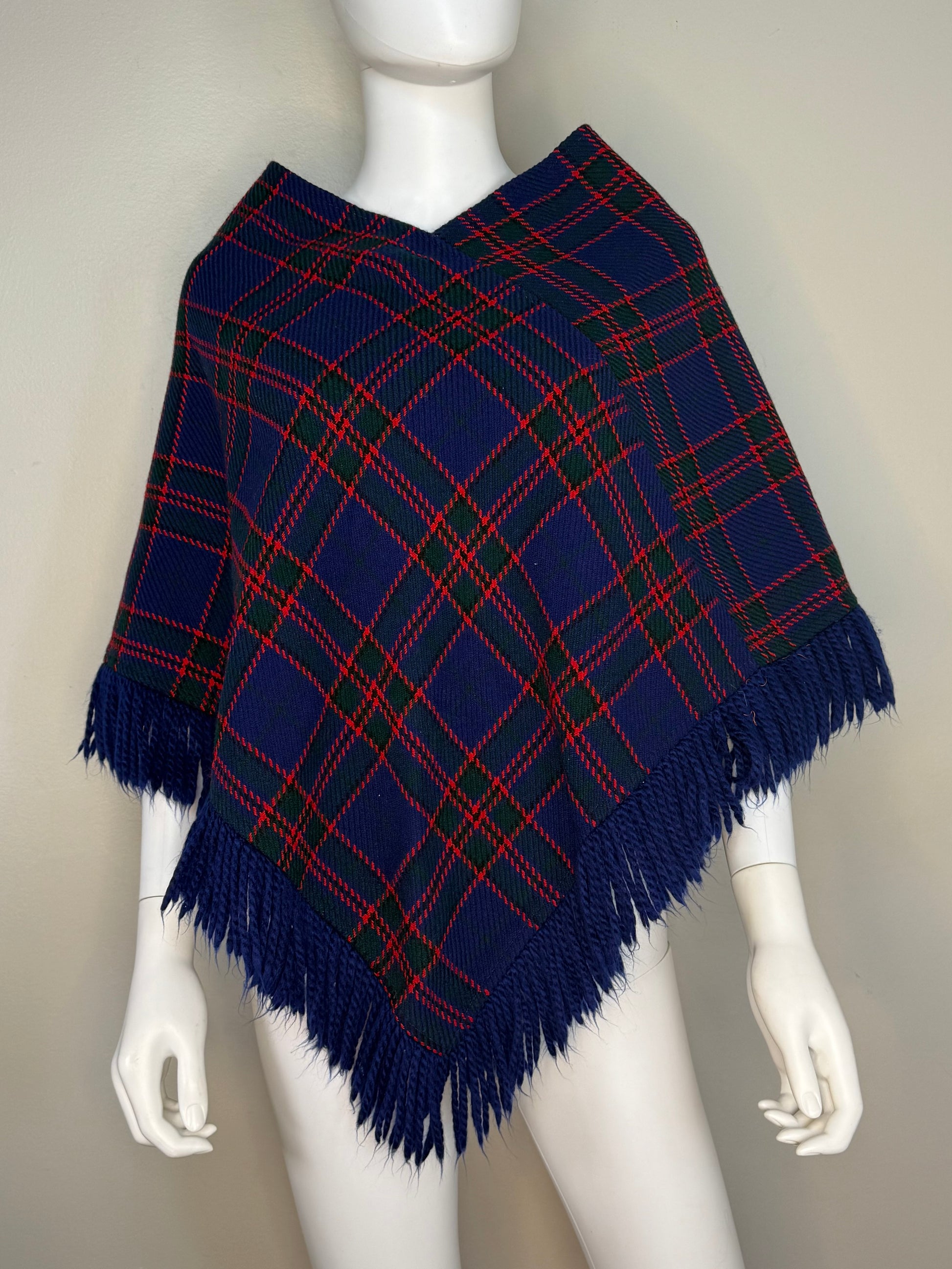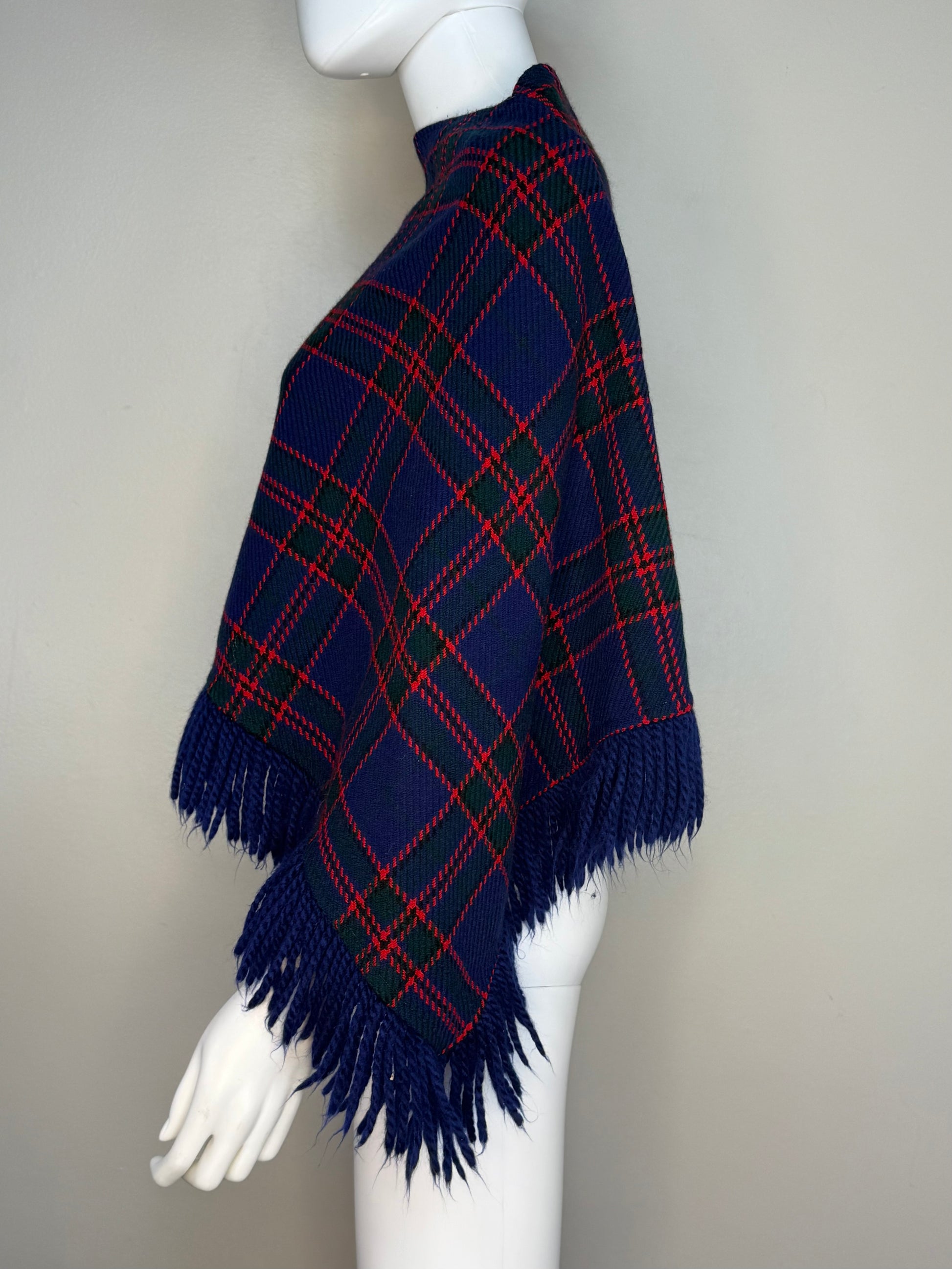Description - Navy blue, red and green plaid poncho from the 60s. . There is fringe sewn on the hem. It just pulls over your head.