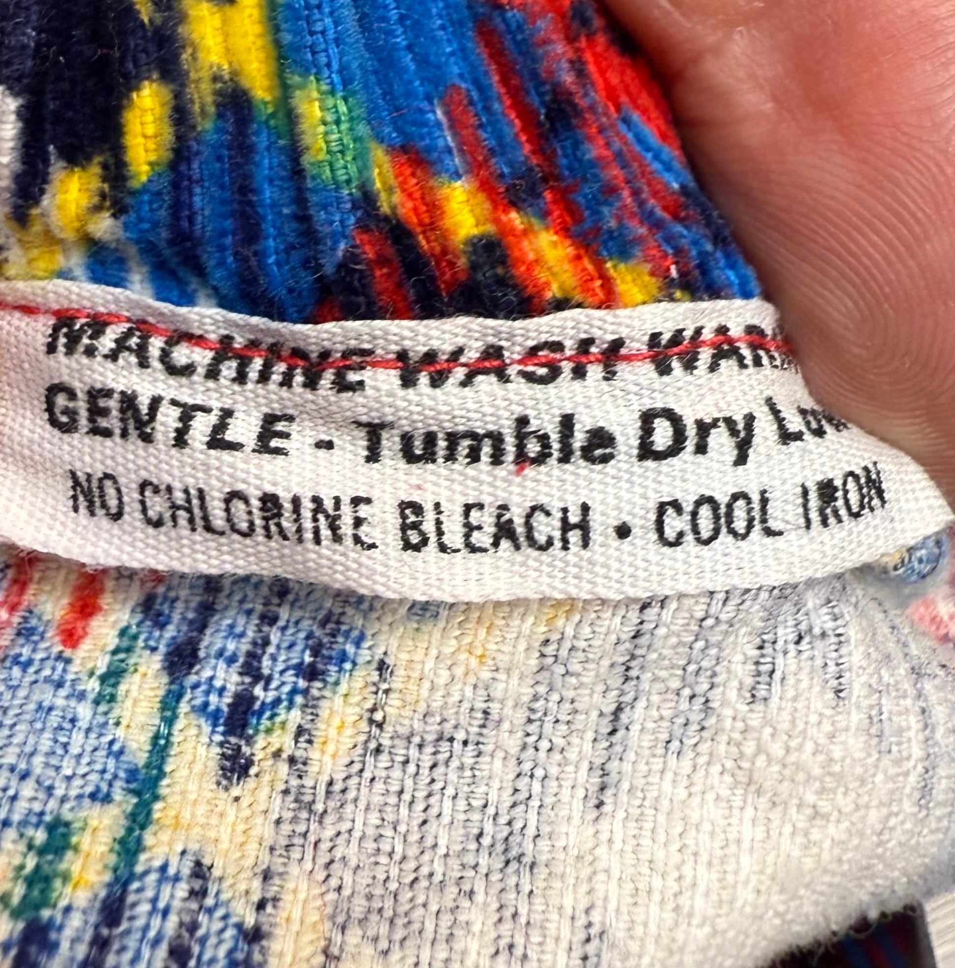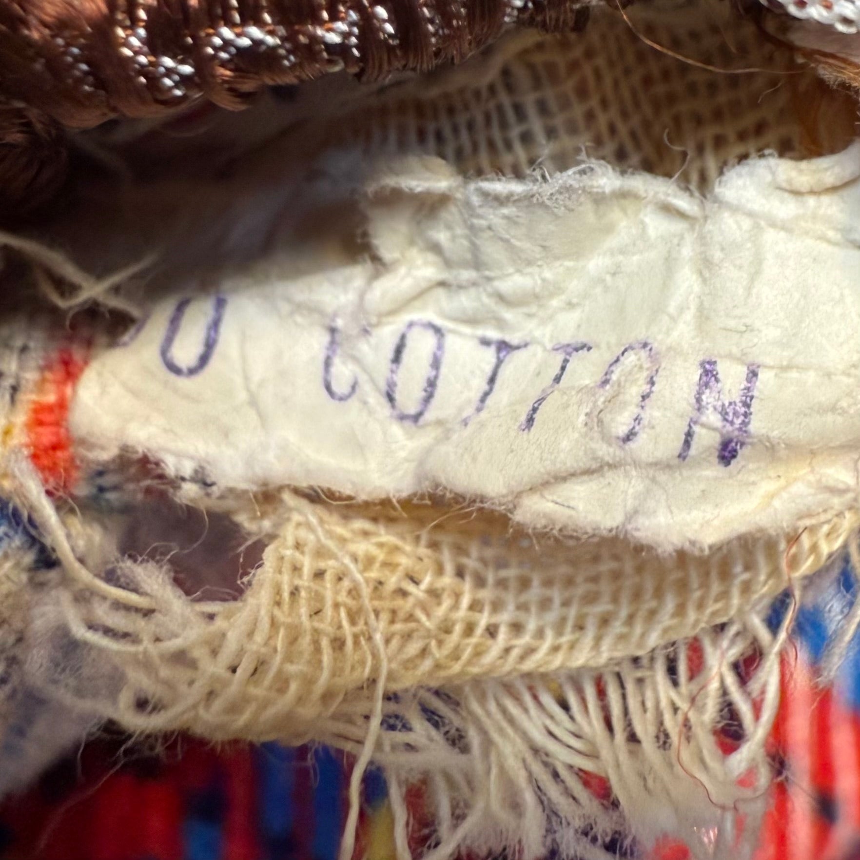 Description - Printed red plaid corduroy skirt from the 70s with red yarn fringe. It has an elastic waist with no other openings. The matching tie belt is attached.