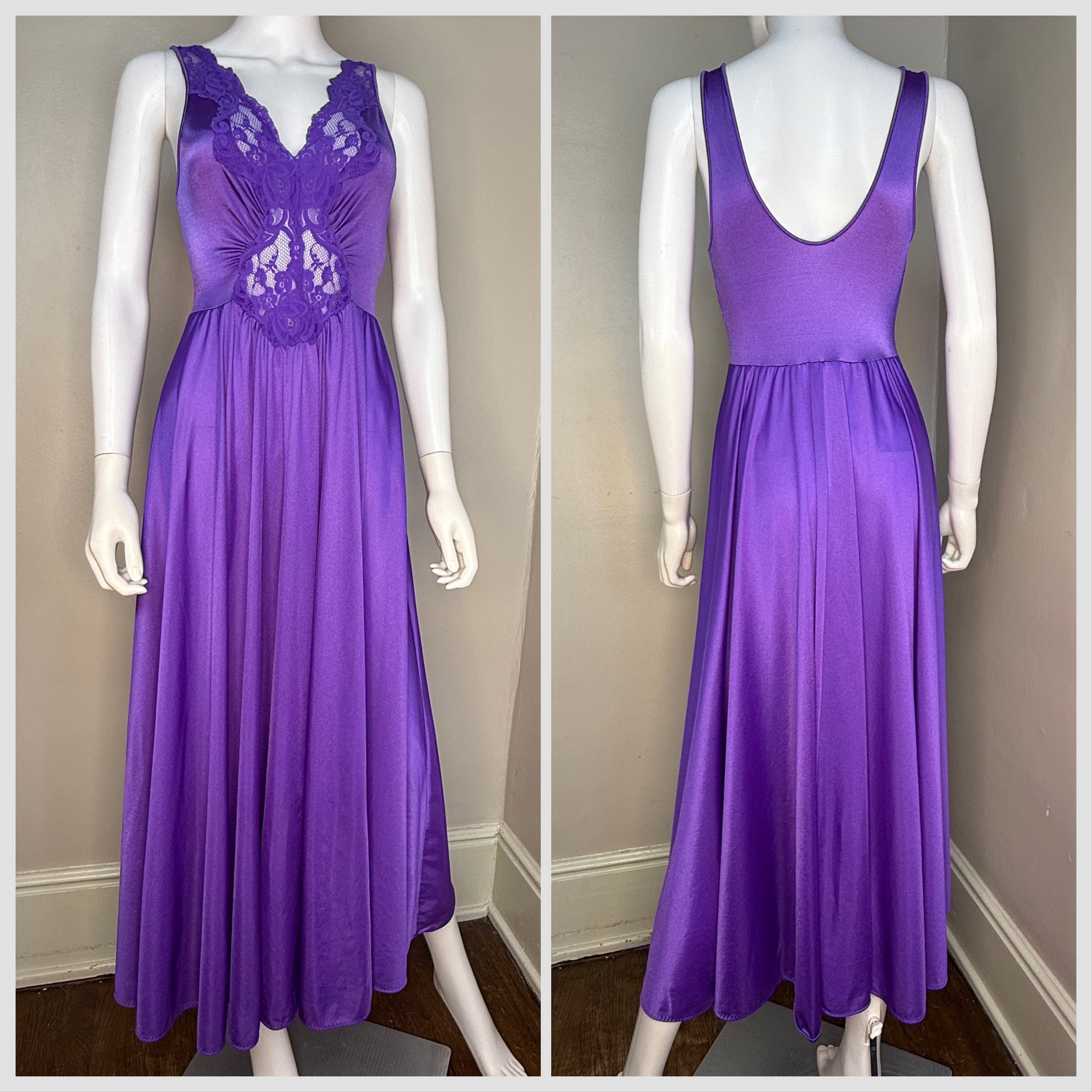 1970s Purple Nightgown with Full Sweep, Lace Cut Out Bodice, Lorraine Size XS-Small