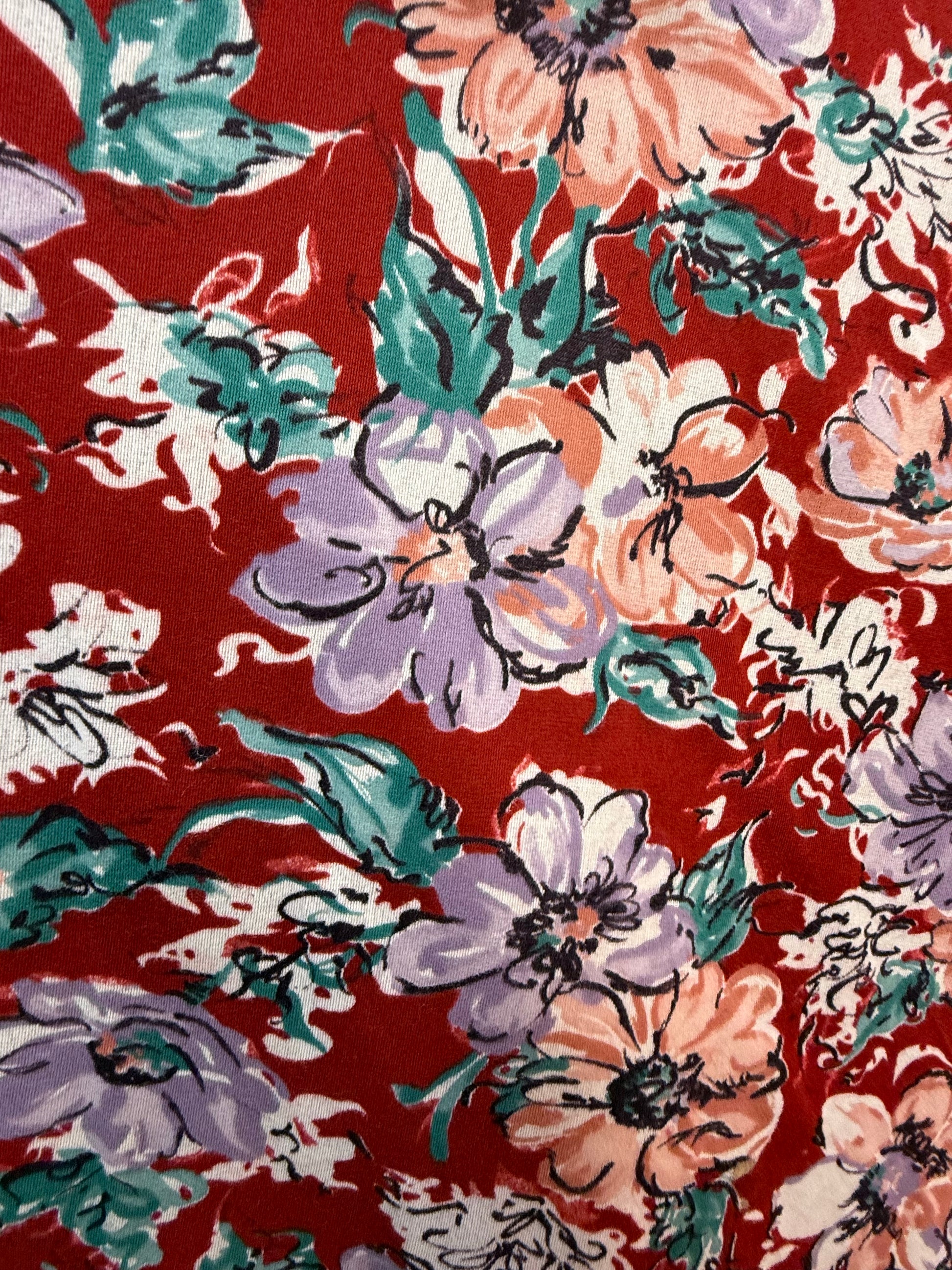 Description - Pretty rust red floral maxi dress from the 70s. It has an elastic smocked bodice in the front and the cuffs. There is elastic on the shoulders which creates a puffed sleeve. The skirt has a really full sweep. It zips up the back and there is an attached tie belt.