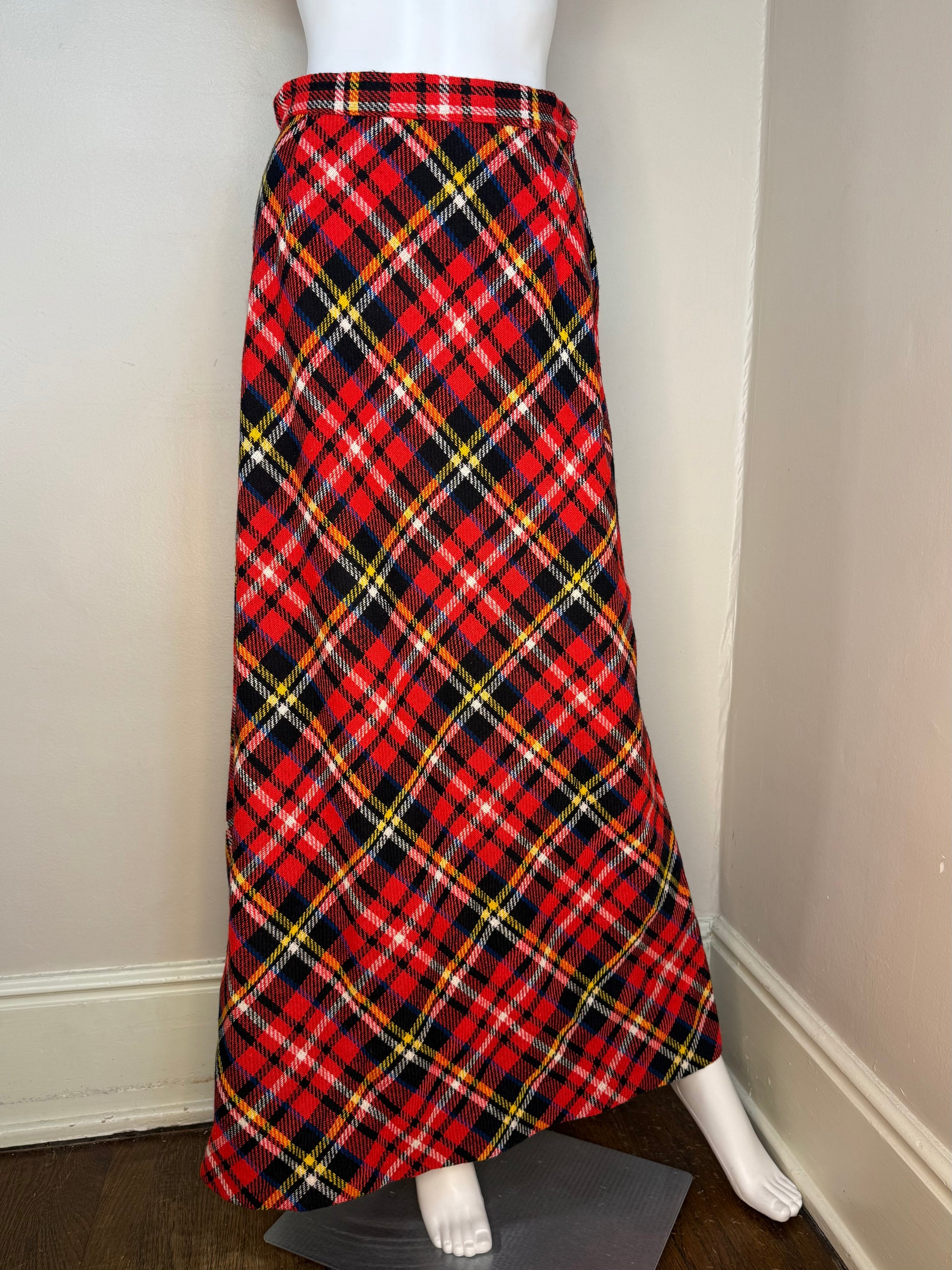 Description - Red plaid maxi skirt from the 70s. It has a side zipper.