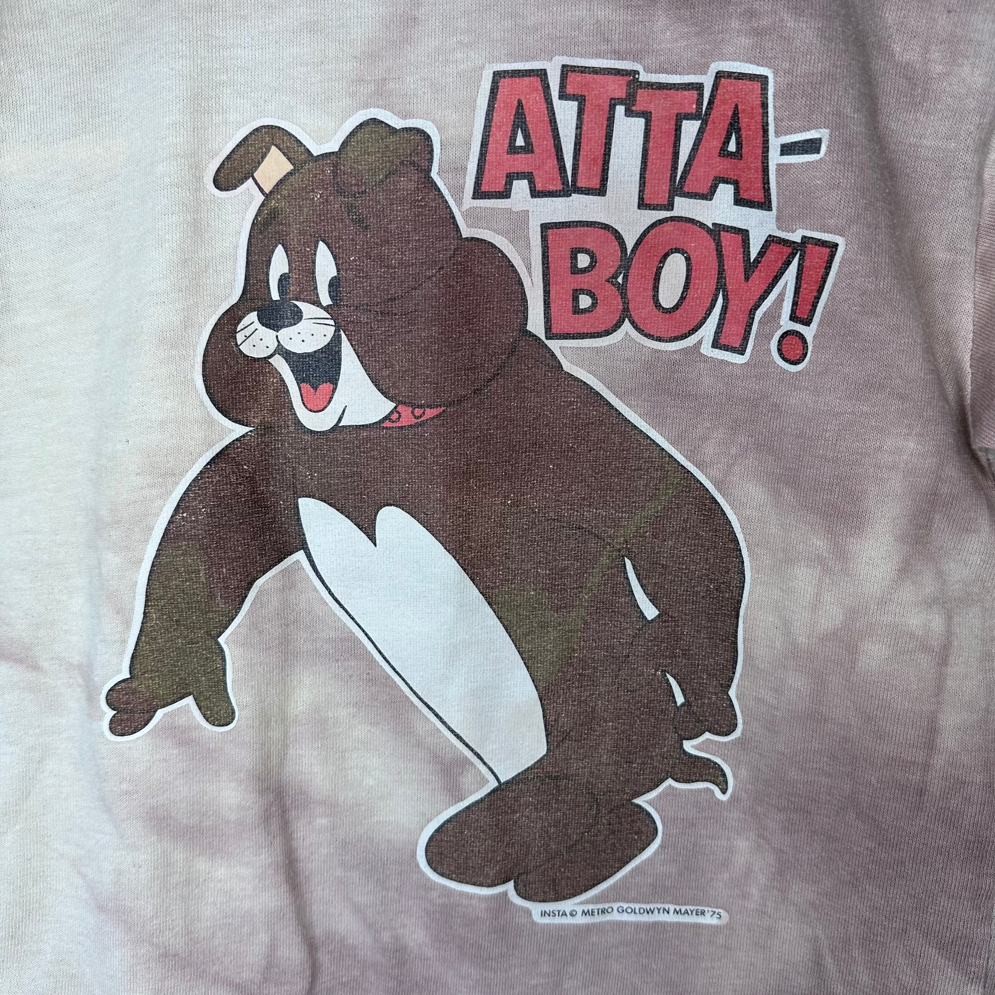 Description - 70s long sleeve tie dye tee with a print of Spike from Tom and Jerry that says Atta-Boy! The graphic is signed INSTA © METRO GOLDWYN MAYER '75