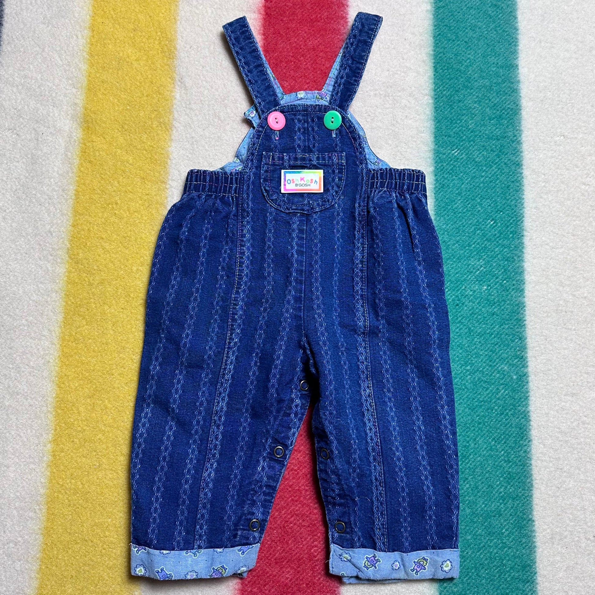 1980s/90s OshKosh Overalls, Size 12M, Stripe Denim with Neon Buttons, Dolls and Hearts Lining