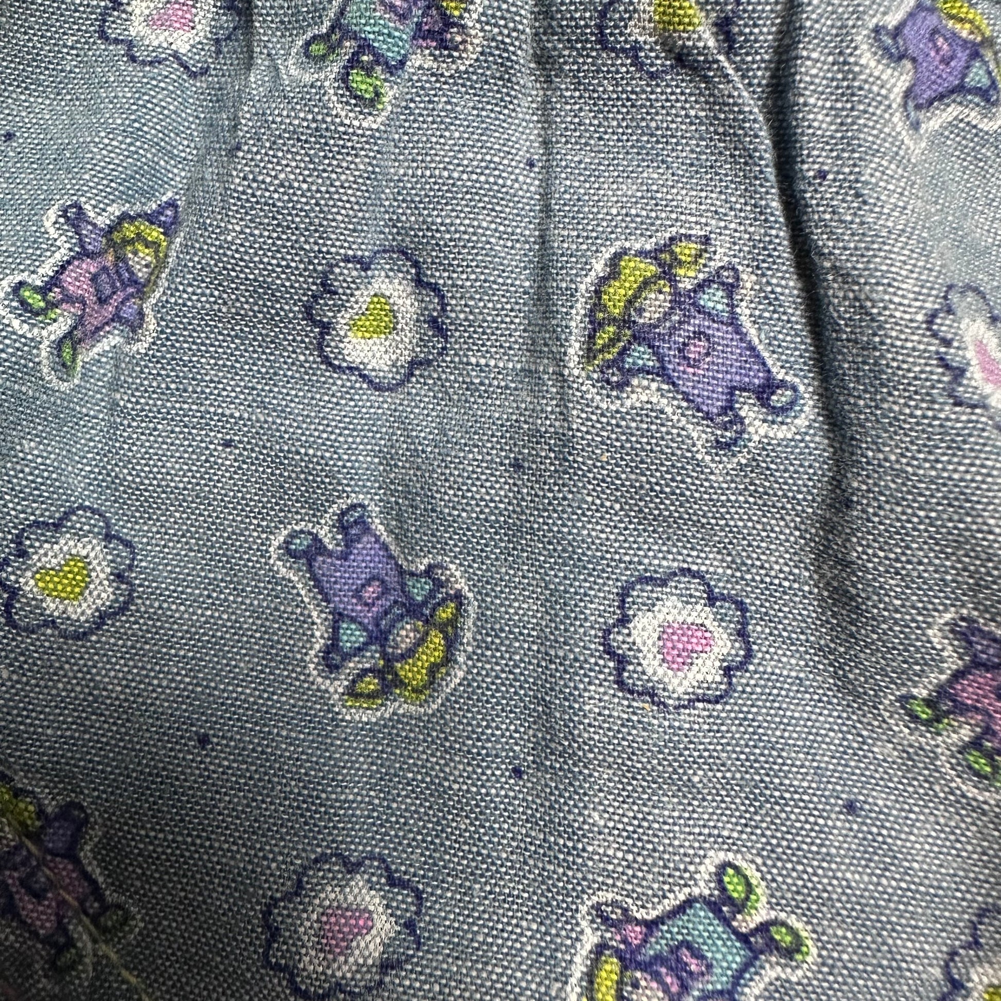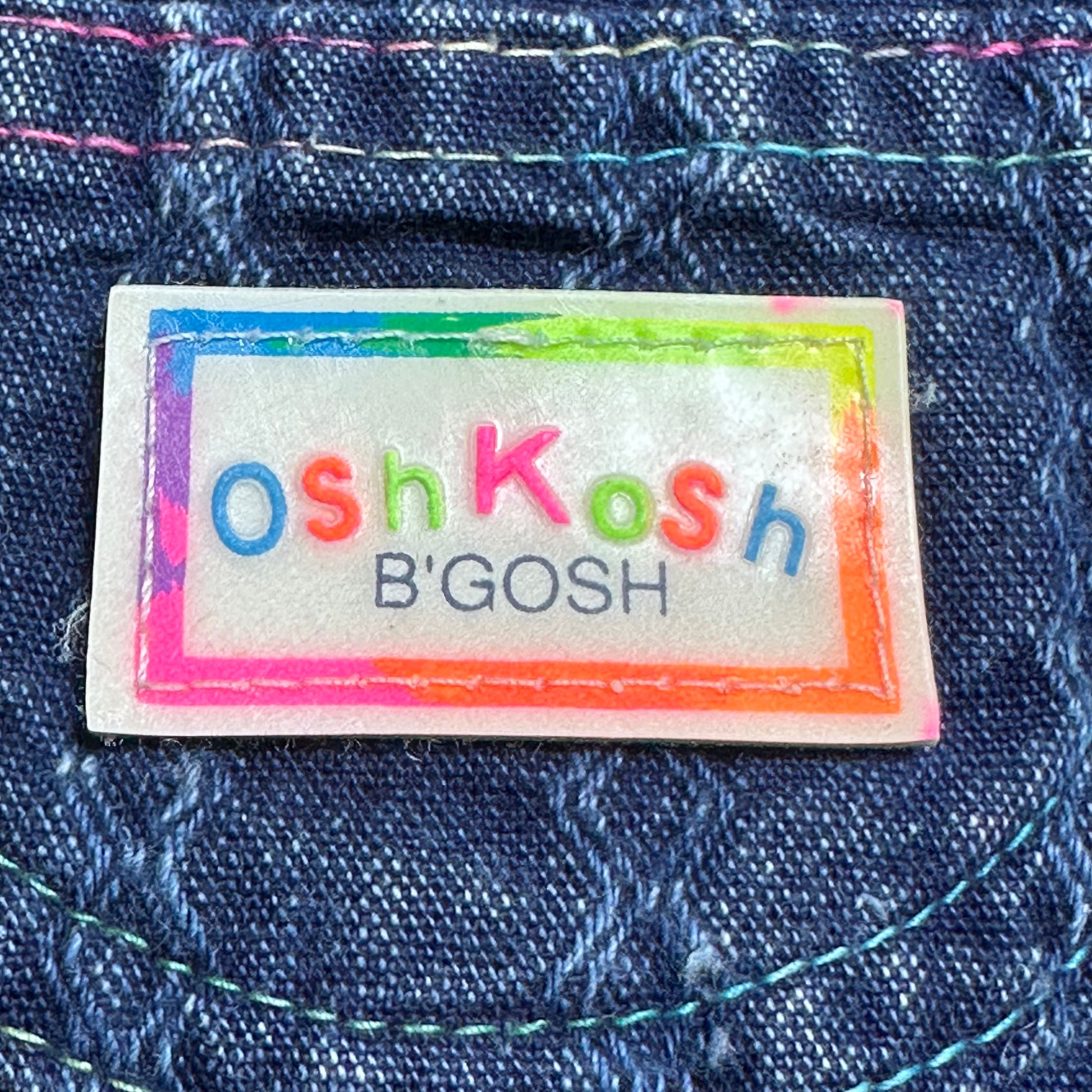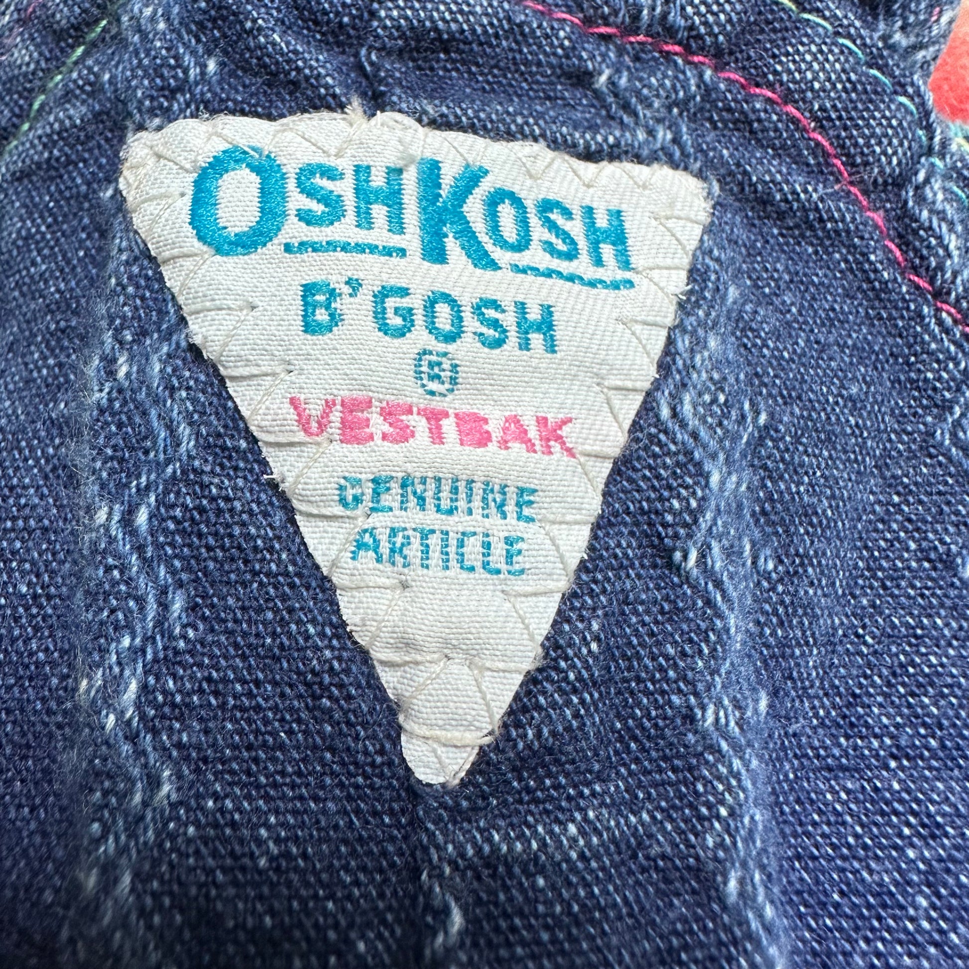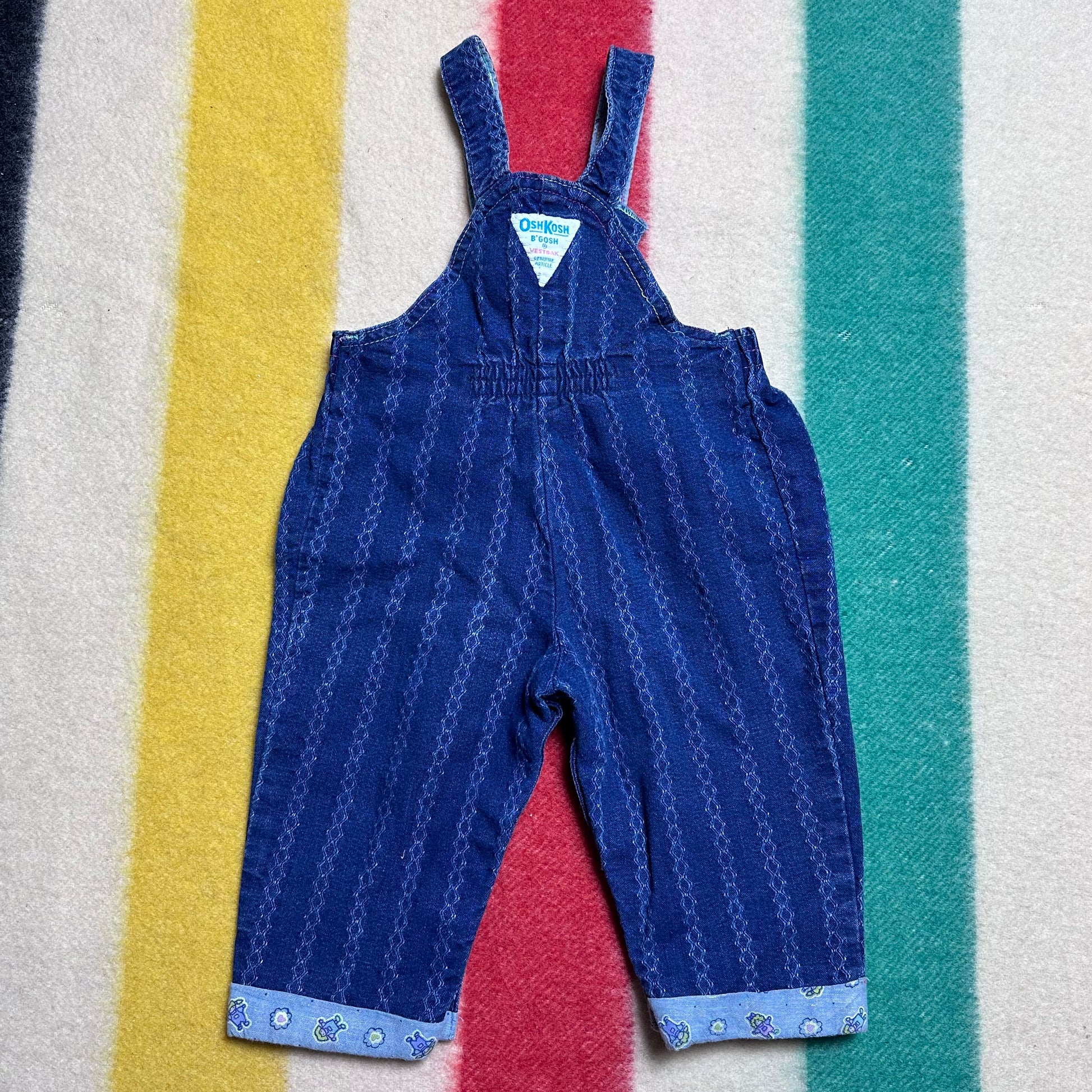 Description - OshKosh B'Gosh Vestbak Genuine Article denim overalls from the late 80s or early 90s. The denim has a stripe design woven in. The neon color label on the front is plastic. The hem is cuffed with a cute printed fabric that has dolls and hearts. The bodice is also lined in this fabric. The waist has elastic in the sides and center back.