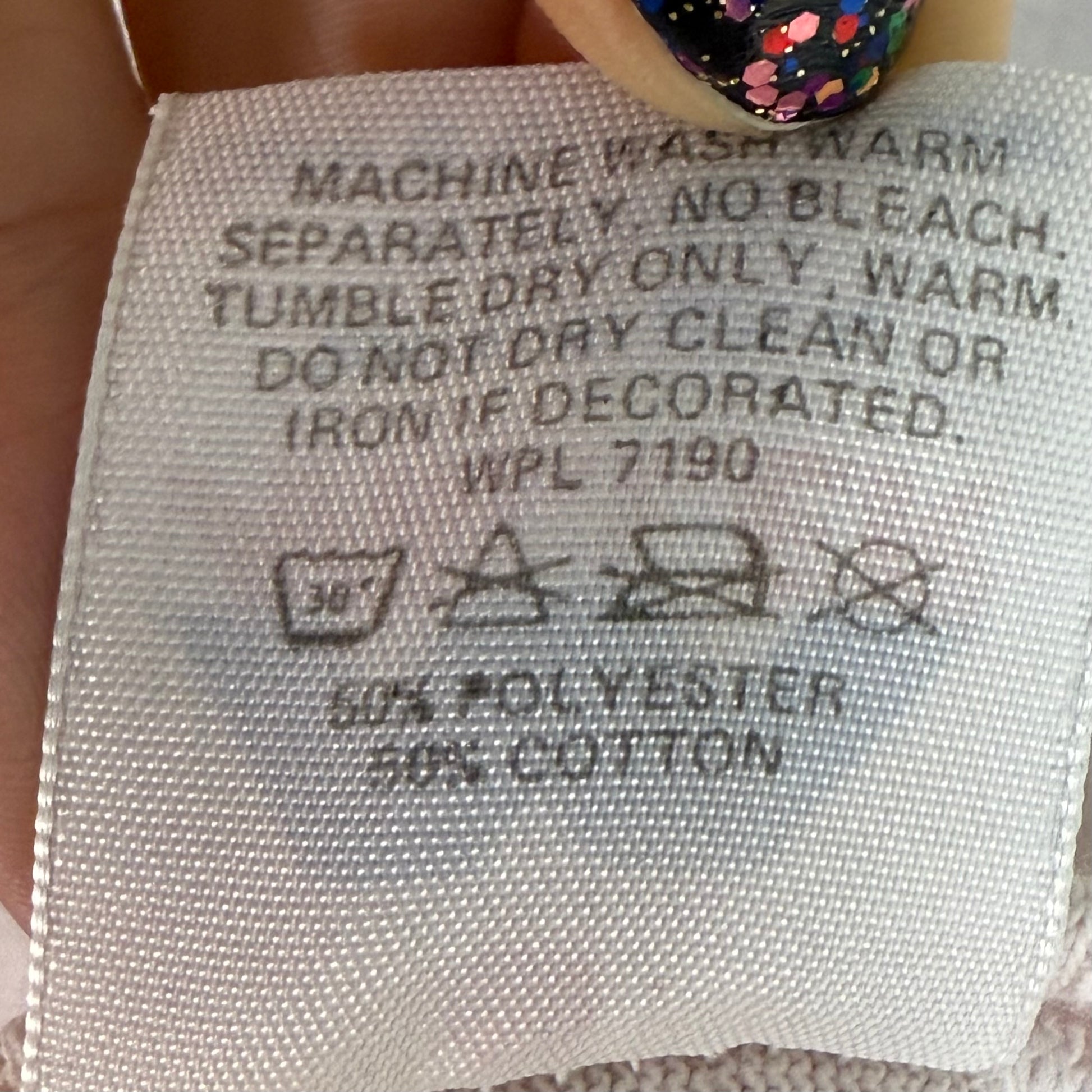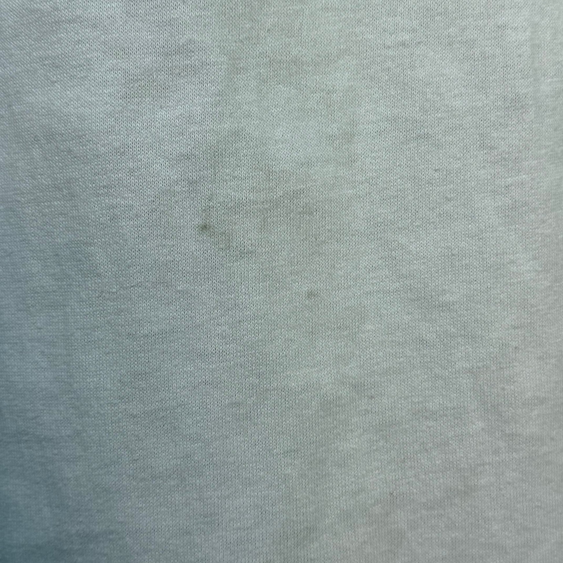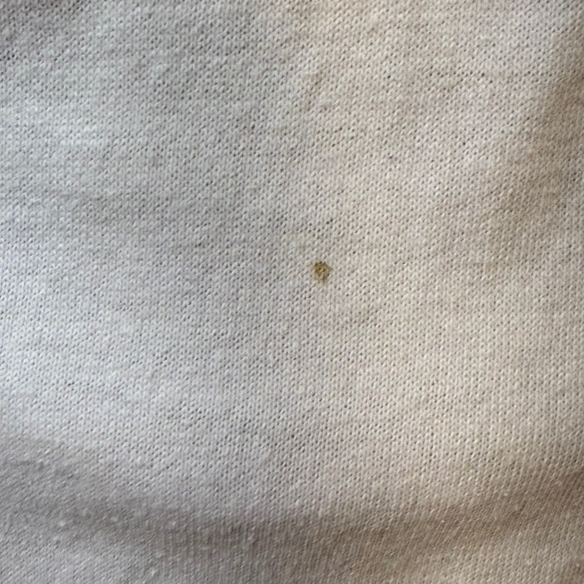 Condition - The shirt has a very slight pink tint. There is a faint stain on the back and a pin size spot on the side.