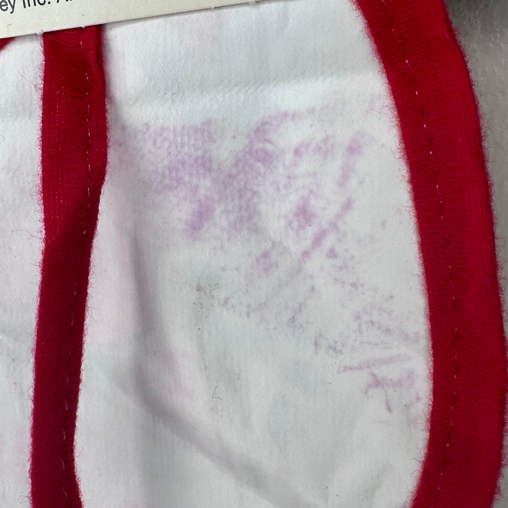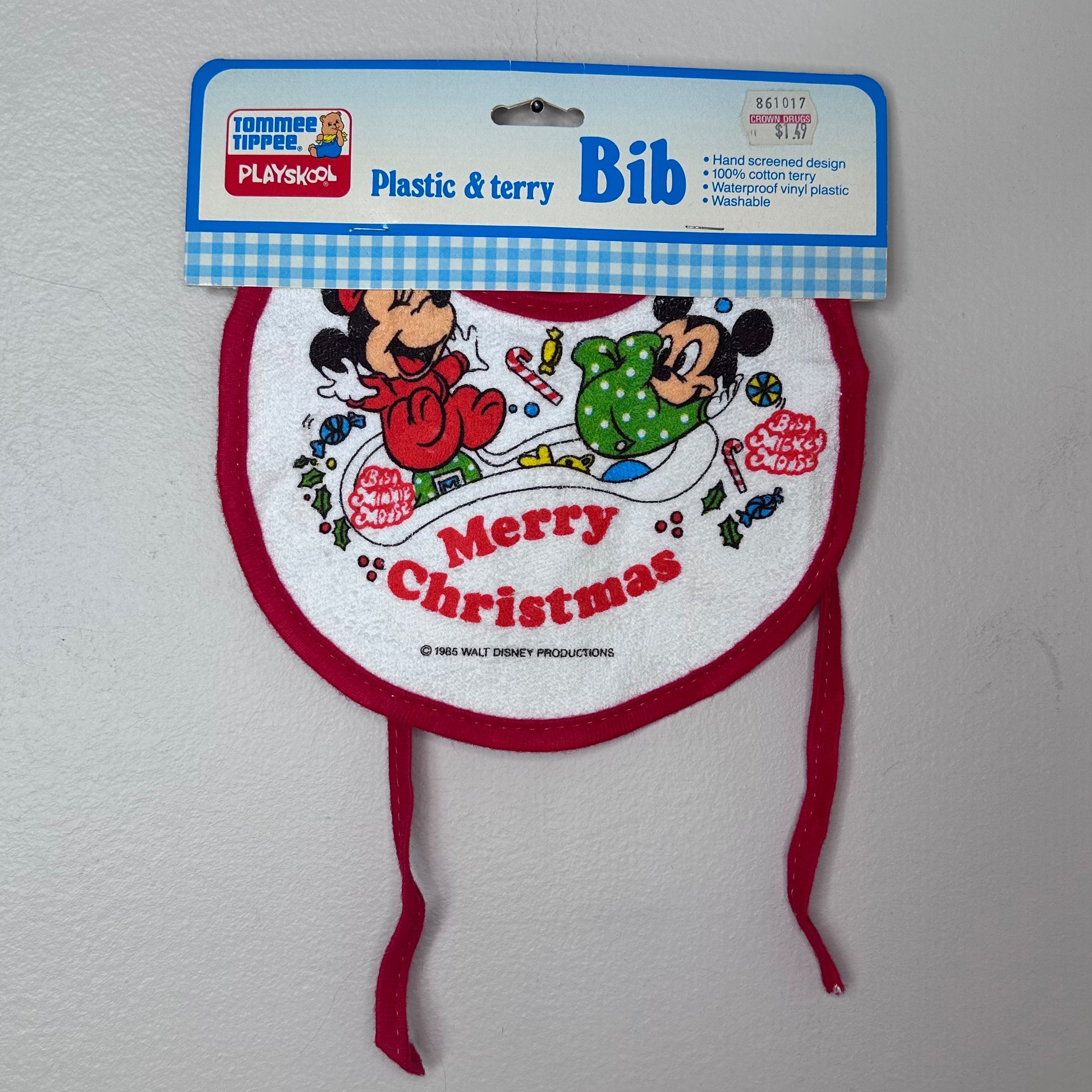 Description - Adorable deadstock Christmas bib with Baby Minnie Mouse and Baby Mickey Mouse dated ©1985 Walt Disney Productions. It has ties on both sides.