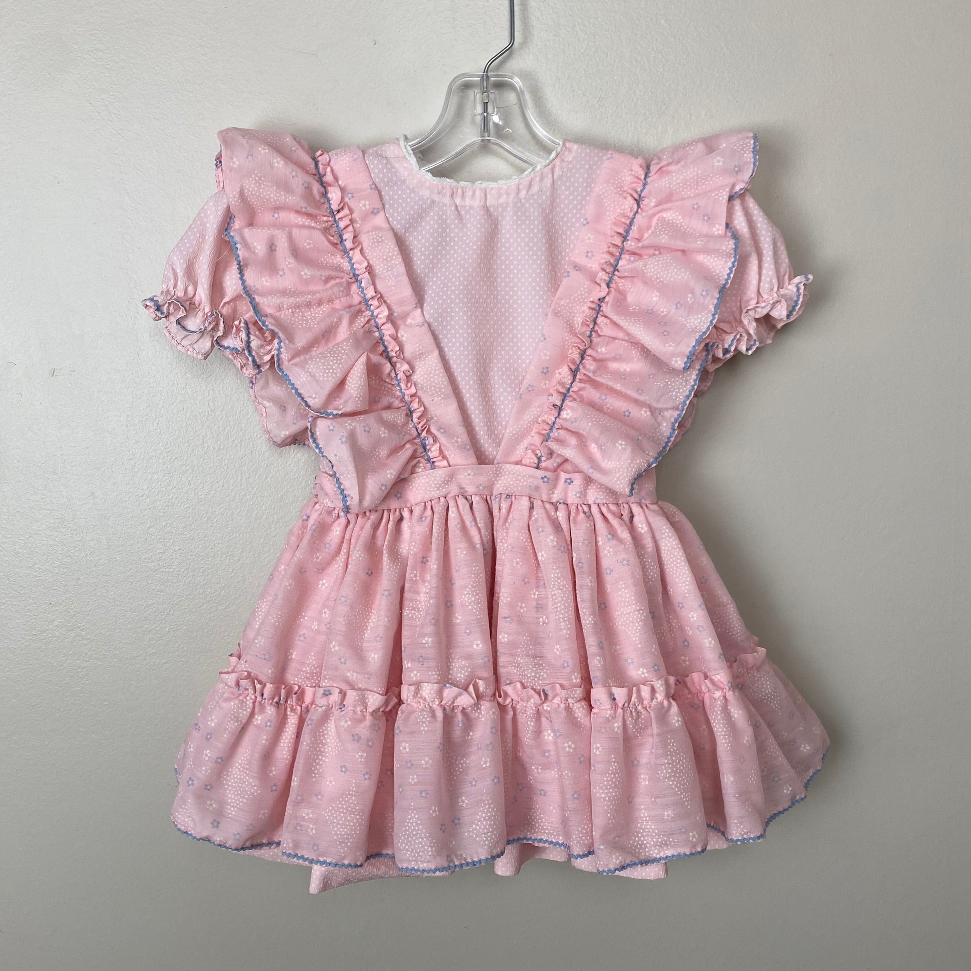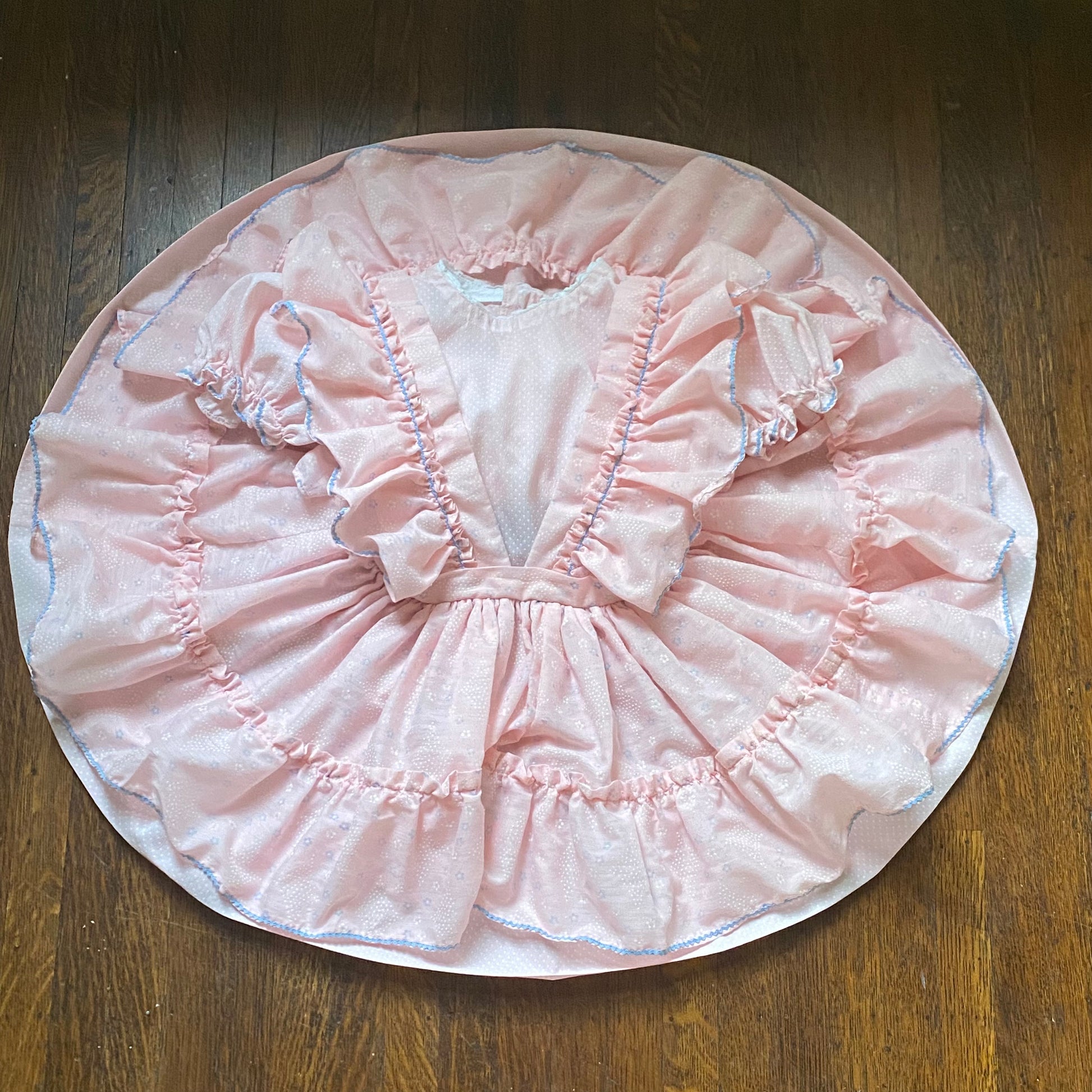 Description - Adorable frilly handmade pinafore style dress most likely from the 80s. It's made of layers of vintage swiss dot and flocked florals. It looks very similar to Martha Miniatures dresses from that time period. They even used the same heart shaped buttons! It buttons up the back and has a very full skirt perfect for twirling.