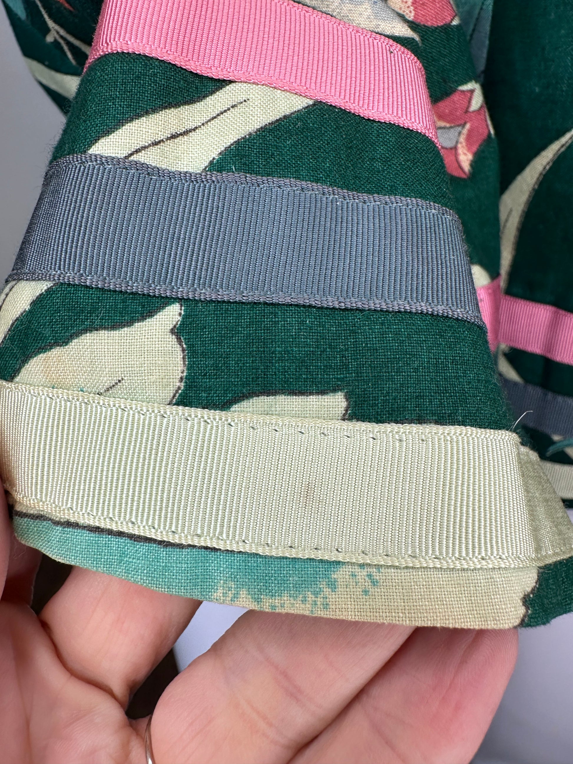 Description - Deep green floral sundress from the early 80s with spaghetti straps. There is contrasting ribbon trim on the hem of the skirt. It zips up the back and there are 2 inseam pockets.