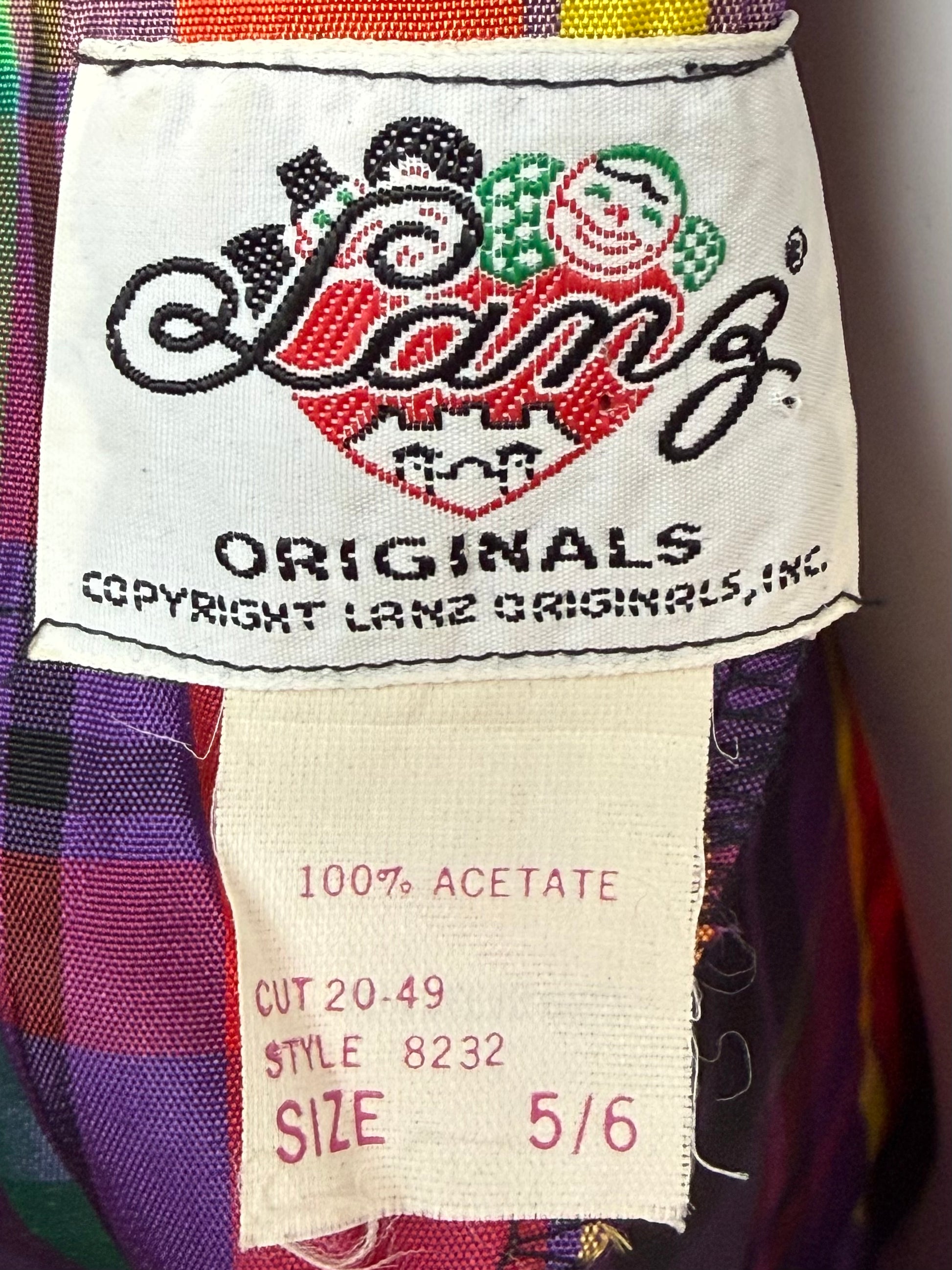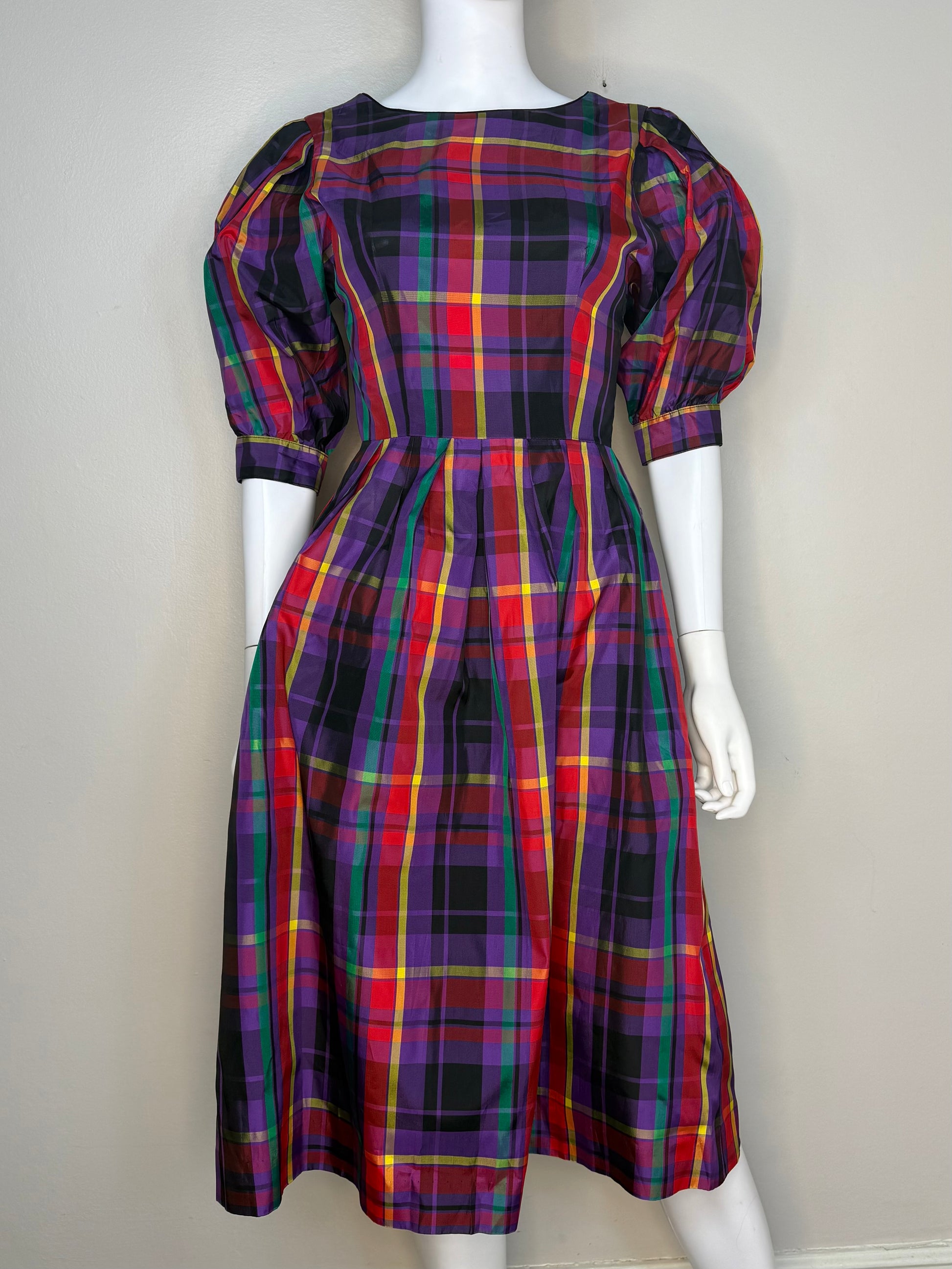 1980s Jewel Tone Plaid Taffeta Dress with Huge Puffed Sleeves, Lanz Size X-Small