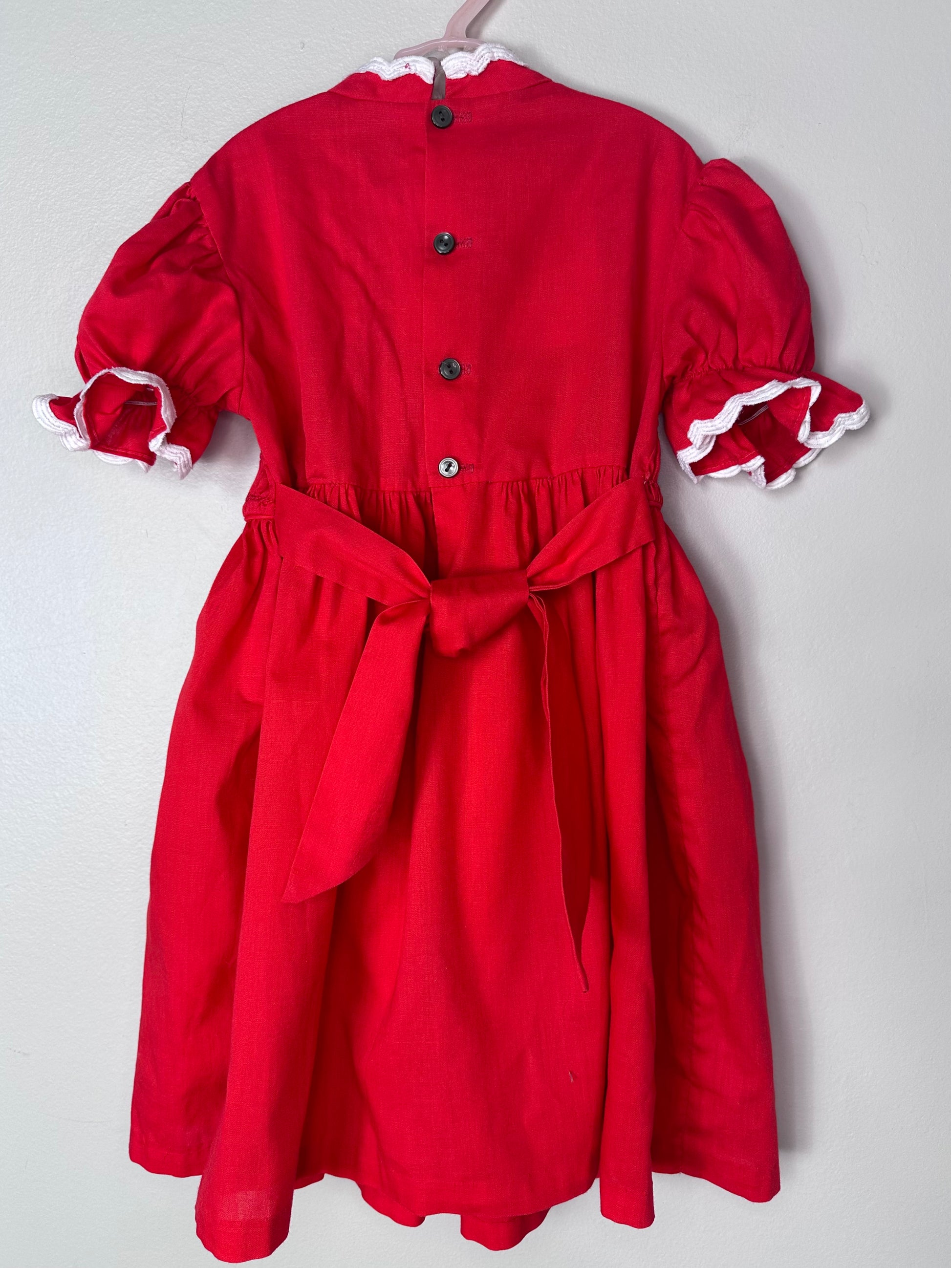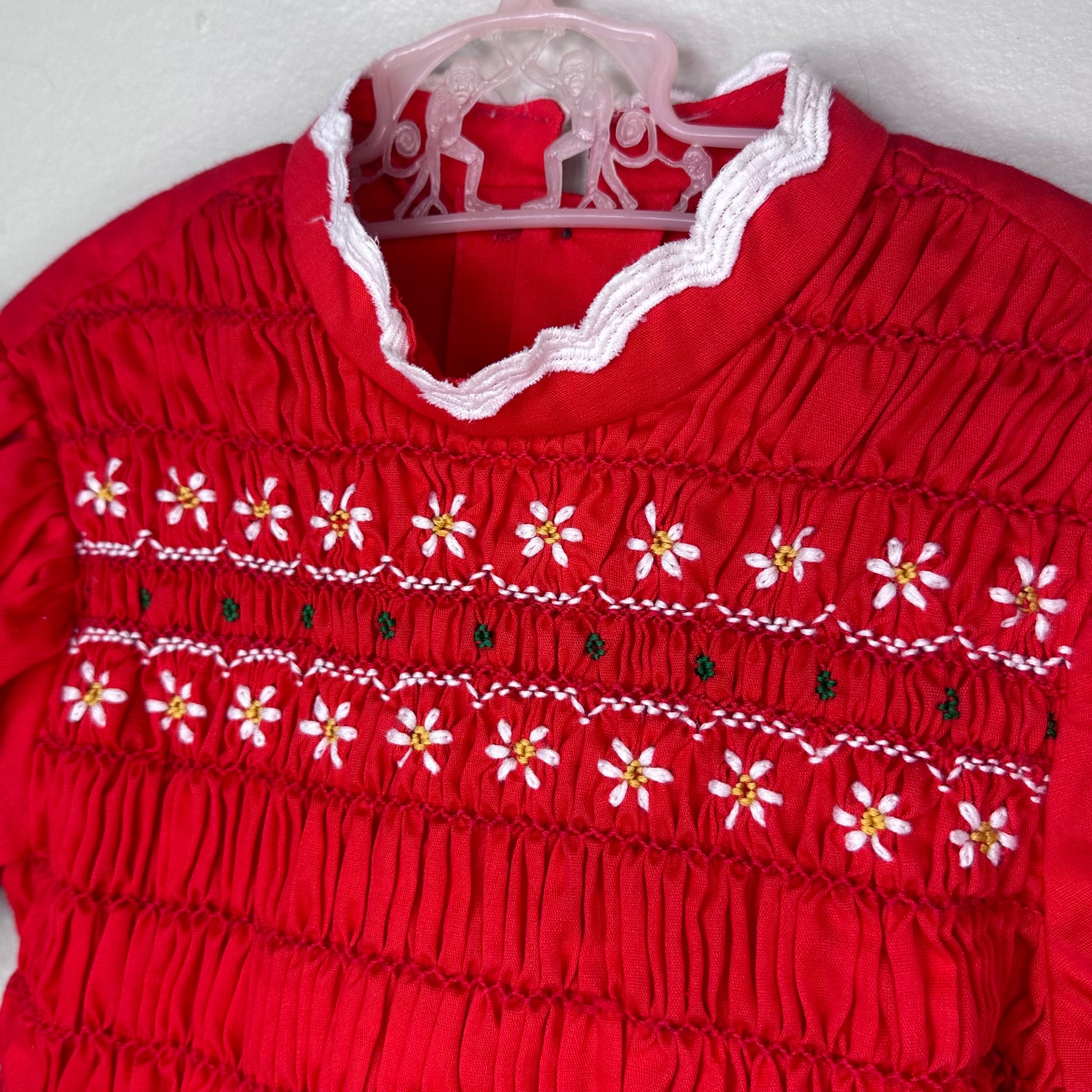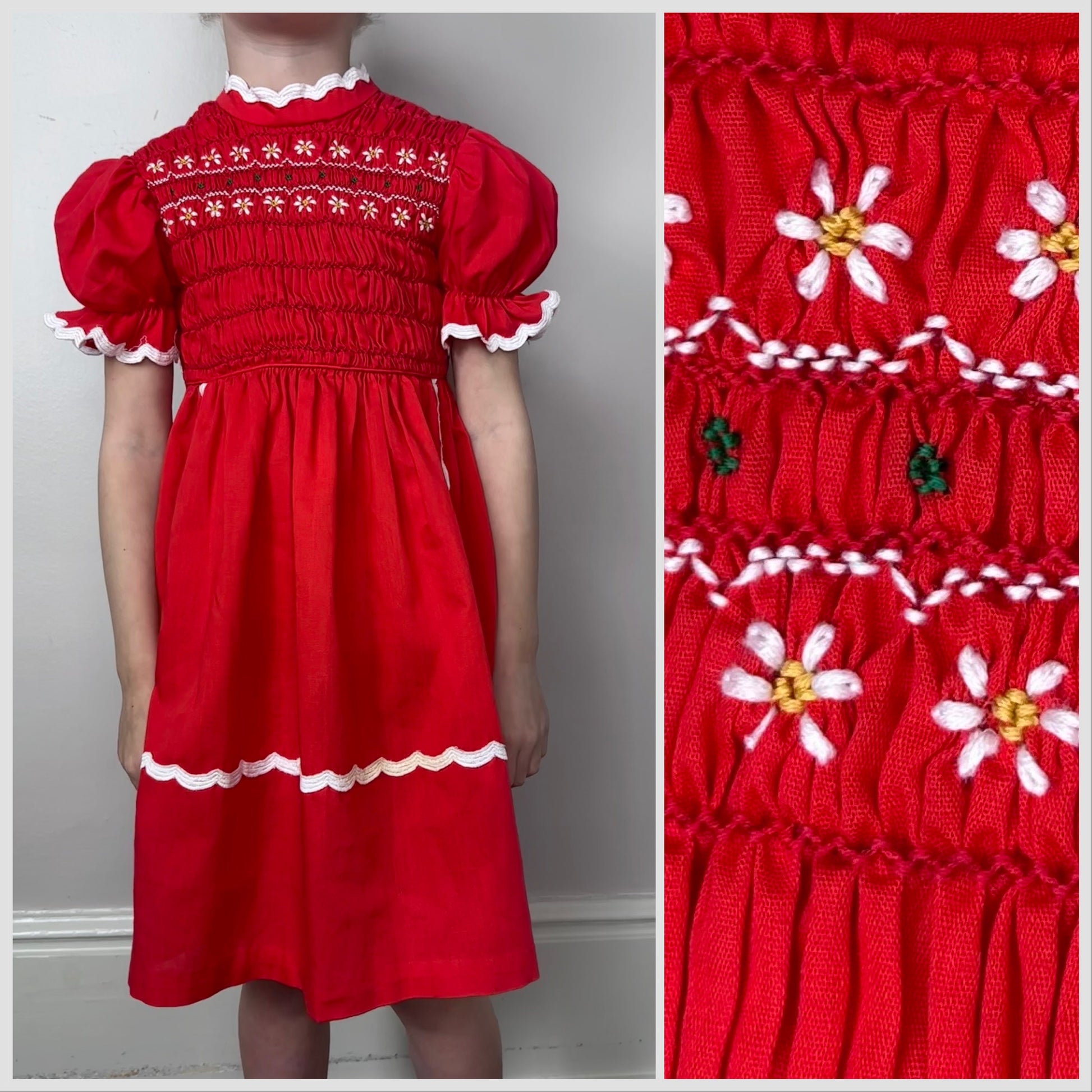 Description - Adorable late 70s or early 80s red short puff sleeve smocked dress with white rick rack trim. The smocking design is white daisies. It buttons up the back and has an attached tie belt.