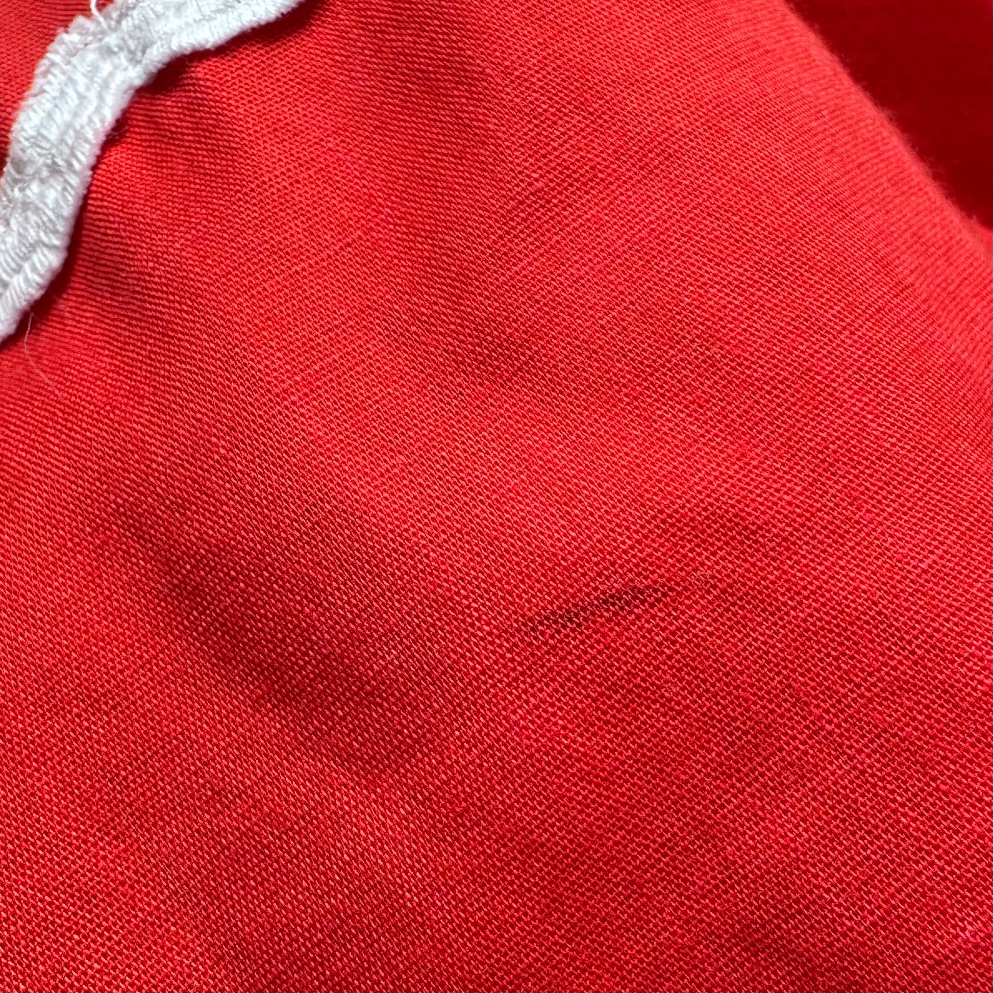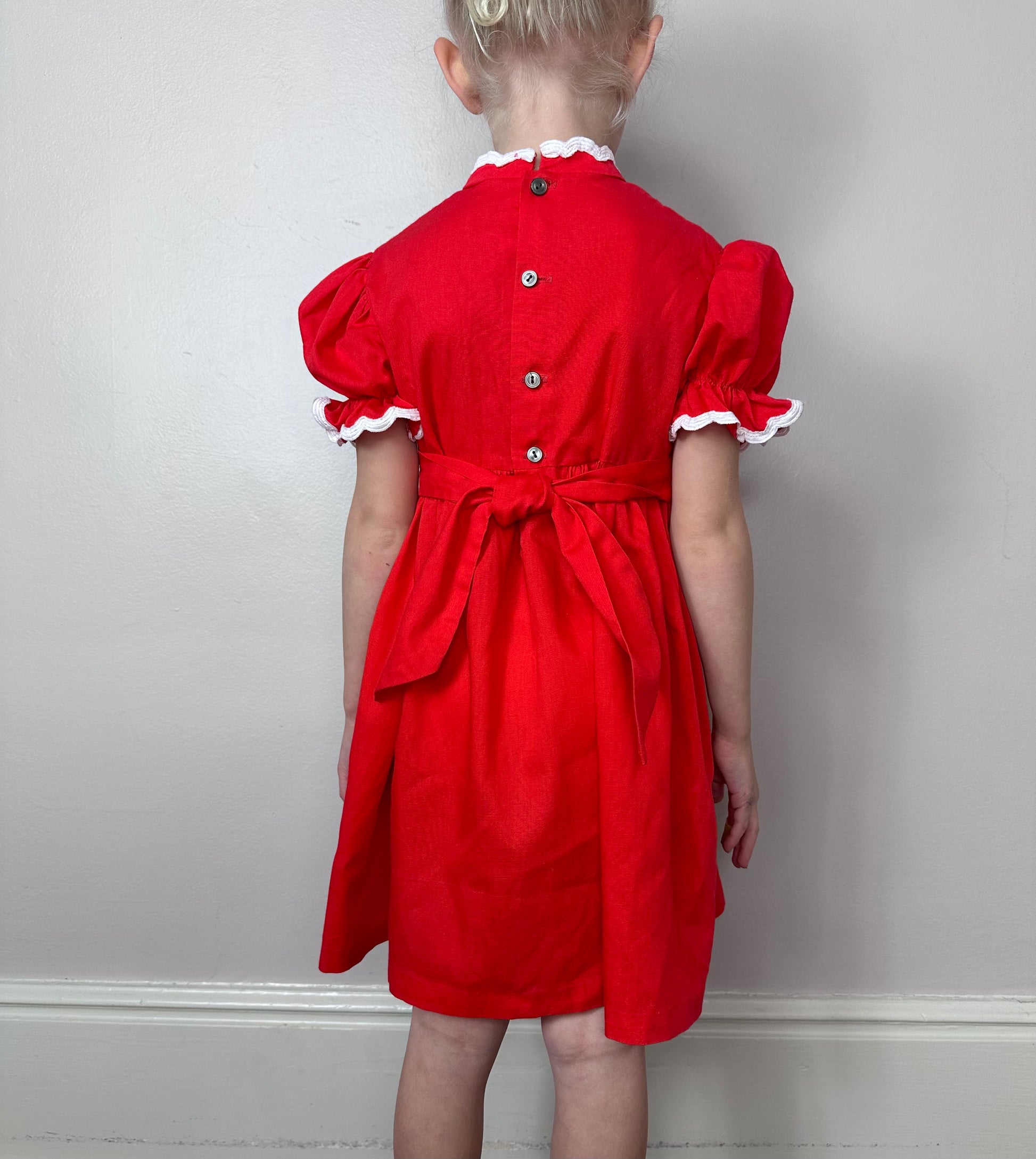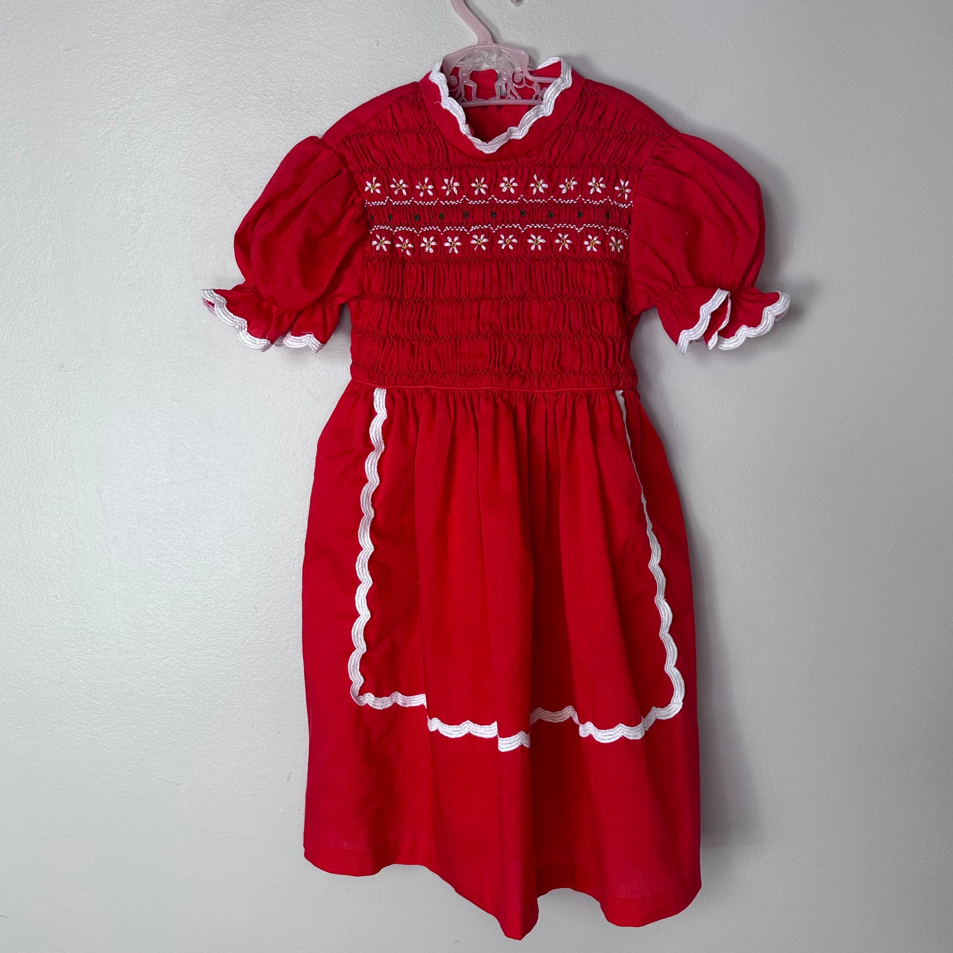 Description - Adorable late 70s or early 80s red short puff sleeve smocked dress with white rick rack trim. The smocking design is white daisies. It buttons up the back and has an attached tie belt.