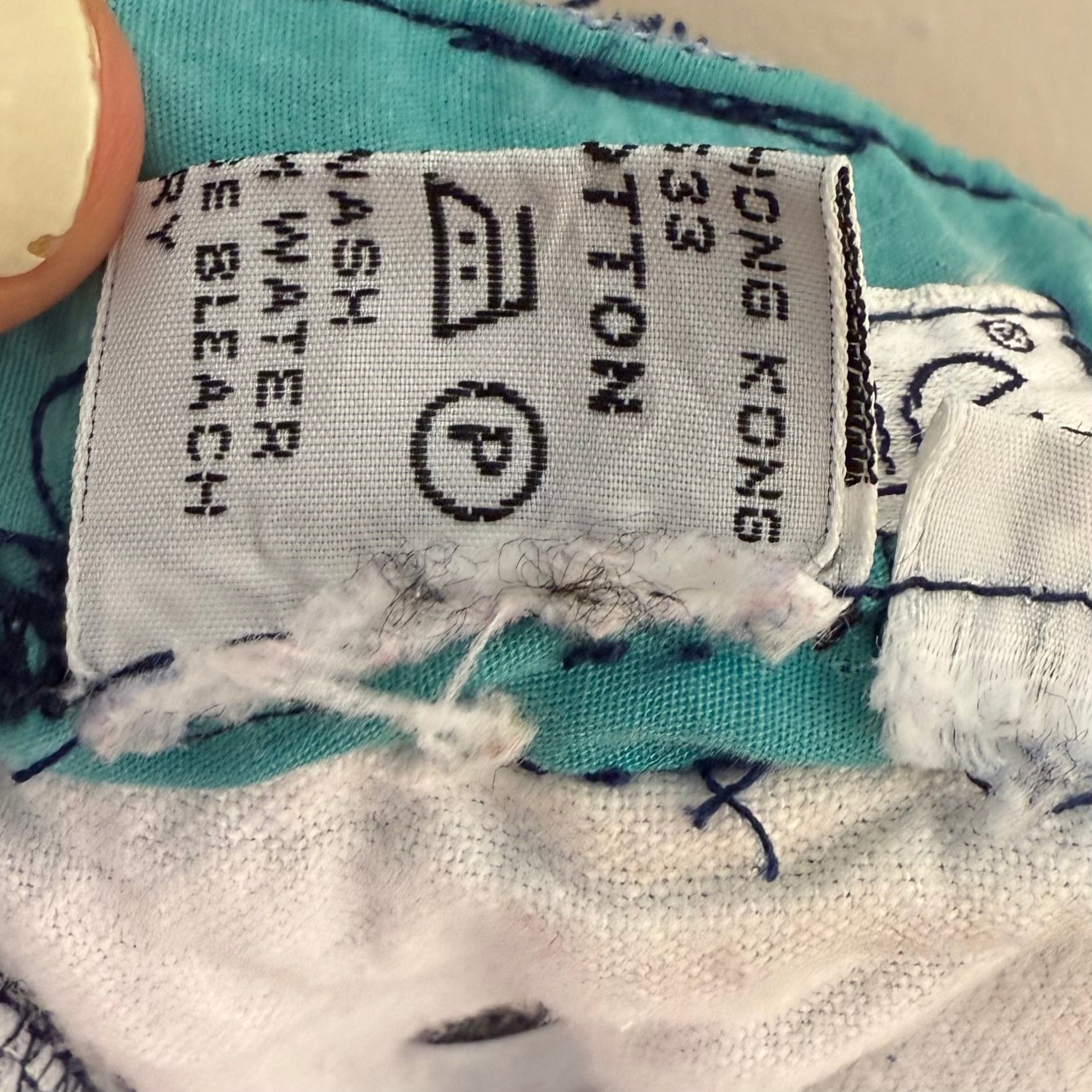 Description - Tapered leg blue jeans from the 80s that have a waffle weave texture. They have snap flaps on all 4 pockets and the fly.