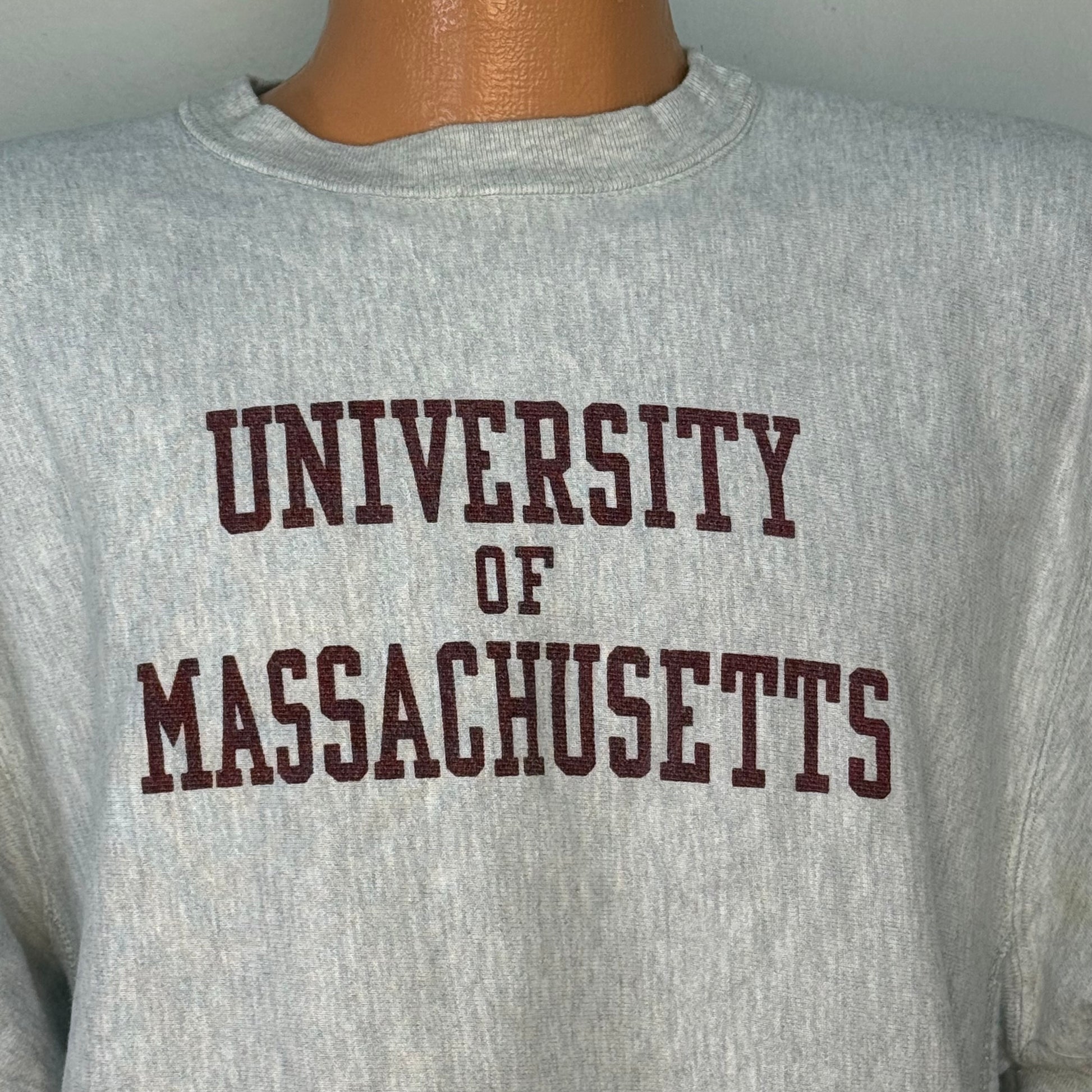Description - Heather grey University of Massachusetts reverse weave crewneck sweatshirt from the 80s.