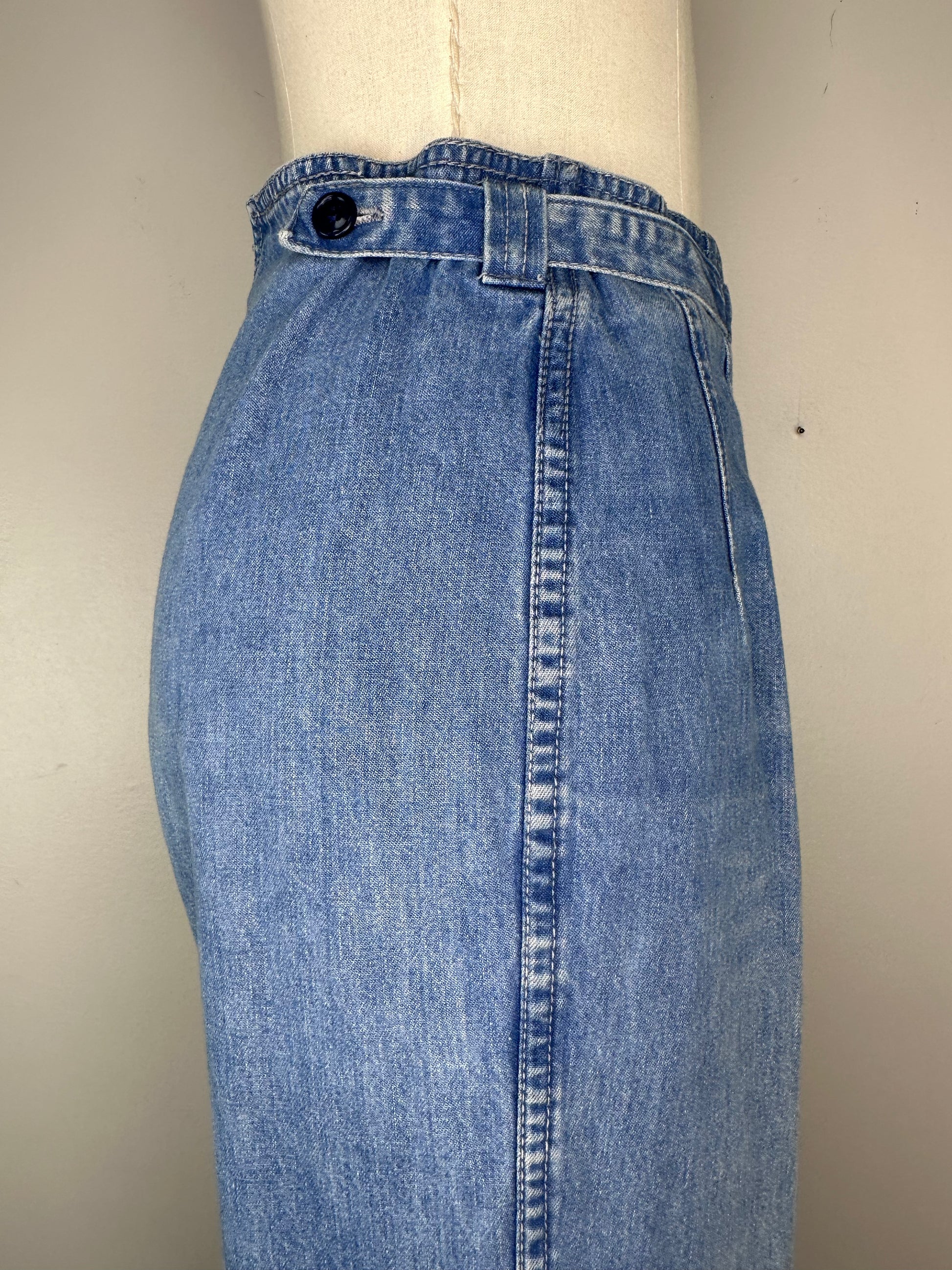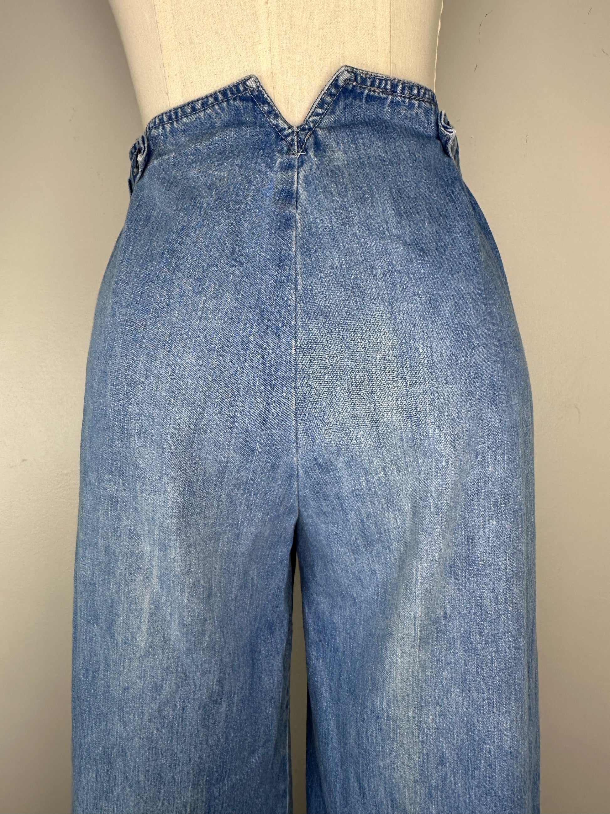 Description - High waisted wide leg with a slight flare jeans from the early 80s (possibly very late 70s). There are straps on the sides with 2 button options. There is a notch in the center of the back of the waist. These do not have pockets.