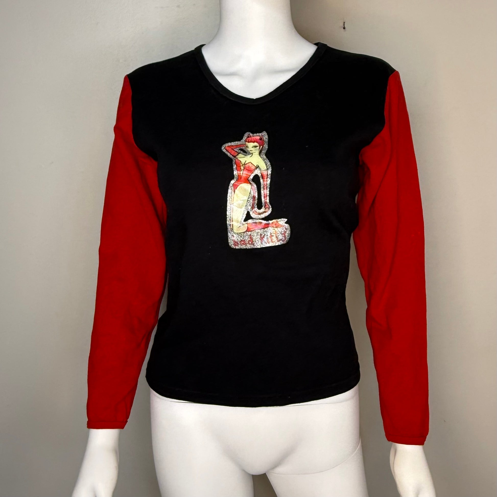 1990s/Y2K Bad Kitty Devil Girl Long Sleeve T-Shirt, Miss Anne Thrope by Archaic Smile Size S/M, Glitter