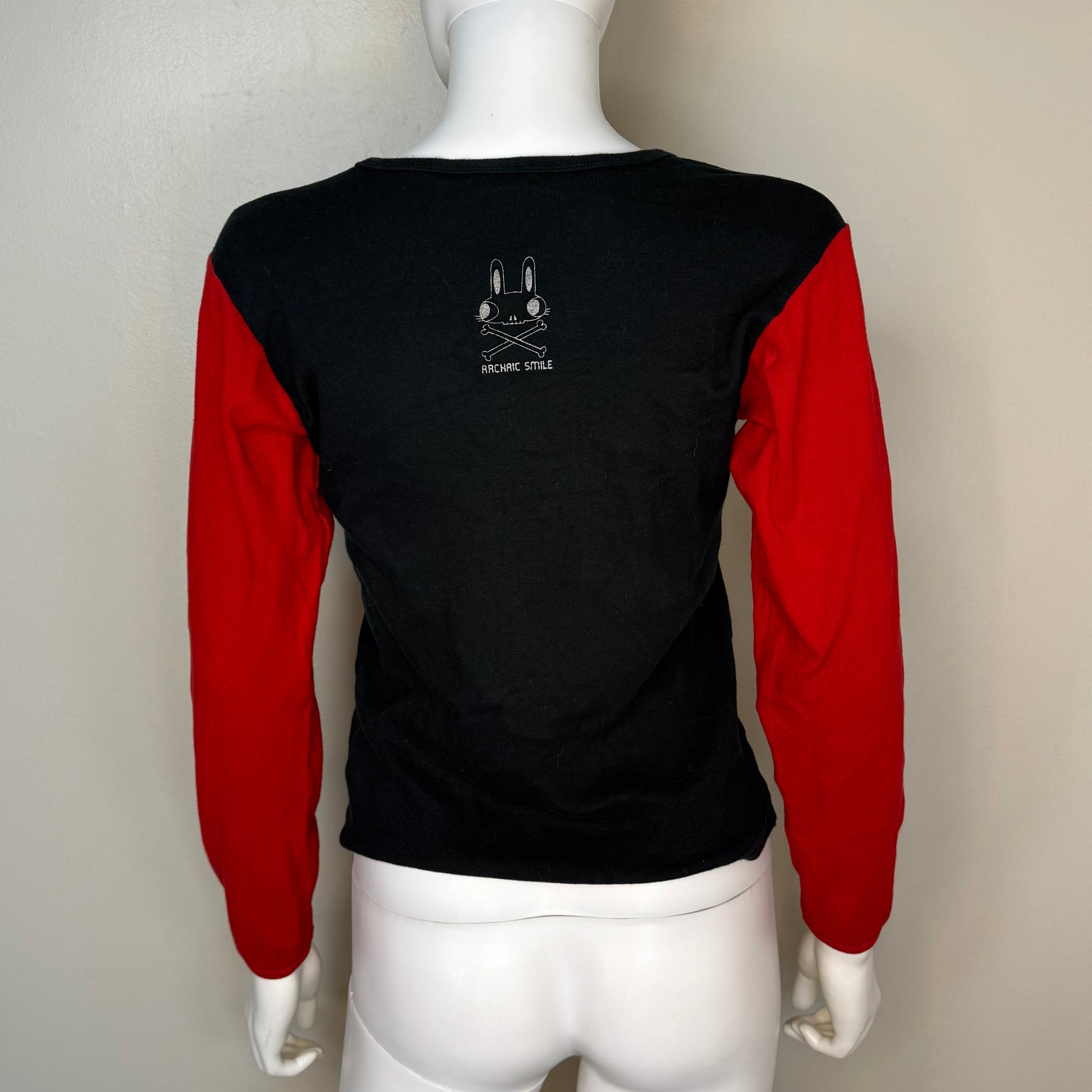 Description - Black and red color block long sleeve tee from the late 90s or early 2000s wiht a cool devil girl glitter graphic that says Bad Kitty on the front and the Archaic Smile bunny and cross bones logo on the back.