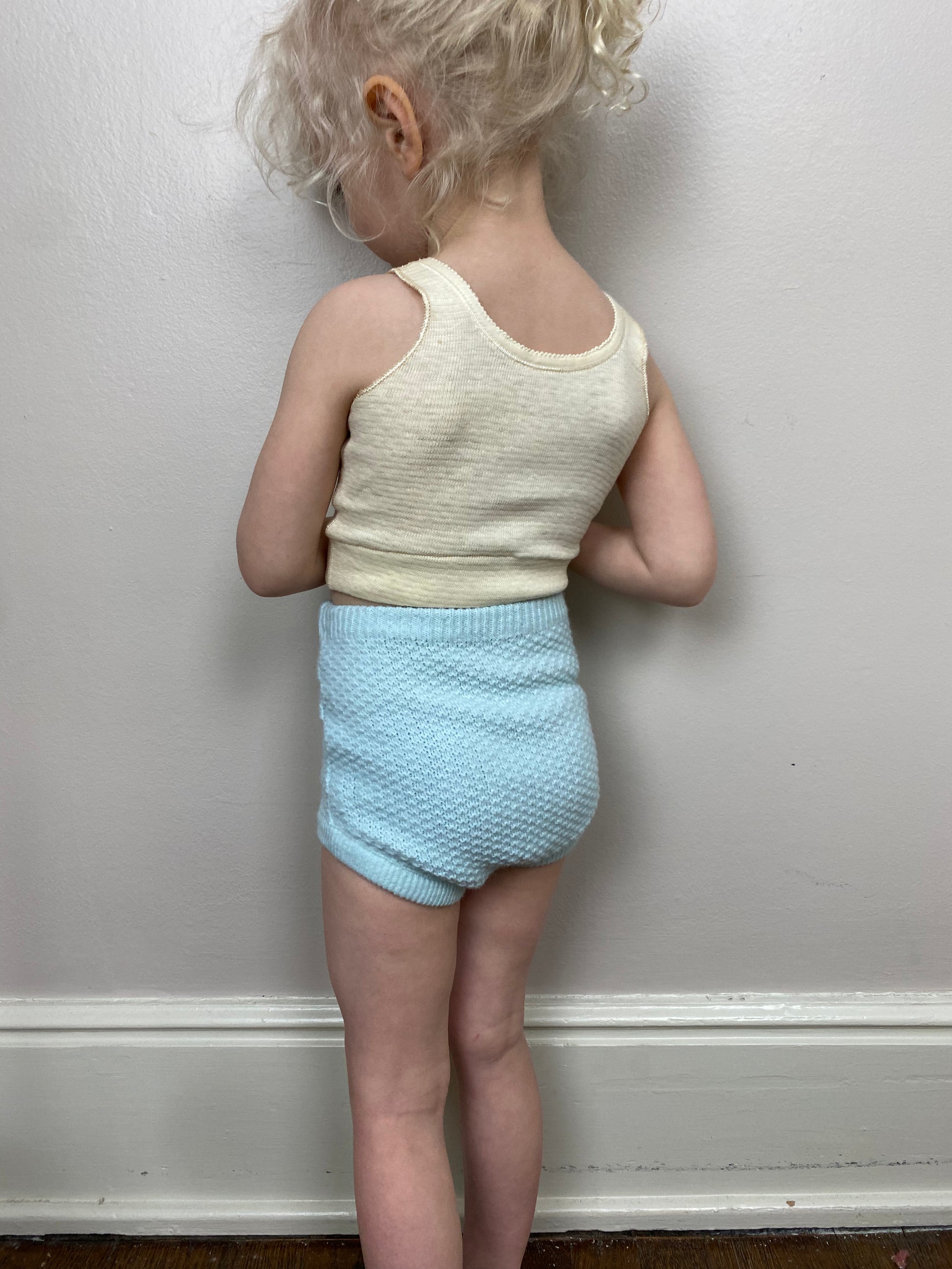 Description - Soft knitted bloomer shorts or diaper cover. My daughter is 4 and these fit her well as high waisted brief shorts.