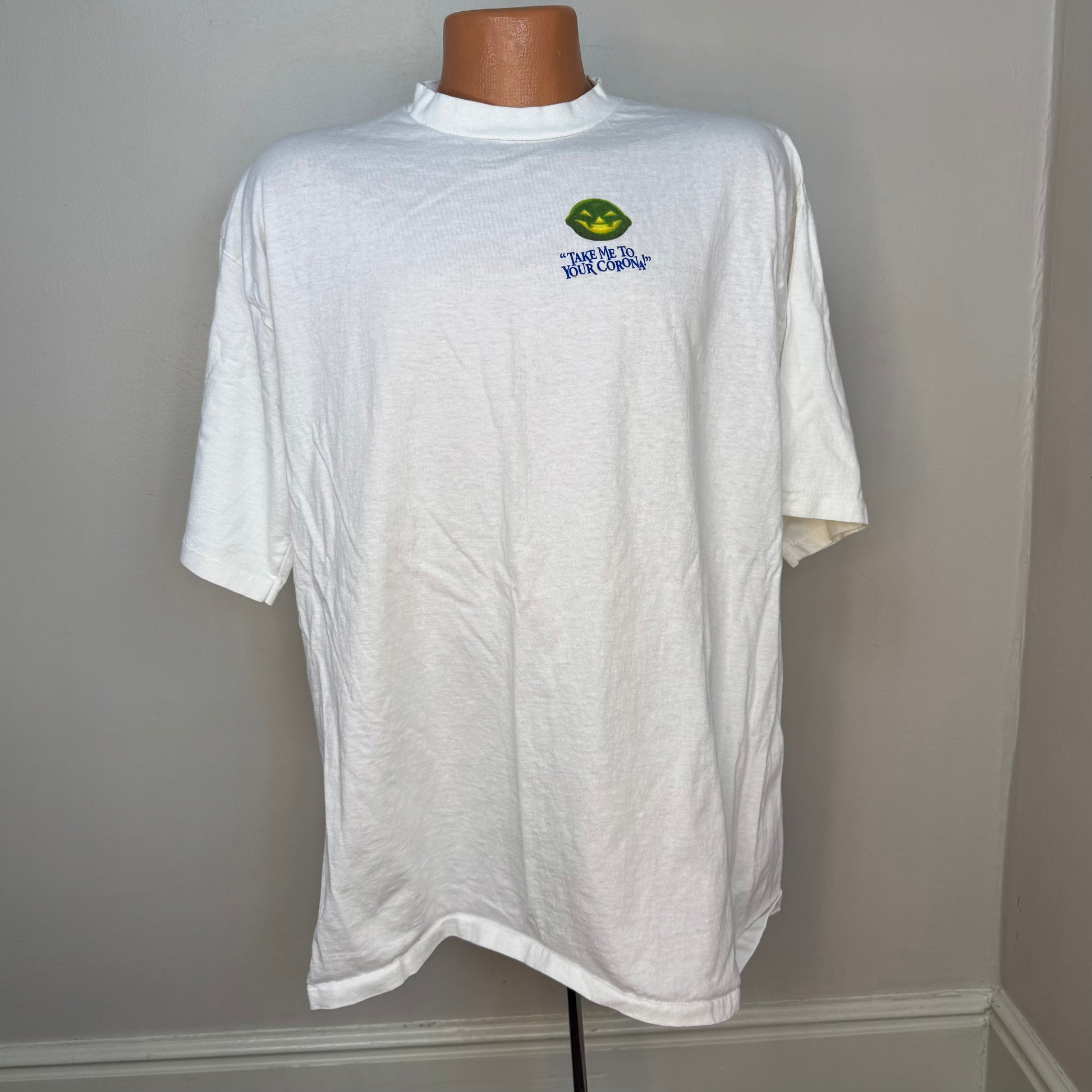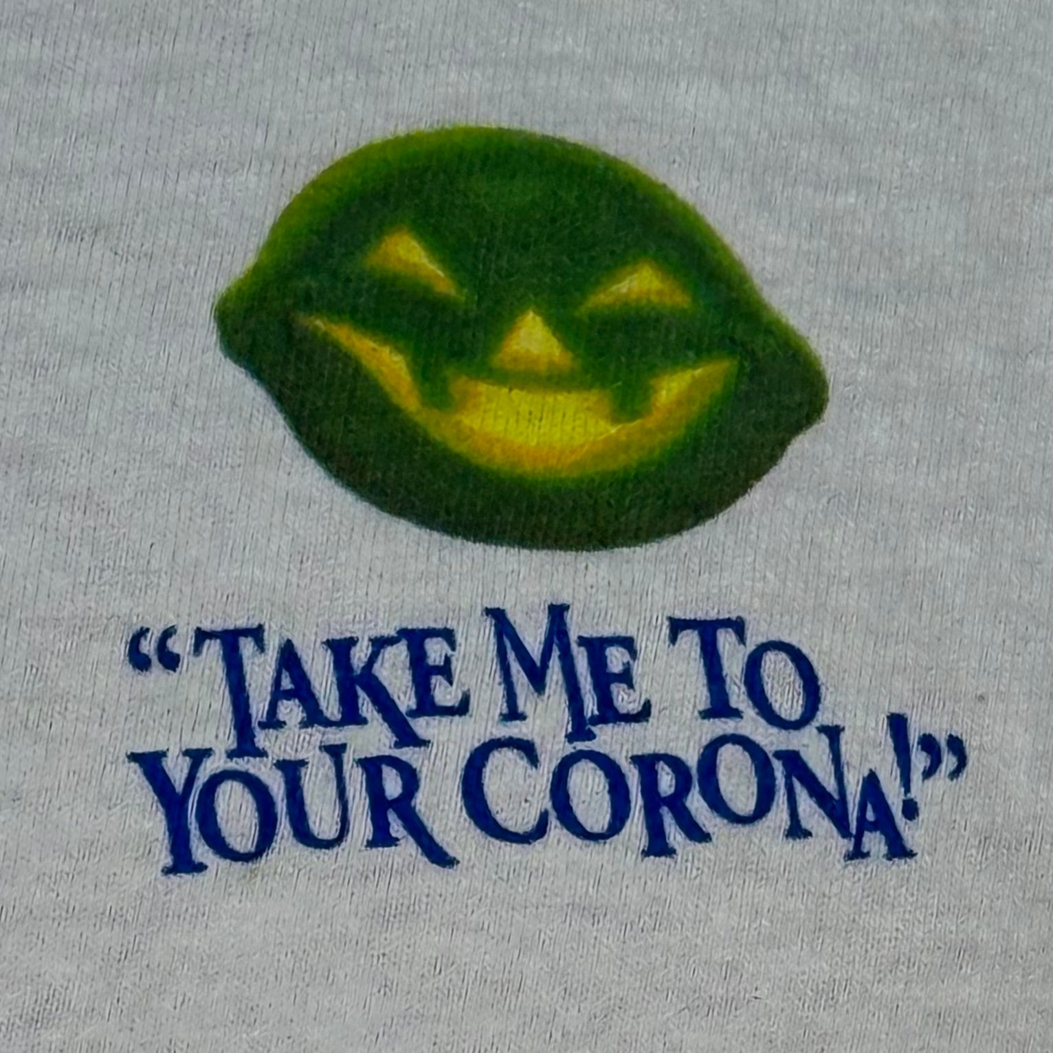 Description - Early 2000s Corona beer single stitch promo tee with a lime-o-lantern on the front that says "Take me to your Corona" On the back there is a spoof of the Twilight Zone and the Outer Limits - The Outer Lime Zone with bottles of Corona.